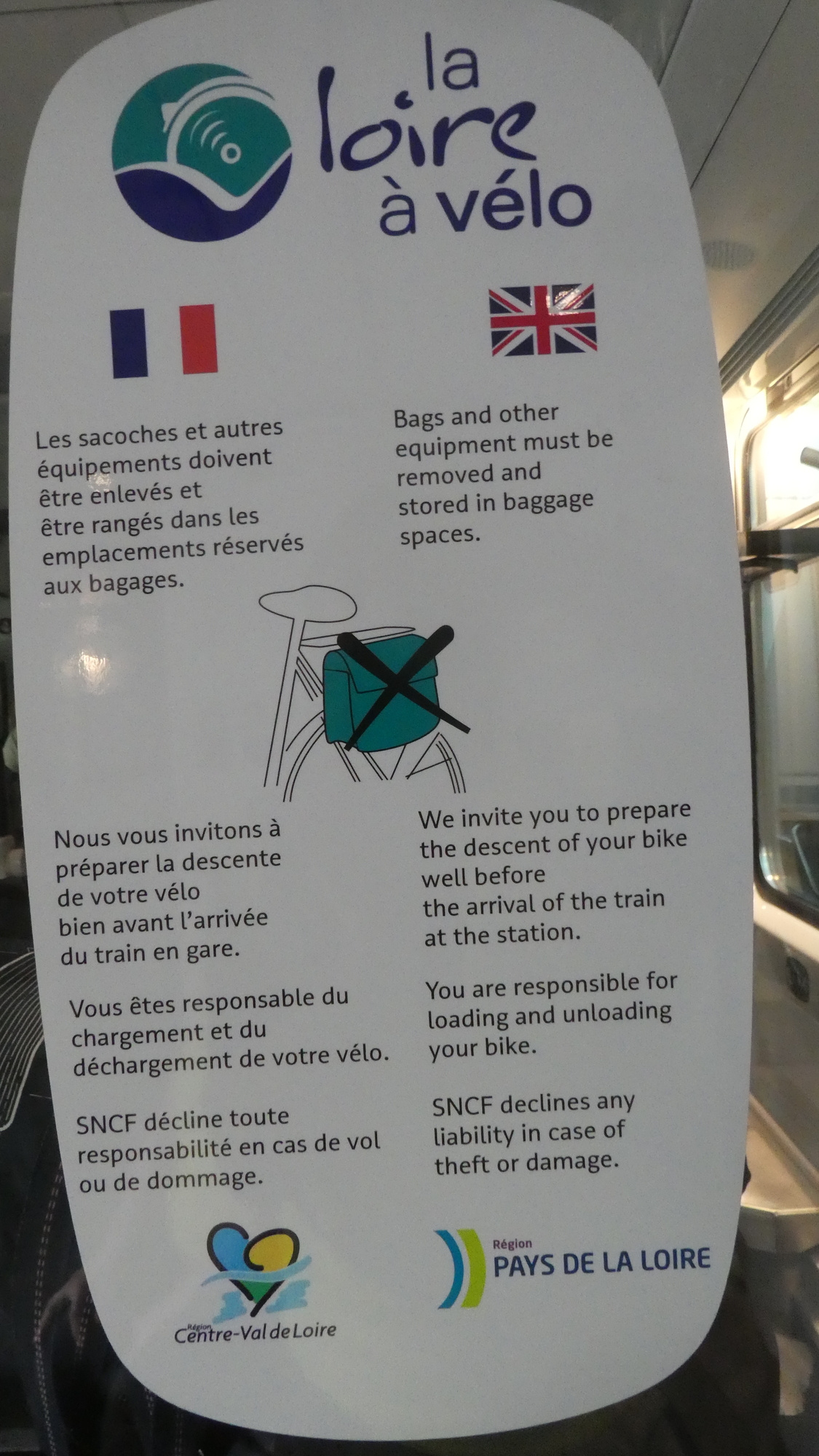 We were not set to take advantage of the full force of the Loire a Velo train arrangement. In cooperation with the train company, the tourism people had retrofitted several train coaches to house only bikes. With the right reservation, staff would take your bike and store it away. And guess what, we had the right reservations!