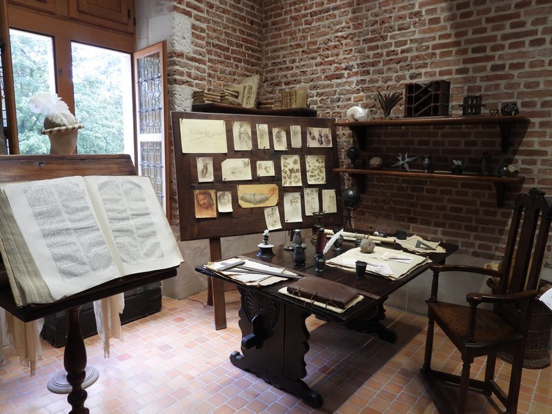 Clos Luce is not a chateau, but more like a large stone house - a mini chateau. But it also has lovely grounds, and a river running through. The interior has period furnishings, that perhaps result from a restoration effort that began in 1952. There are displays of Leonardo's workshop, and rooms with models of his many amazing designs. These range from applications of gears and screw designs, to the literal invention of the bicycle, the tank, the machine gun, the parachute, and many more.