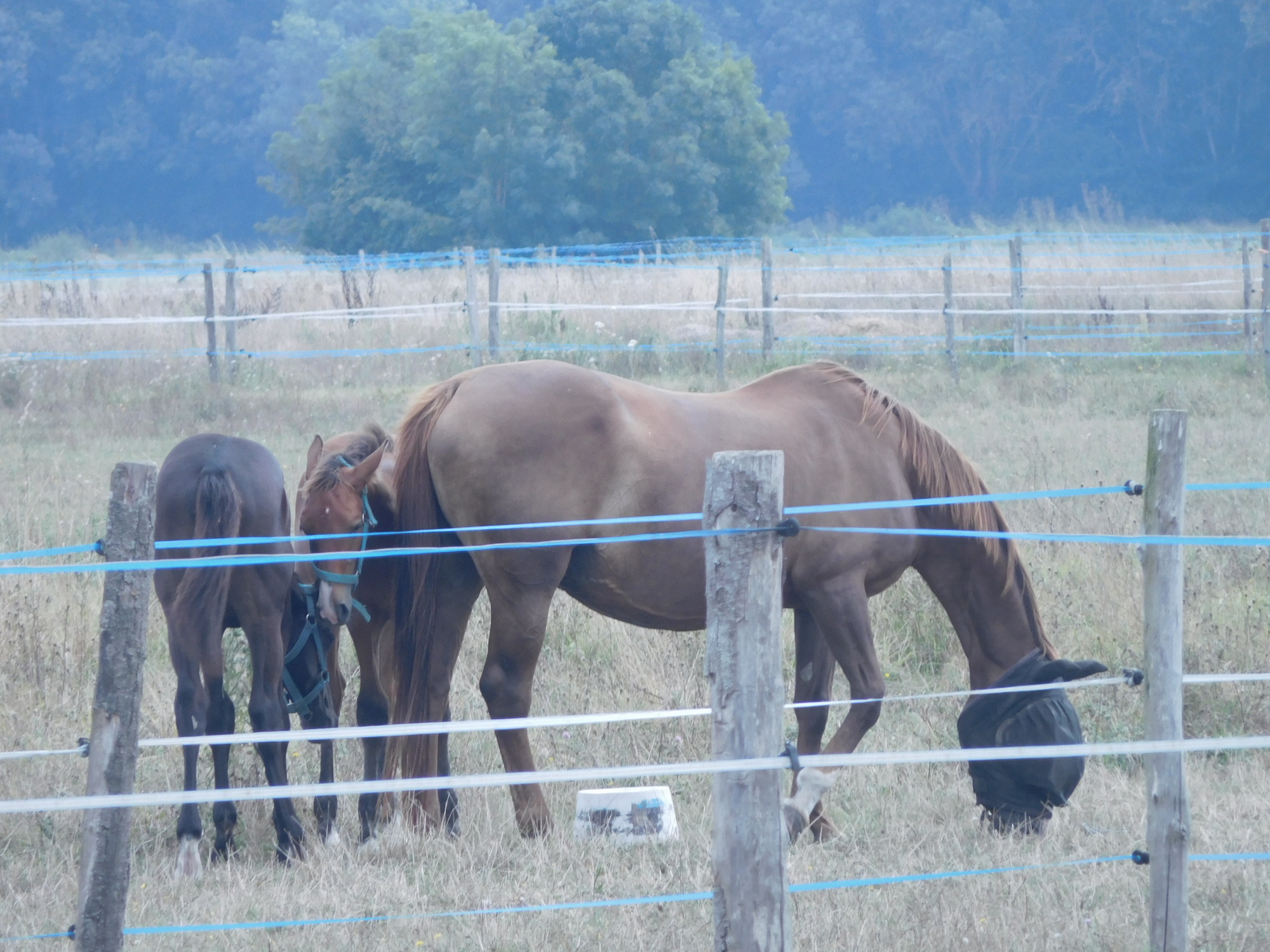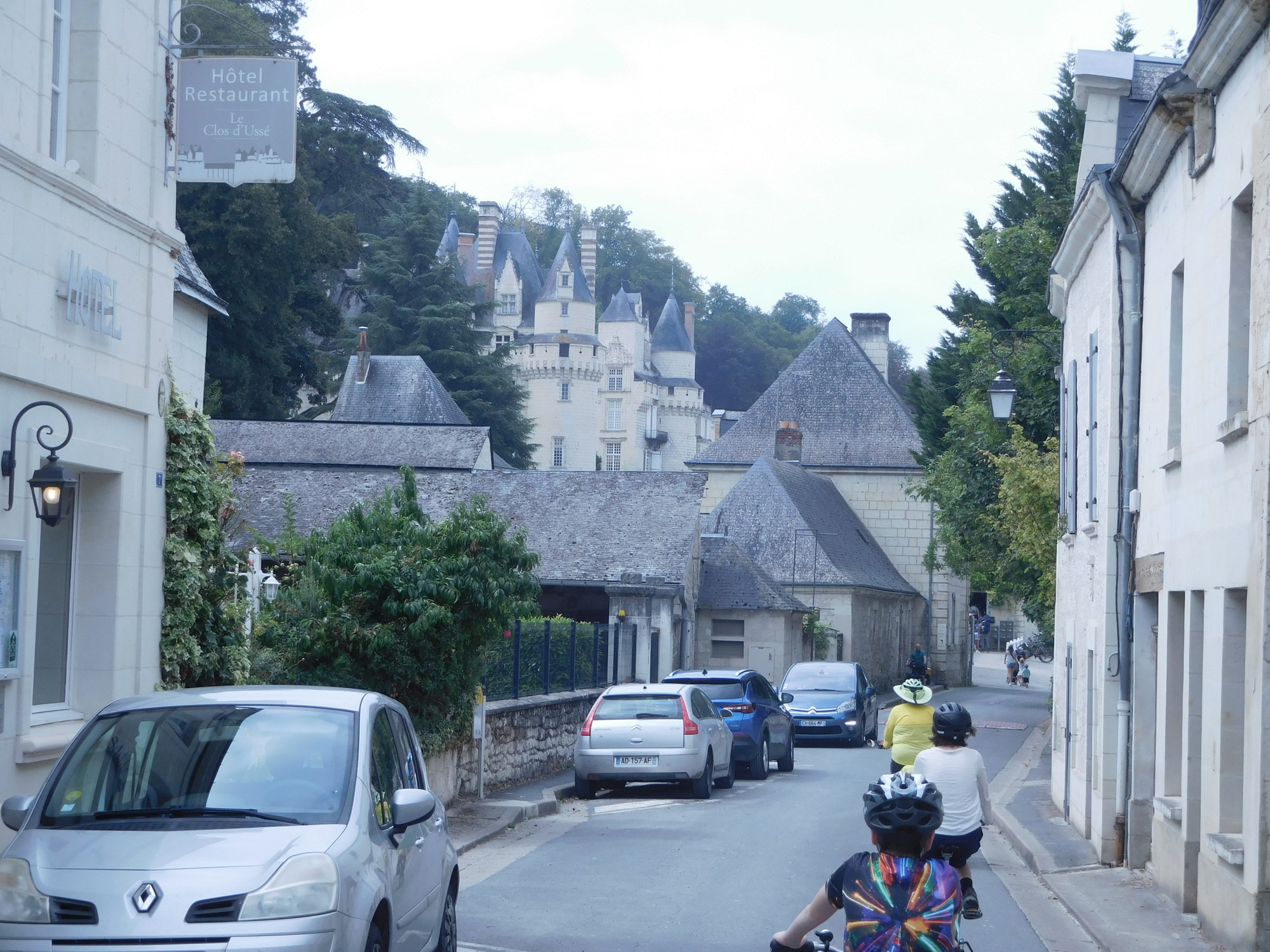 Apparently i get to follow an ass and a horses' ass. Upon entering Rigny-Ussé we looked at an epicerie to get some food, fail, it closes at 1pm and reopens at 3pm, it is currently 1:20. Ohhh a boulangerie! nope it is closed permantly. After passing through Rigny-Ussé we had the choice of either climbing a giant looking hill as a group to go to an epicerie to find foods or to continue on the the Gite in Cuzé where would could ditch Steve and the kids while Dodie and I carry on a couple km to go to an epicerie in Huimes. Dodie and I arrive and lo and behold epicerie is closed until 3pm, time check? 2:20pm, nuts, okay well we just passed a brasserie lets go get a coffee and some food! Sure have a seat they say, how can we help you? oh you want food? No, sorry, no food here we close at 2, okay fine you can have some dessert and coffee. So we hung out there for 40 minutes and then headed back over to the epicerie. Upon approaching we saw an ant (another cyclist coming out carrying a bag of chips and a drink). Went in and got an assortment of fruits and veggies and things that we hope the kids will eat. Unfortunately we don't have any pictures but, this establishment features exclusively Bio, and Local goods. While the nice lady was processing our goods, it took her a good thirty minutes, a young couple came in carrying a little basket with about six jars of something. They did some negotiating with the man at the store, and were provided with some kind of ticket for their goods, maybe they sell the preserves on commission? The lady had some trouble cataloging all our goods, we got some fancy looking Bio Herbes de Provence & Tomates potato chips for free because she couldn't make them scan properly. She later had to call on the other fellow, maybe her son?, to help her capture the Local Gouda that we chose. We then cruised back downt the hill to the Gite and shared our spoils with the family. Not long after we returned it has started pouring rain!