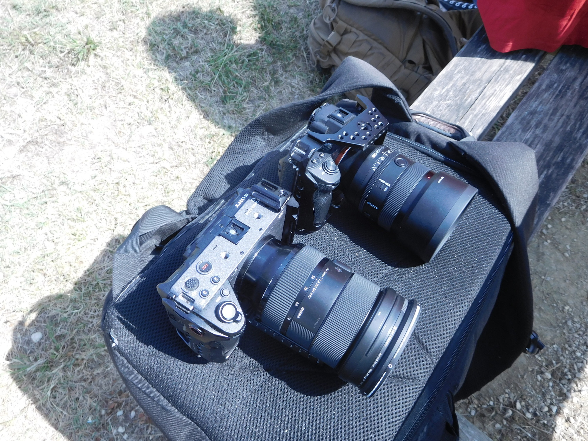 We stopped to eat some sandwiches near another cycling family, that we had also encountered yesterday. The father, or maybe uncle in this family was really engaged in making a photographic record of the trip. He caught my attention by having not one but two giant cameras. As is now the case with me, one camera was eating up the entire handlebar bag space. But for the other one, he had a custom mount on the strap of his backpack. The large camera hung there, but could be quickly released to record anything of interest. As we passed, he was recording their two kids in a trailer. OK.