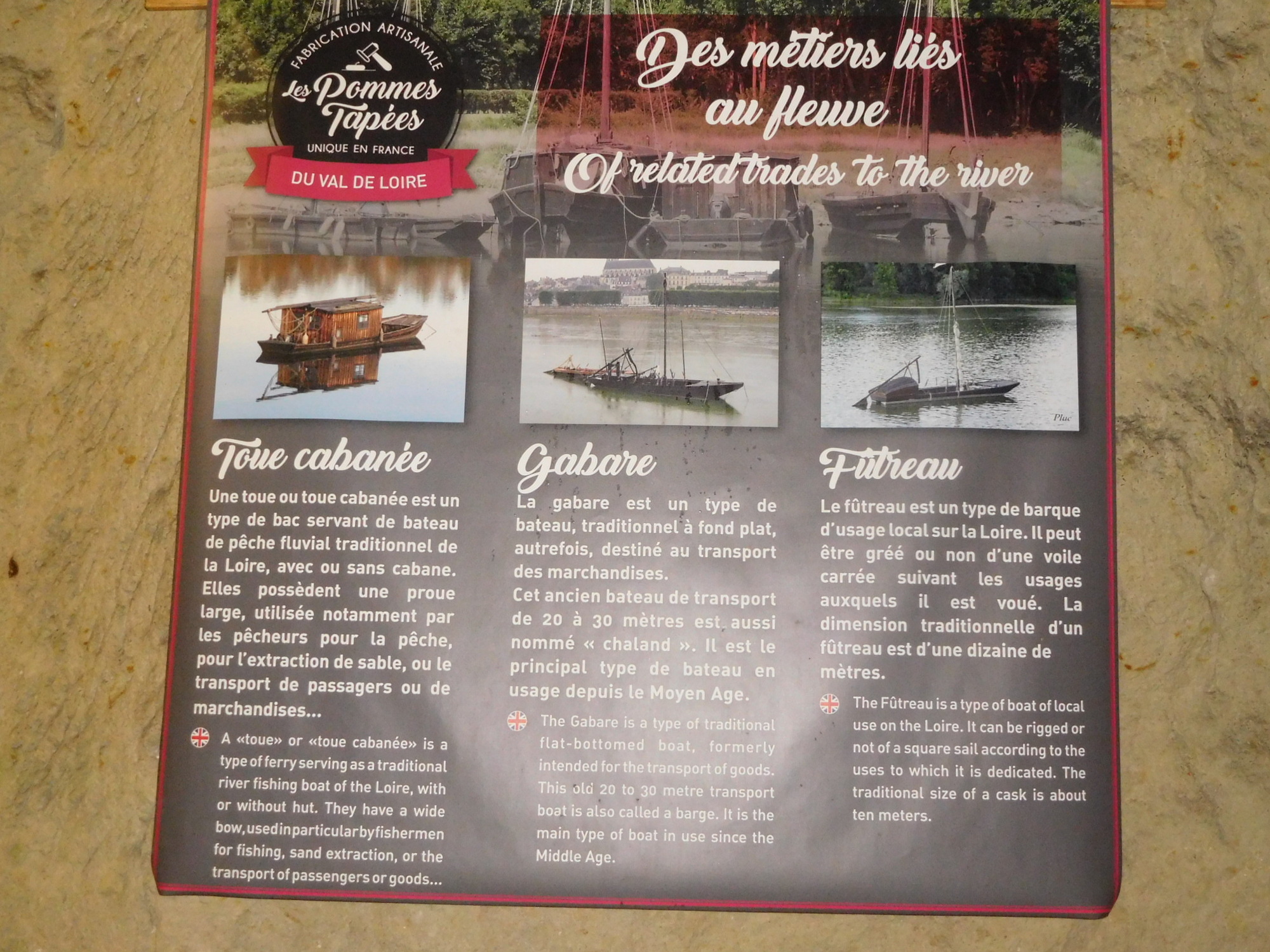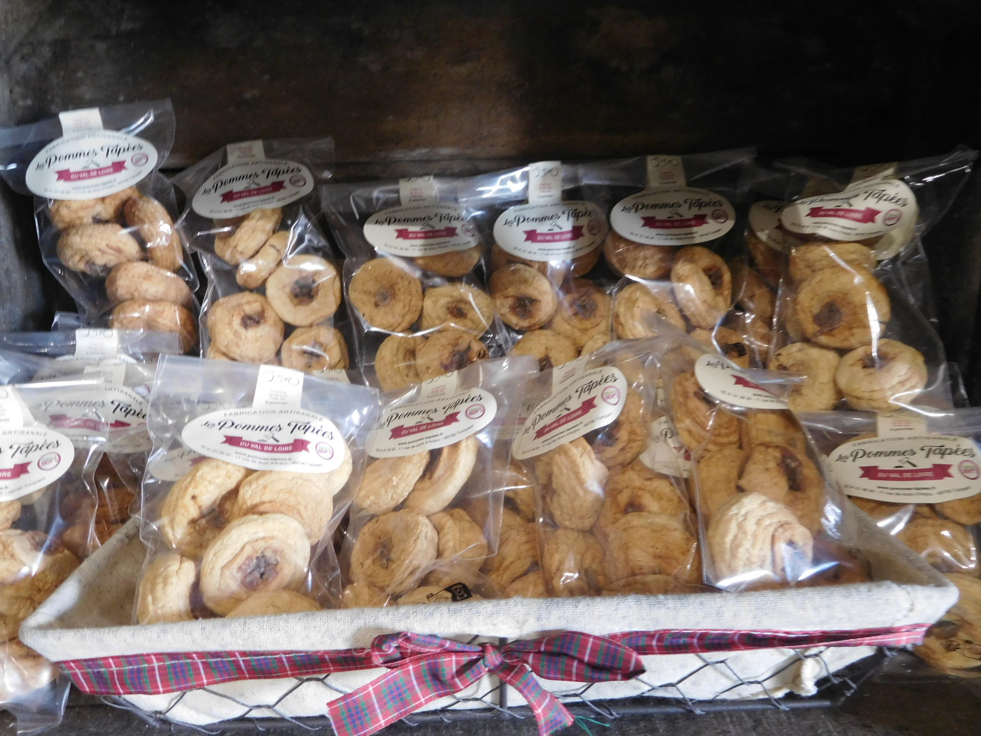The story of pommes tapées is that the French grape industry was destroyed by the blight phylloxera in the mid 19th century. The local population turned to apple production, and specifically to making dried apples. To do this, they utilized the tuffeau caves, into which wood fired ovens were built. Apples were peeled (but not cored) and then slow dried in these ovens. The technique was to put the apples in river water soaked willow baskets into the ovens, but to pull them out daily and tap them with hammers to flatten them. Strange, but that is how they did it.
