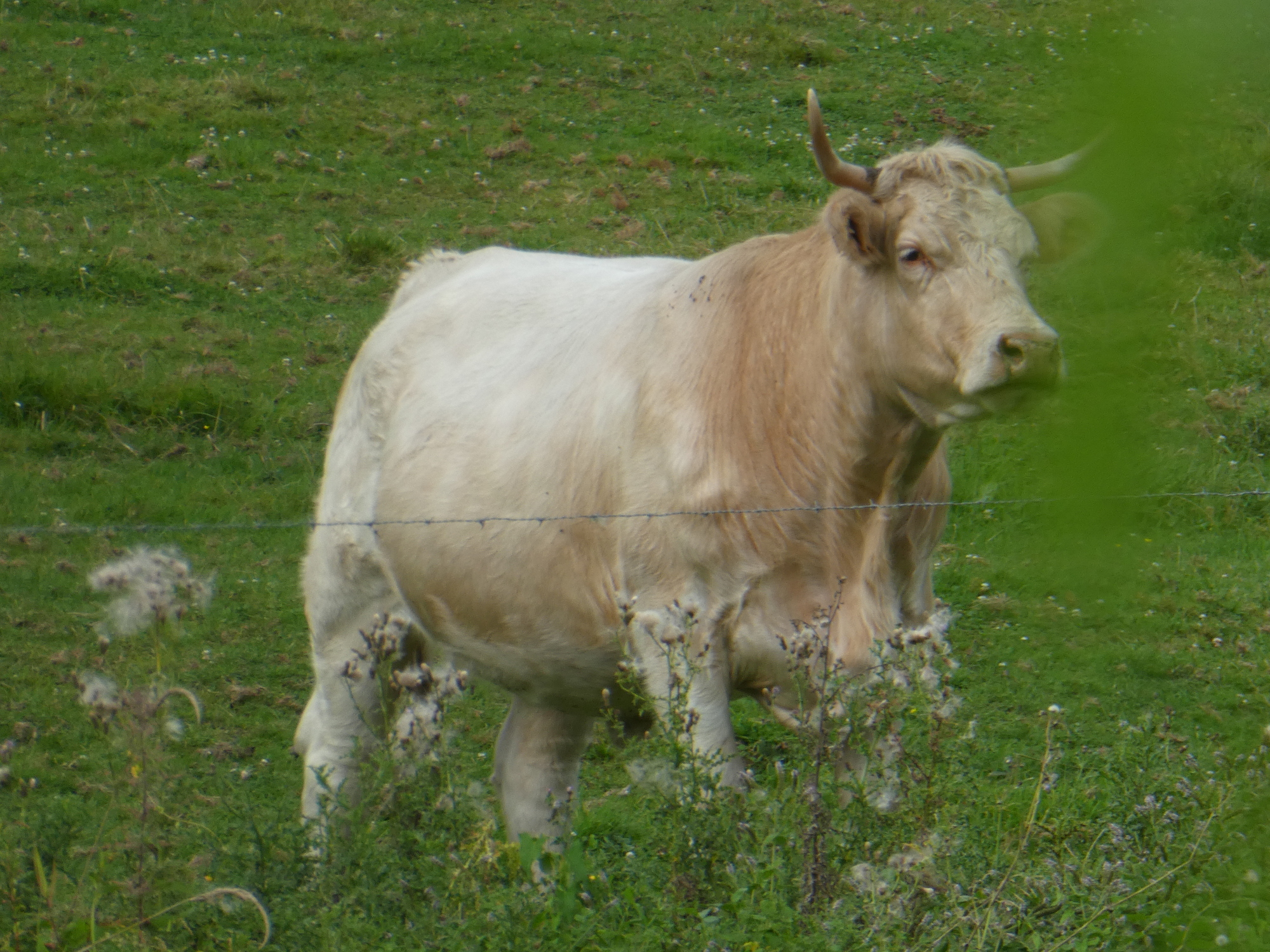 Dodie has been calling the white cattle we are seeing Blond d'Aquitaine, but I think they are too white, and must be Charollais. But this one, now, does fit the bill, I think.