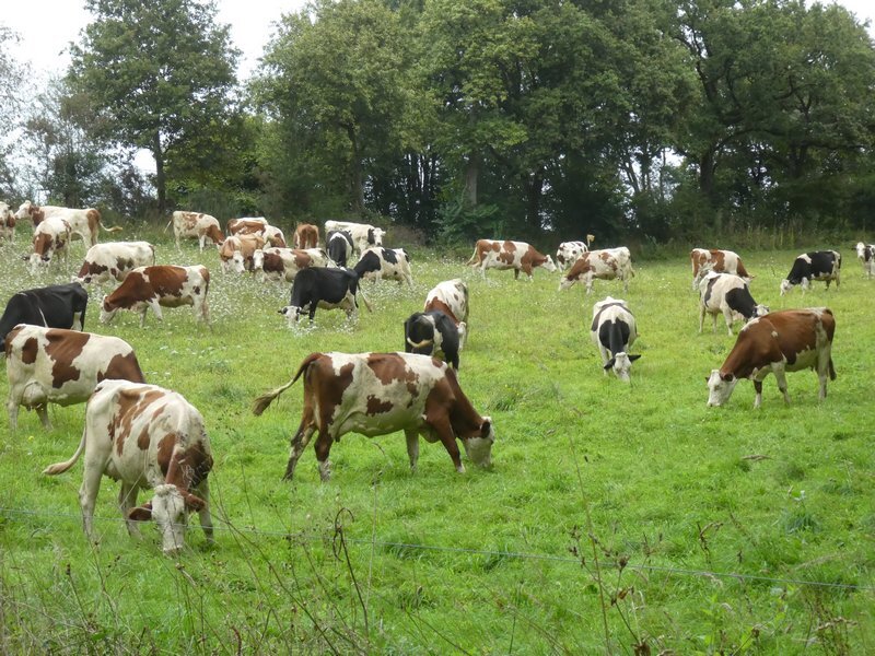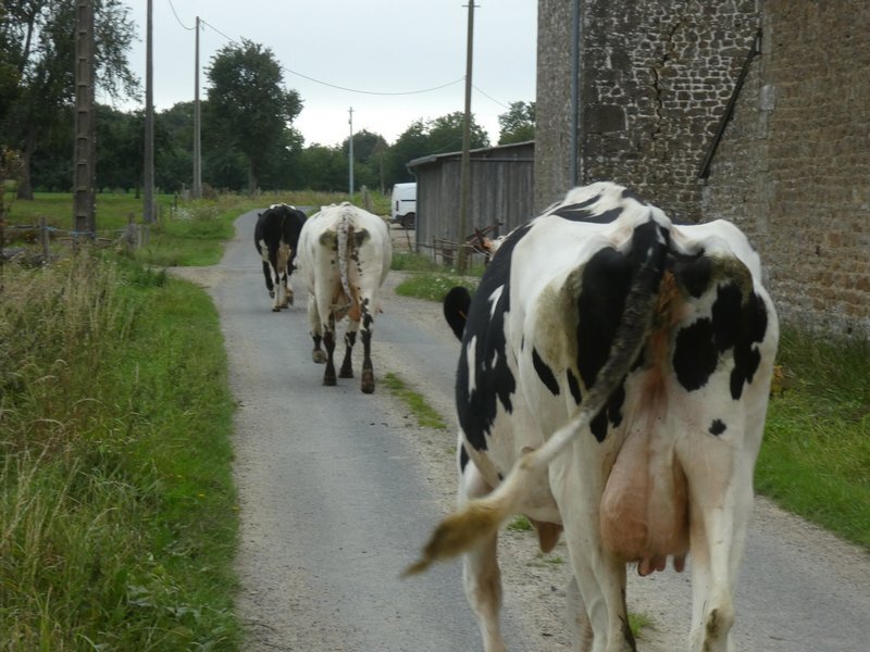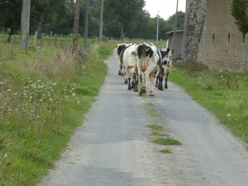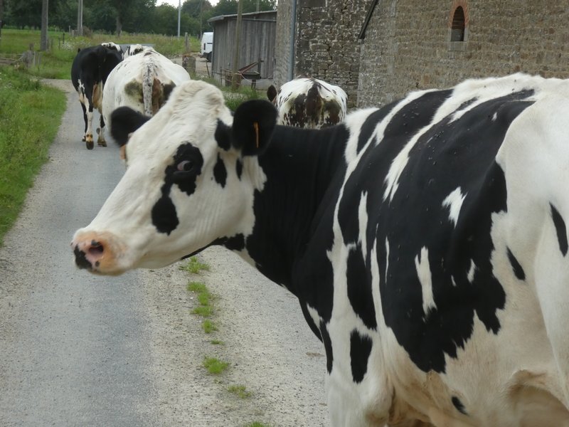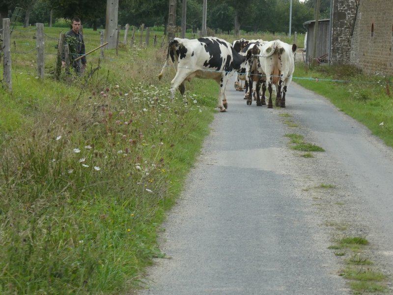 Undoubtedly the most exciting party of the day came when a young farmer brought his cows out of a field and down the road in front of us. The cows knew perfectly well where they were going, and ambled along the road calmly. But then they had to cope with me, a camera wielding cyclist zooming up behind them. The trailing cow turned and gave me the stink eye, which I saw through my camera viewfinder. This destabilised me a bit, and I also backed off, slightly. The cows then proceeded to calmly make their turn toward the barn, and the farmer lifted for us the string he had put to remind them of the turn. He wished us "bonne journée", and our little adventure came to an end!