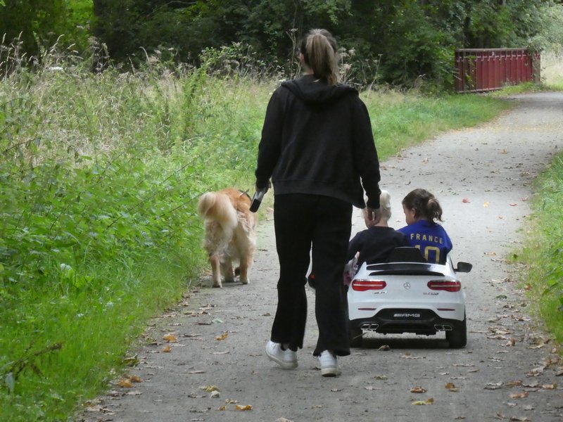 At one point along the path we encountered a lady with a nic e Golden Retriever, and two kids who were travelling along in quite a good electric vehicle. As you might see, it is branded Mercedes, and it was in fact quite fast and went quite far down the track, before the lady and kids turned back.