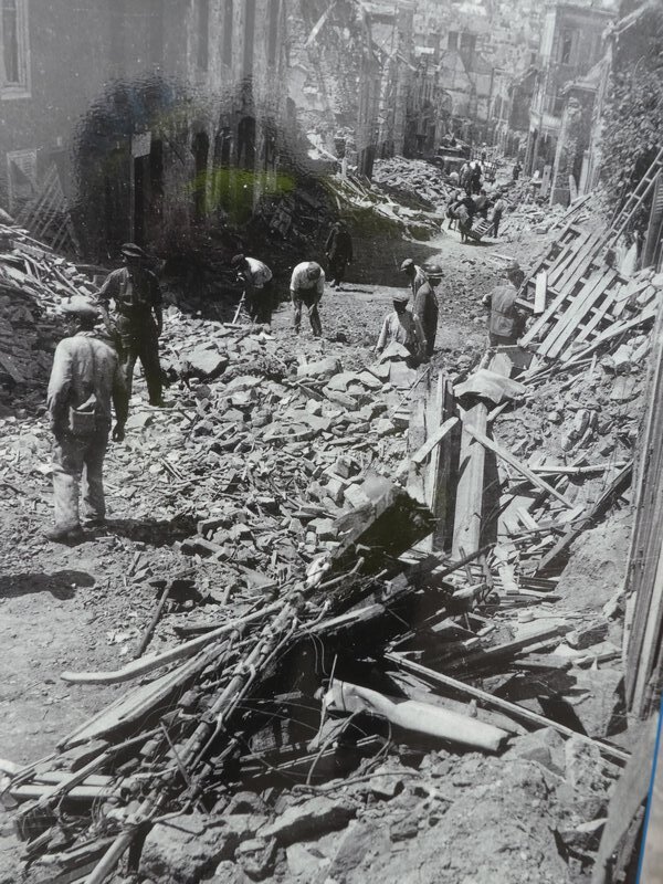 In front of the bakery (which is visible in the background) was a display about the bombing of Mayenne in 1944 - on the ocassion of the 80th anniversary. It happened June 8, 1944. Photos showed a really extreme amount of destruction. It seems strange to me to be bombing civilian infrastructure, but maybe it was necessary. Mayenne was finally liberated on August 5, 1944.