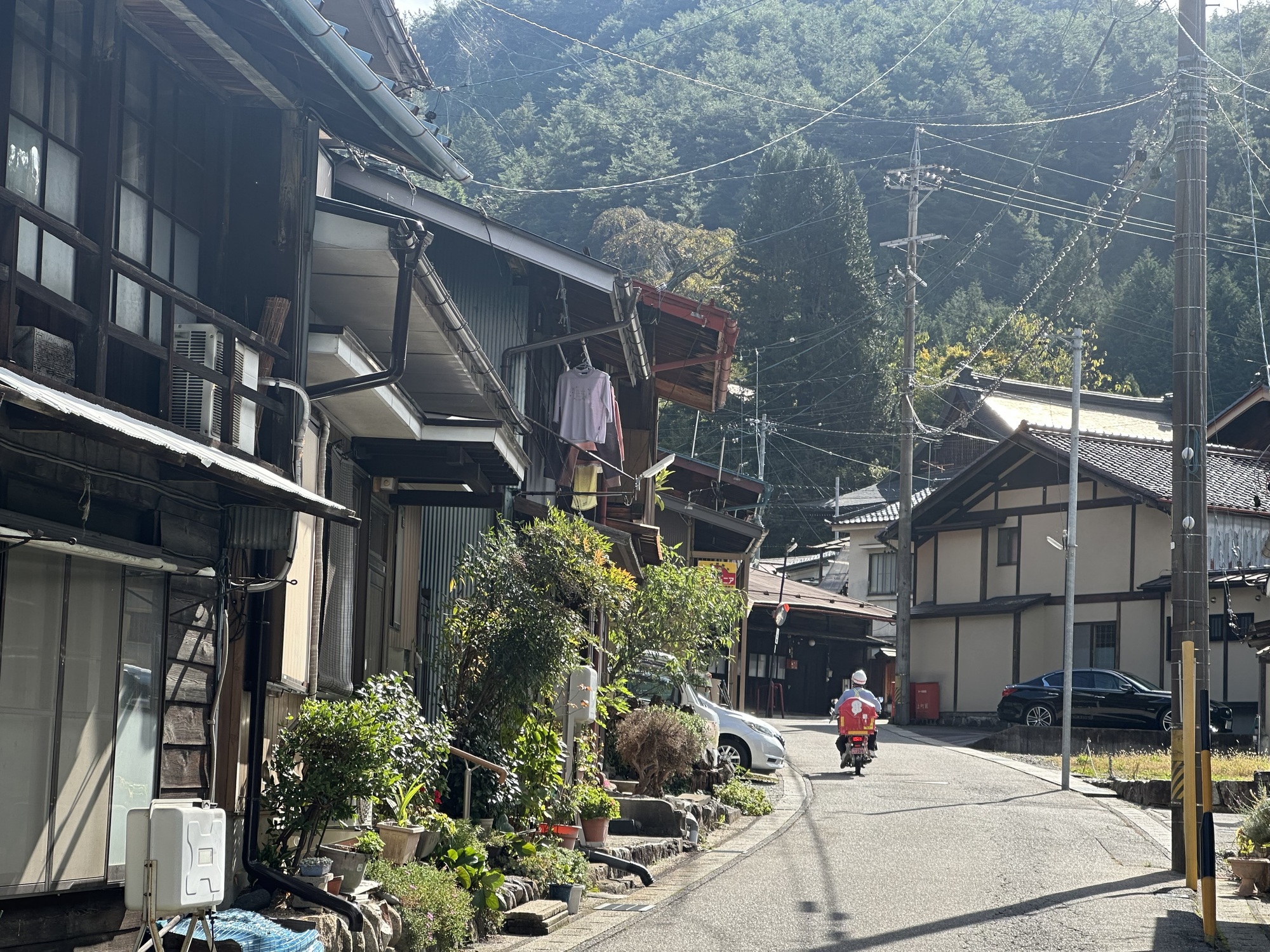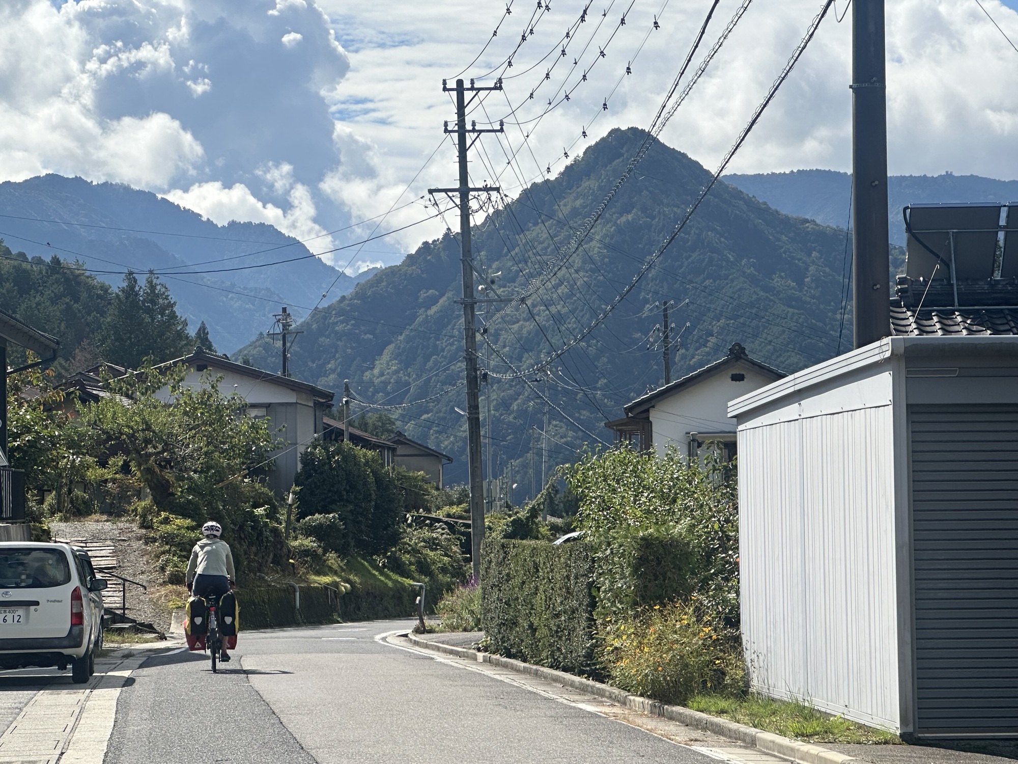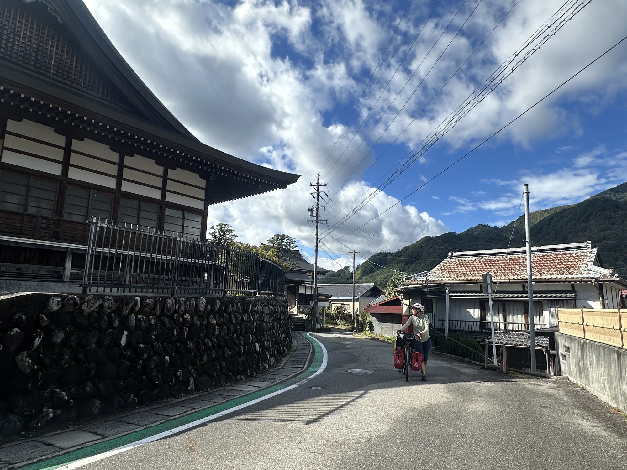 Once we turned west and left the Kiso valley to head to Nakatsugawa (a large town where we’d been able to find accommodation — guest house prices in the touristy post towns were waaaay out of our budget), Komoot did the Komoot thing and found crazily obscure ways cross country to get us into town. Tracks across rice paddies, roads barely 6 feet wide careening into river valleys and back up, back alleys connecting two normal sized roads. It all worked and provided a unique look at the spaces between the big roads, but often there was that feeling of … really??… then we’d pop out in a suburb or behind a factory or right onto the only bridge for miles.