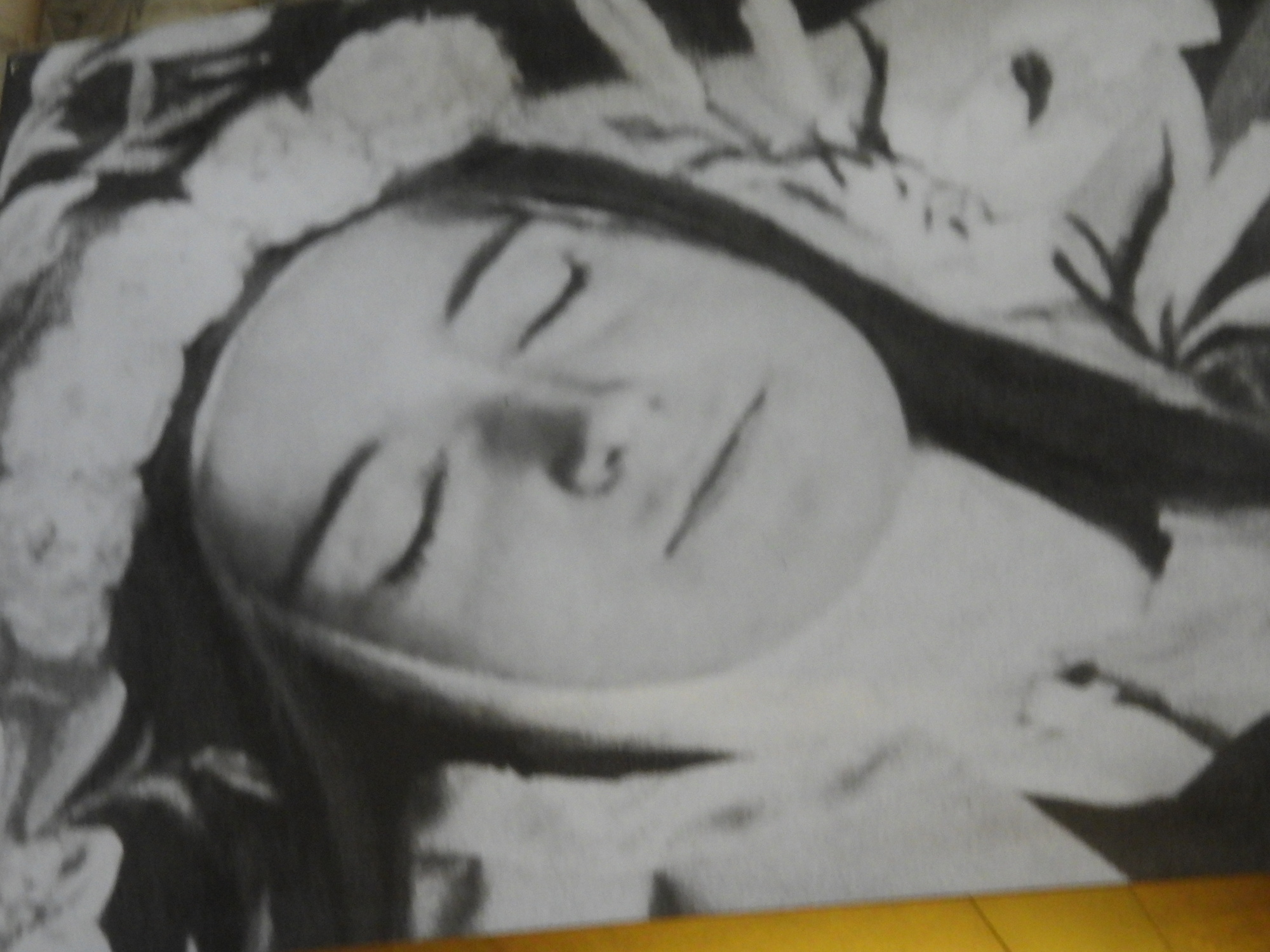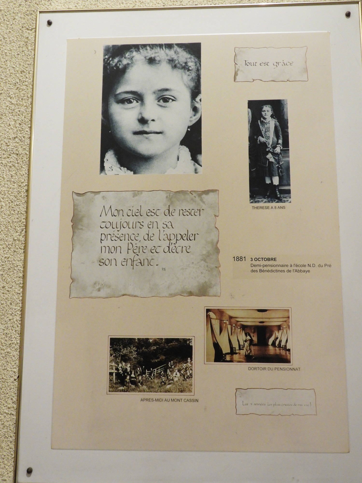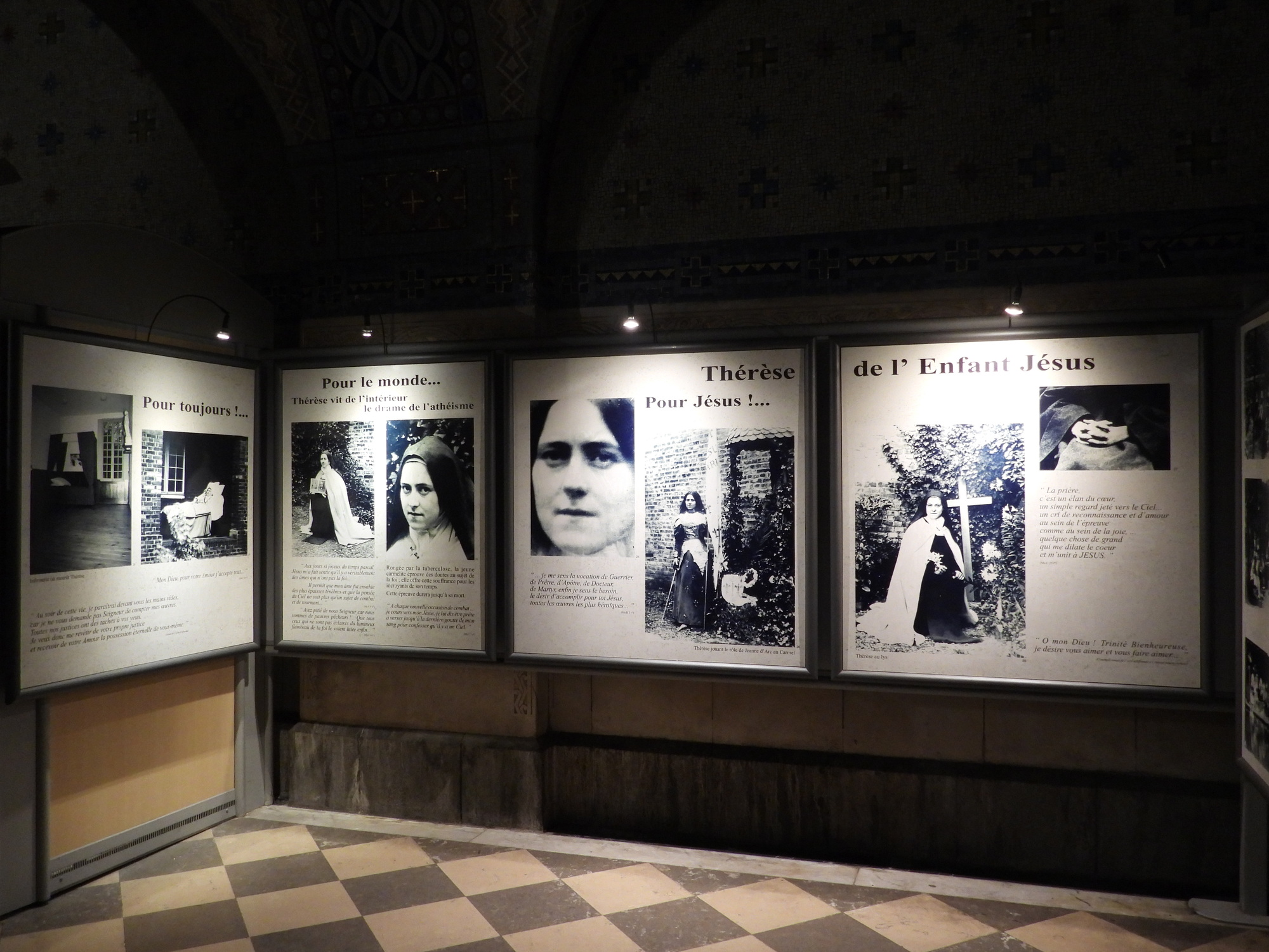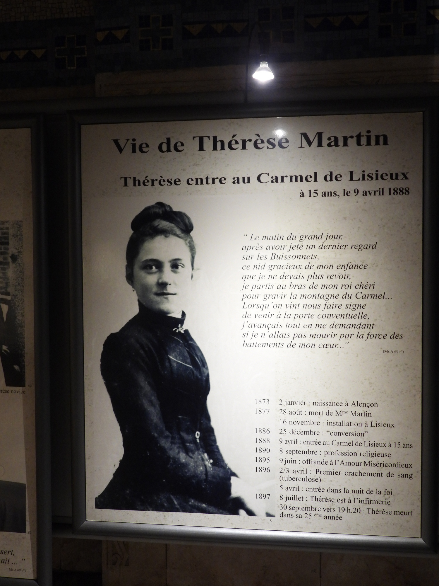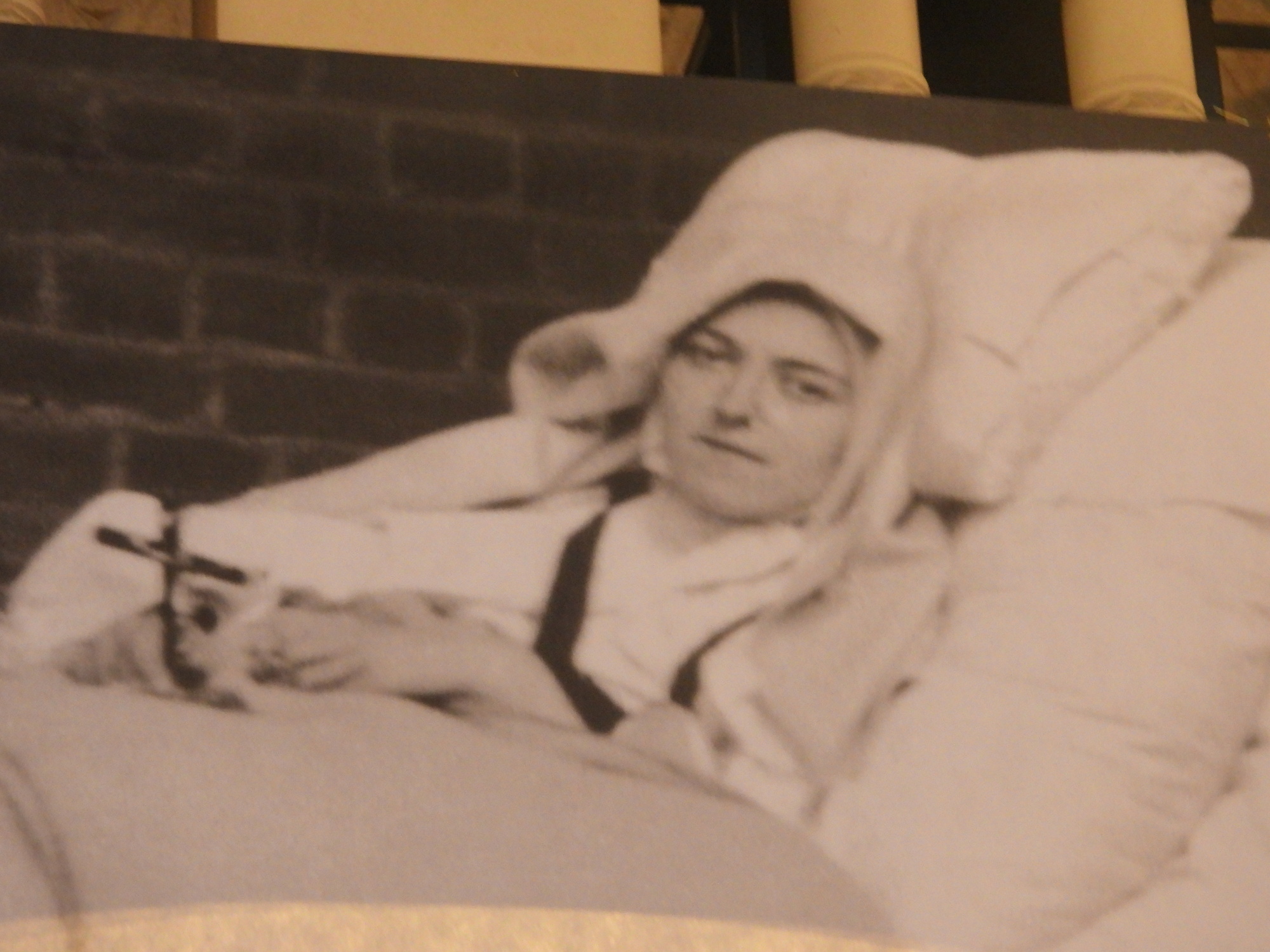 In one area, there were family type photos of Therese, plus some that are more like posters. Therese died famously at 24. So we also get her on her death bed, and presumably, dead.
