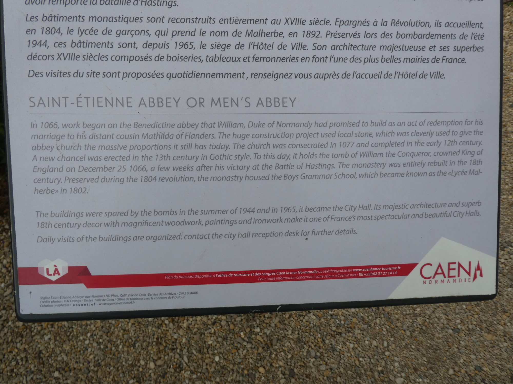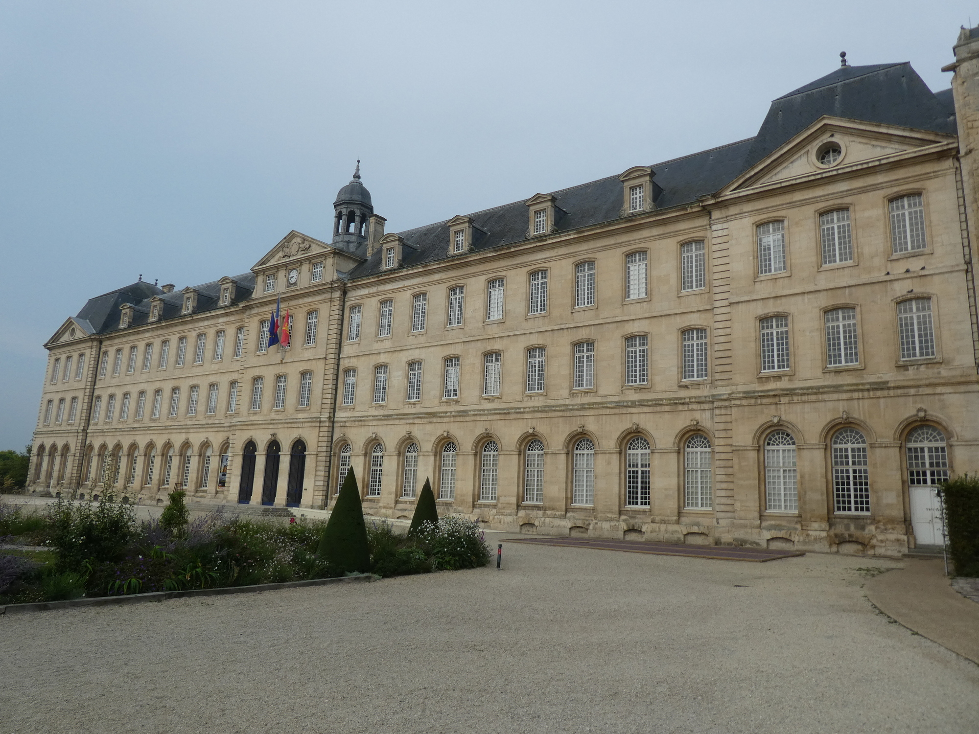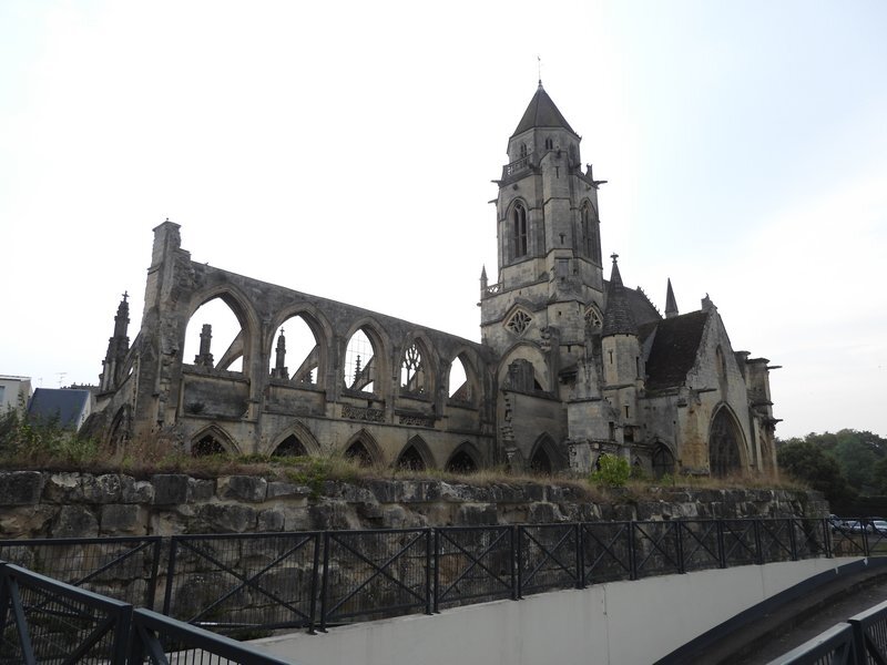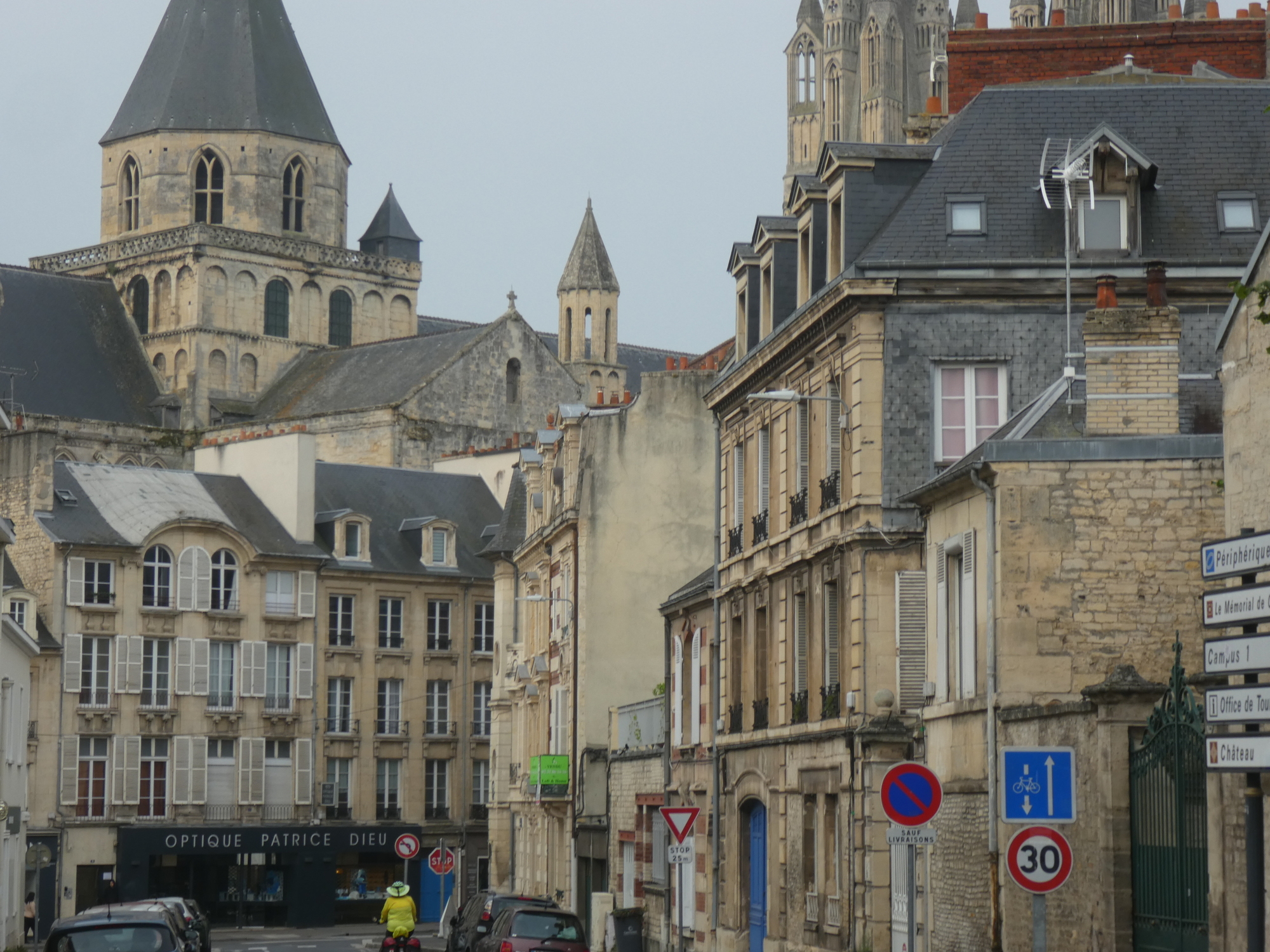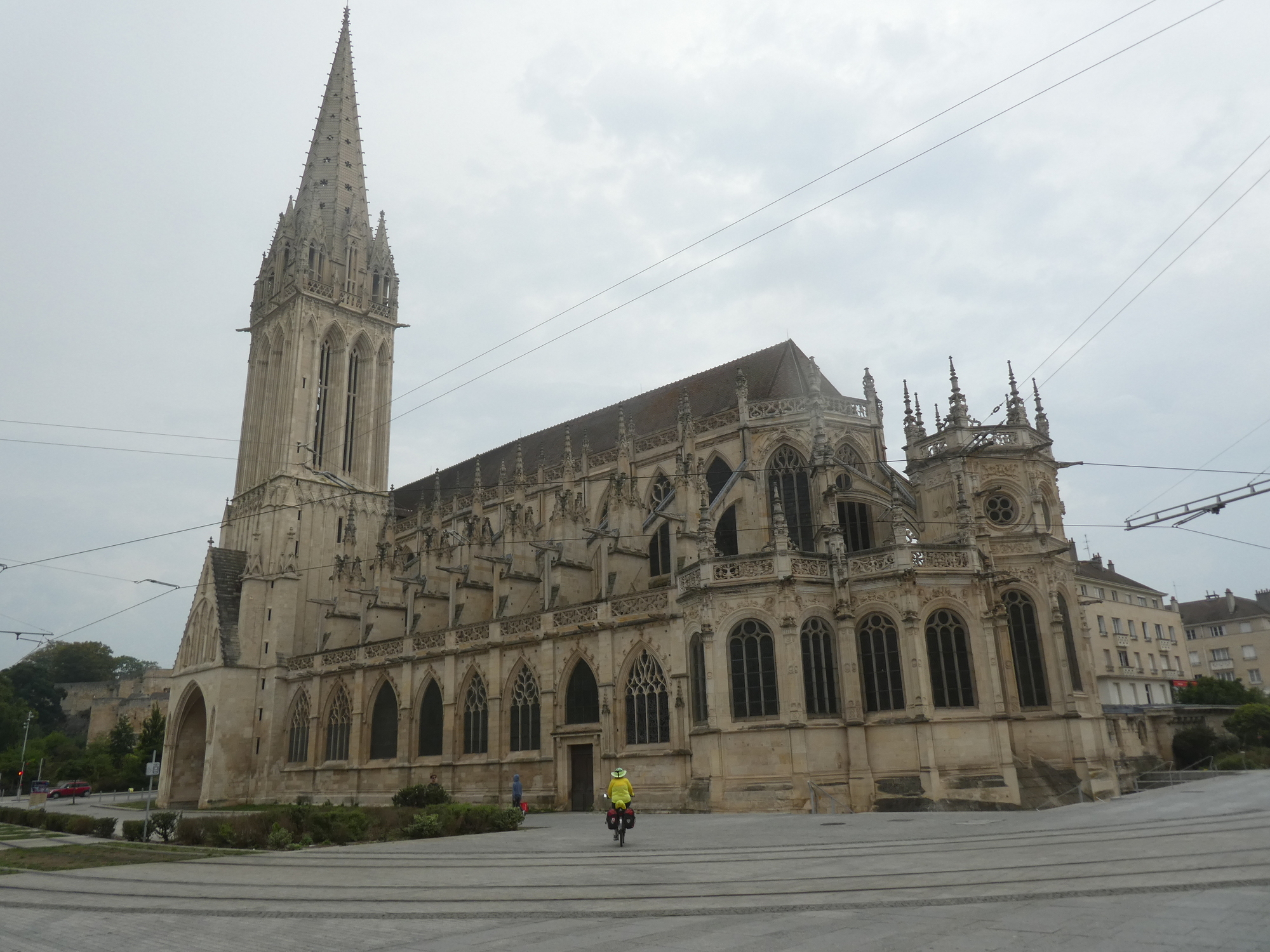 Caen was super heavily damaged during WW II, so there is precious little in terms of medieval buildings to look at. However, its major monuments survived enough to be restored. These include a fair number of churches, two monasteries, and the huge chateau of William the Conqueror. We launched a 5 km circuit that rolled us by several of the major sites, but we did not set aside time to go into any, except the first.