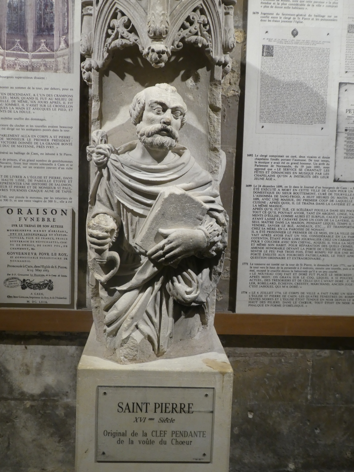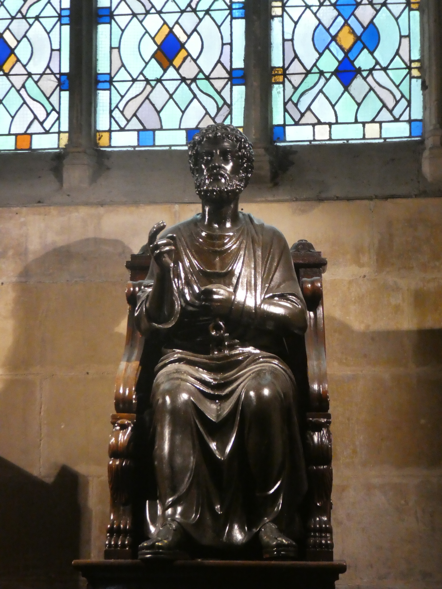 St Peter, as the founder of the catholic church, is usually depicted holding a key. I am not quite sure if this one has the key, or has lost it, or what the meaning of the inscription is.