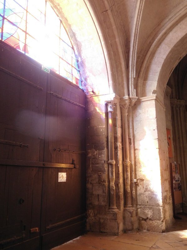 Just inside the door, stained glass was pouring through coloured light.