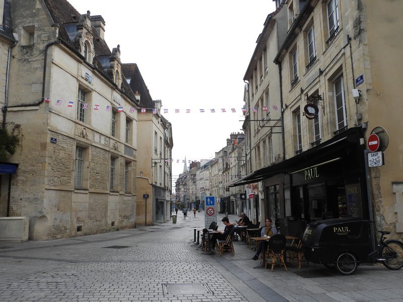 Now we are at the primary walking street of town. You can be sure I did not miss that rather dark (in the photo) Paul bakery, which yielded a strawberry and a raspberry tart. Dodie reminded me that we had intended to cut down on this kind of stuff, but I put in a plea of starvation, due to only a standard French breakfast.