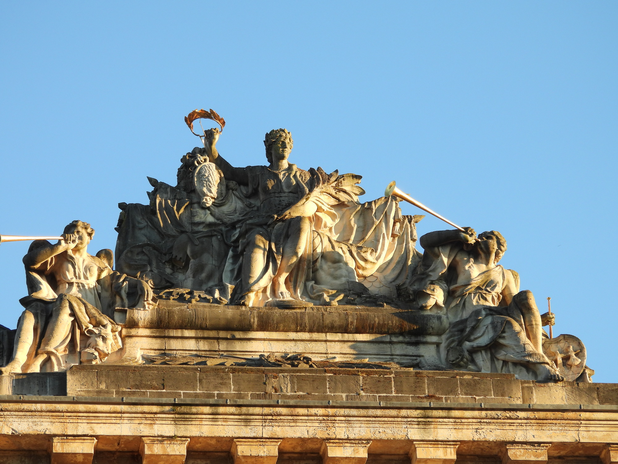 It turned out that we had been looking at the "butt end" of the Paris Gate (Gate butt!). Around the front, it does look a bit more triumphal. and Ok, at the top there are some figures, clearly blowing their own or somebody else's horns.