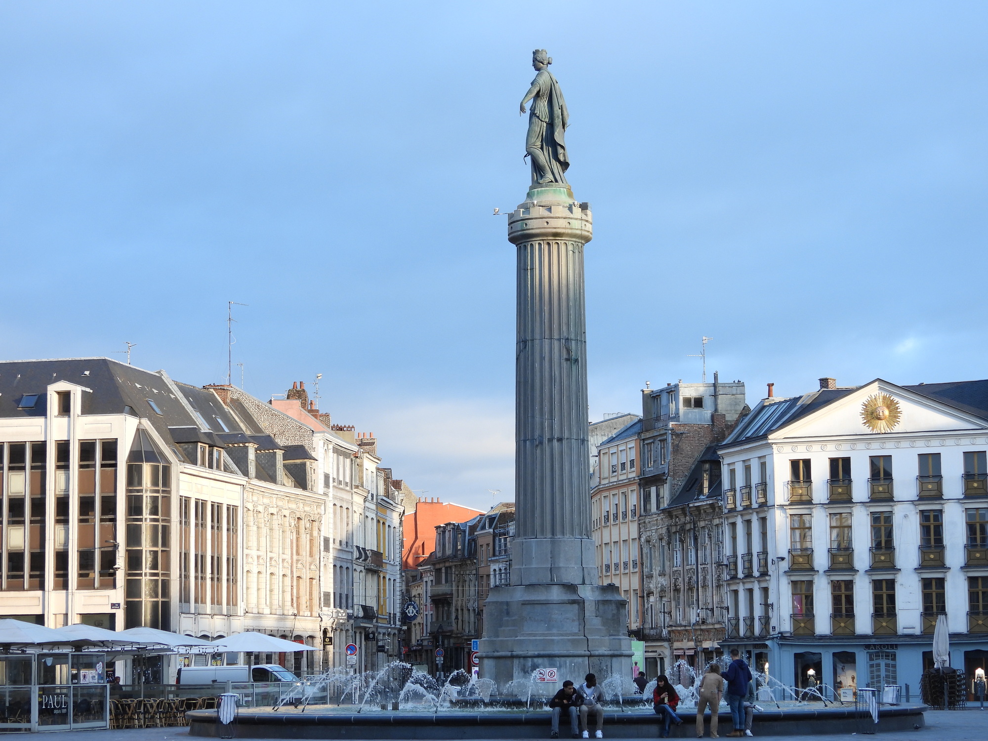 Colonne de la Déesse. "A commemorative monument, inaugurated on October 8, 1845 , in the center of the Grand'Place of Lille , today Place du Général-de-Gaulle , in the French department of Nord in the Hauts-de-France region .The monument, which commemorates the heroism of the people of Lille during the siege of Lille in 1792 by the imperial army , is composed of a column and a statue of a woman at its top.In her right hand she holds a fire starter, used to light the fuse of the cannons, and points with her left to the inscription on the base which repeats the response of the mayor of Lille, François André-Bonte , refusing the surrender of the besieged city to the Imperials, on September 29, 1792."
