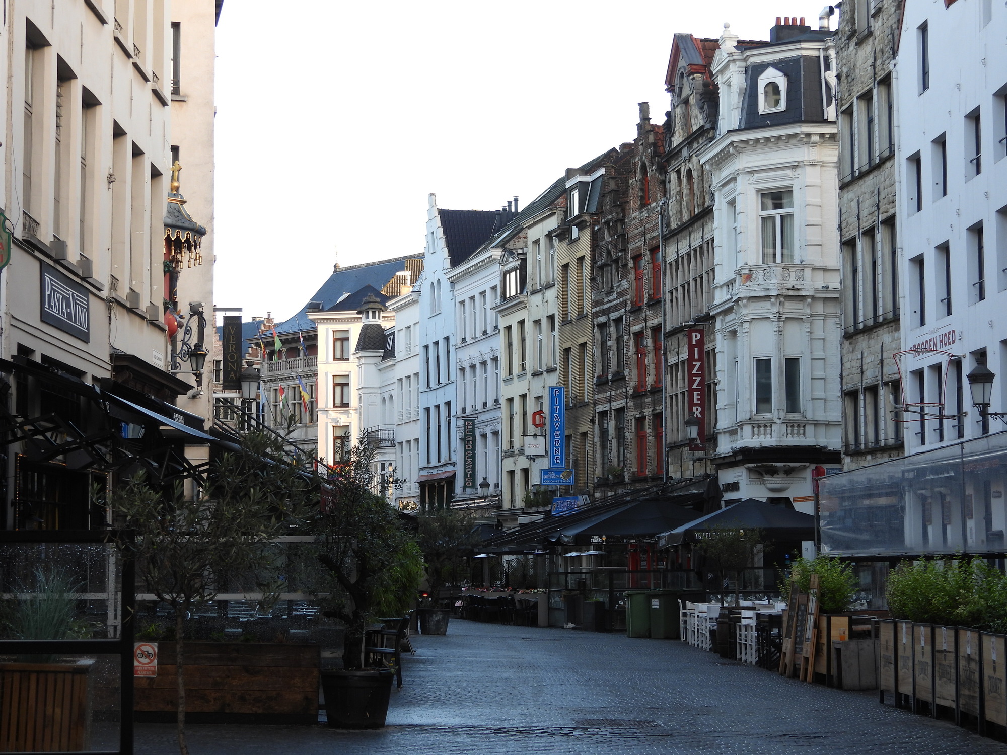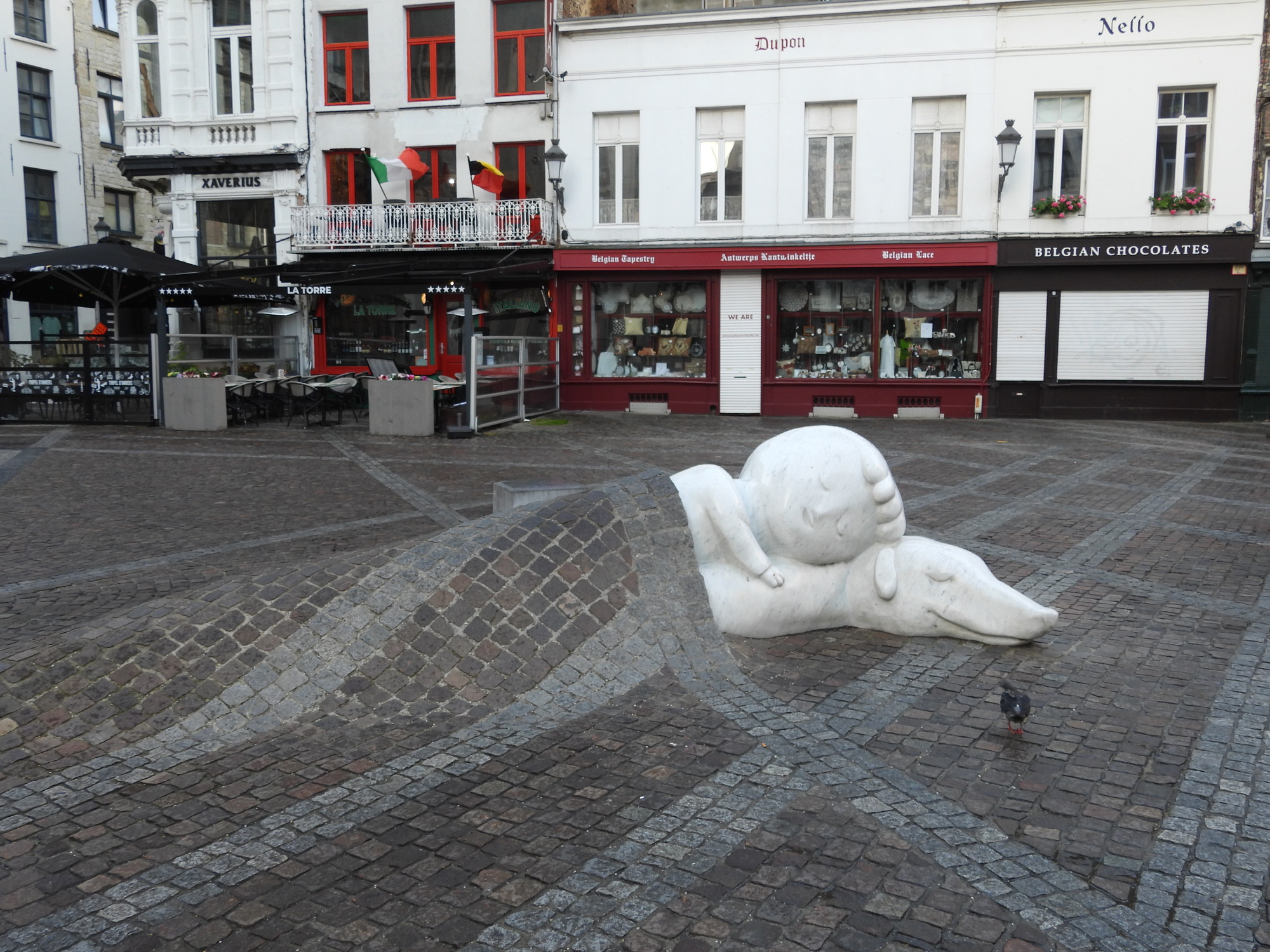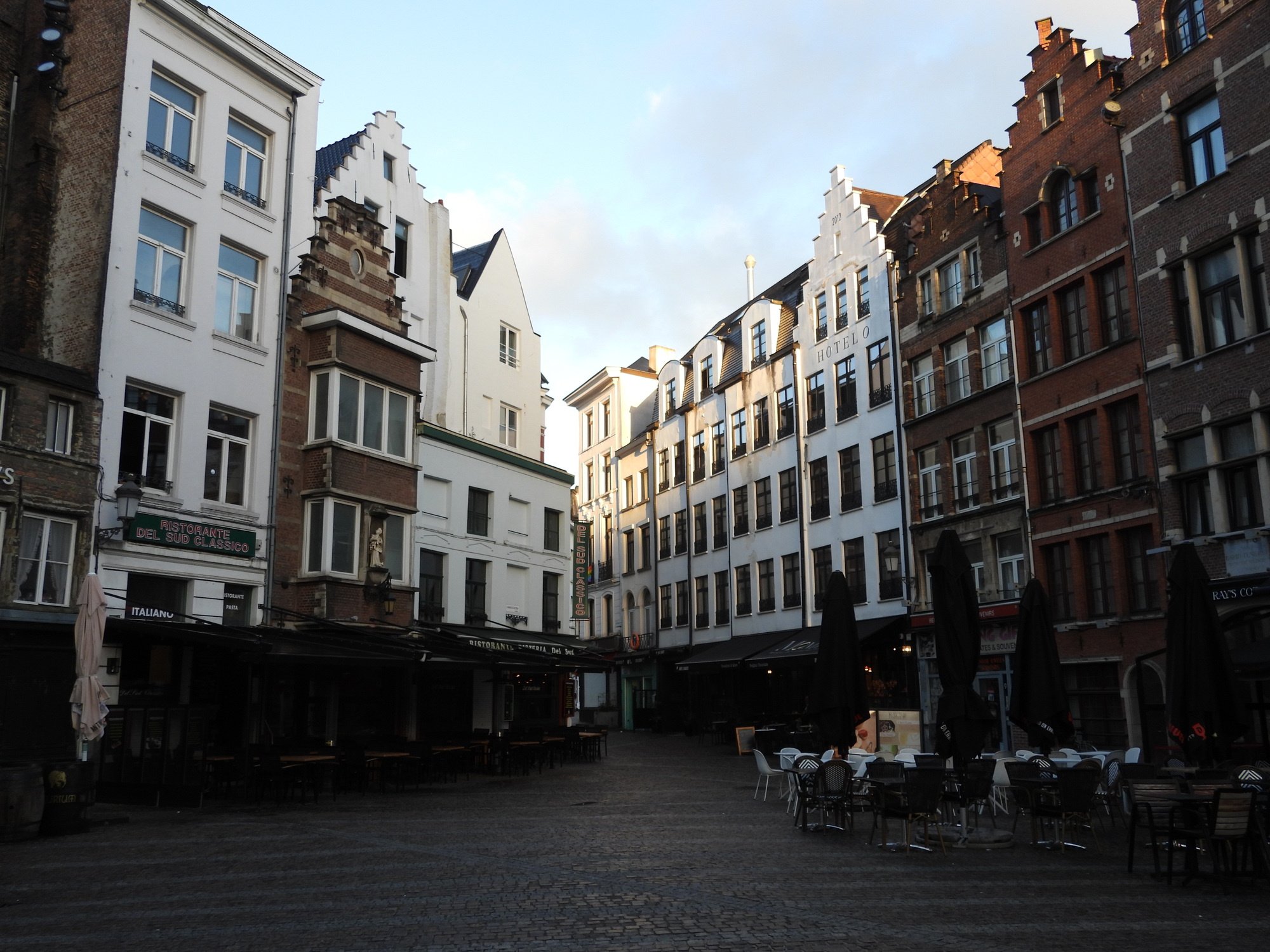 After looking at the front of the not yet open Cathedral of Our lady, we set off to find an Albert Heijn supermarket. We passed through streets liking those in the two photos below, and fetched up opposite the Groenplaats, where I of course got stashed outside.