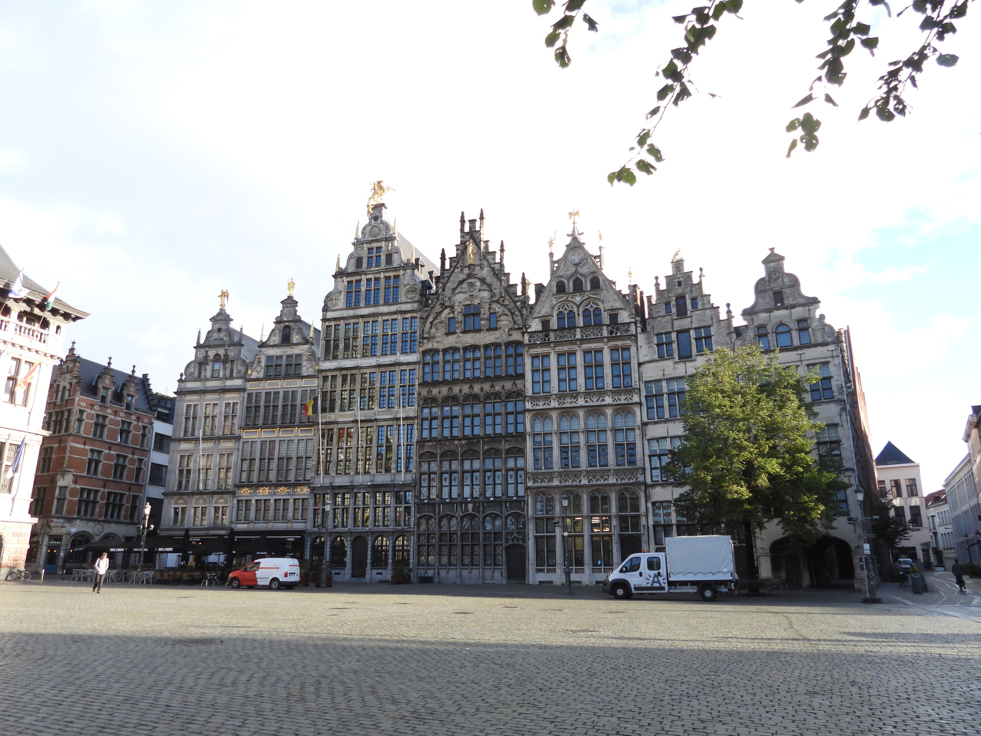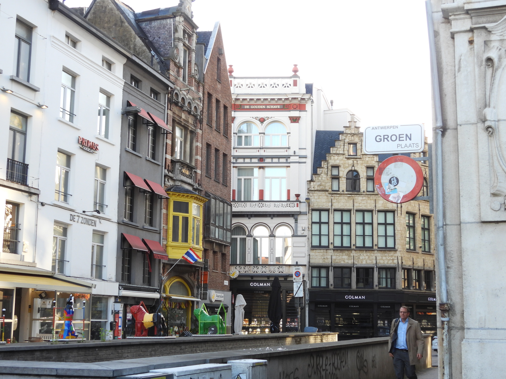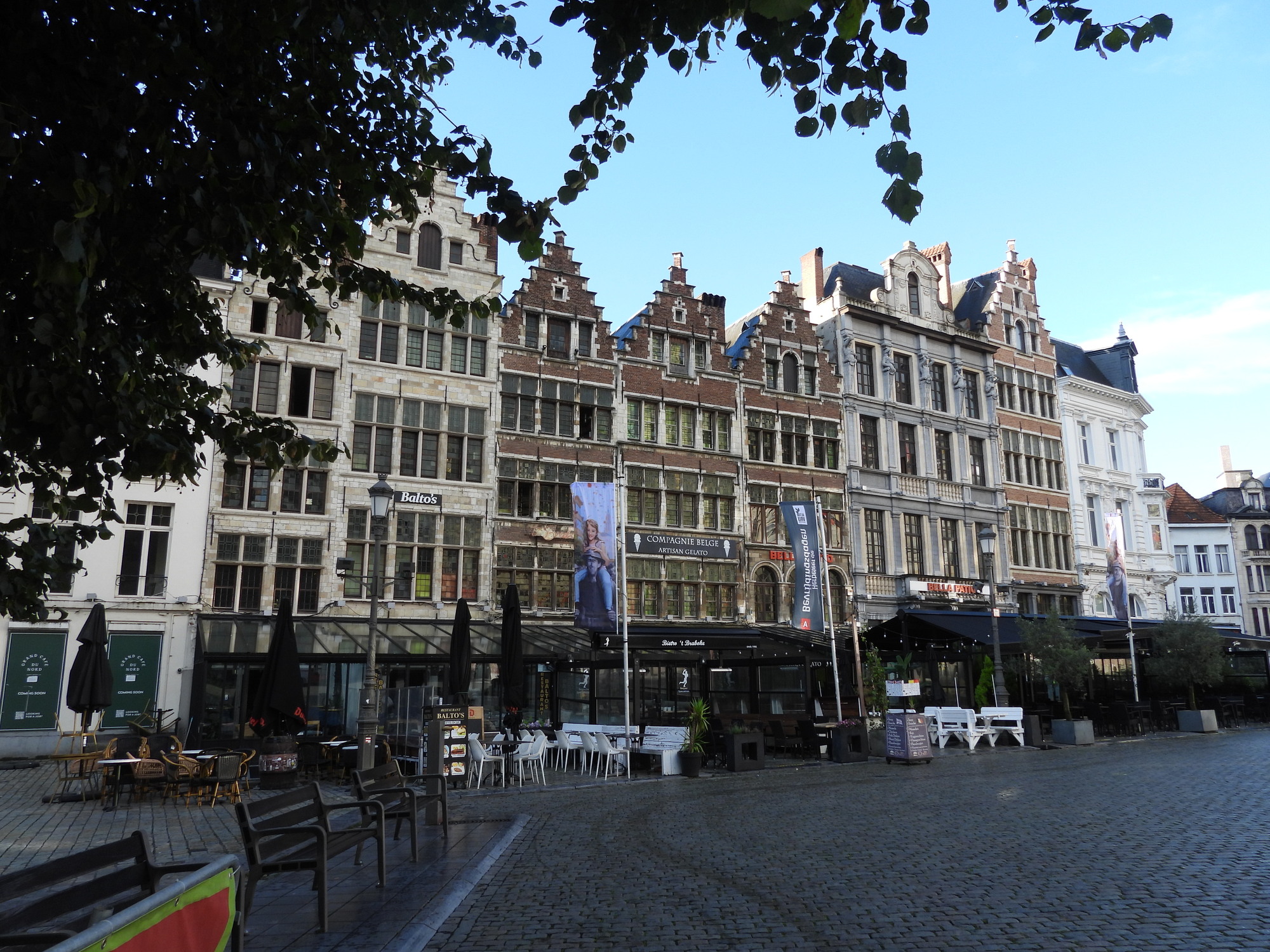 After looking at the front of the not yet open Cathedral of Our lady, we set off to find an Albert Heijn supermarket. We passed through streets liking those in the two photos below, and fetched up opposite the Groenplaats, where I of course got stashed outside.