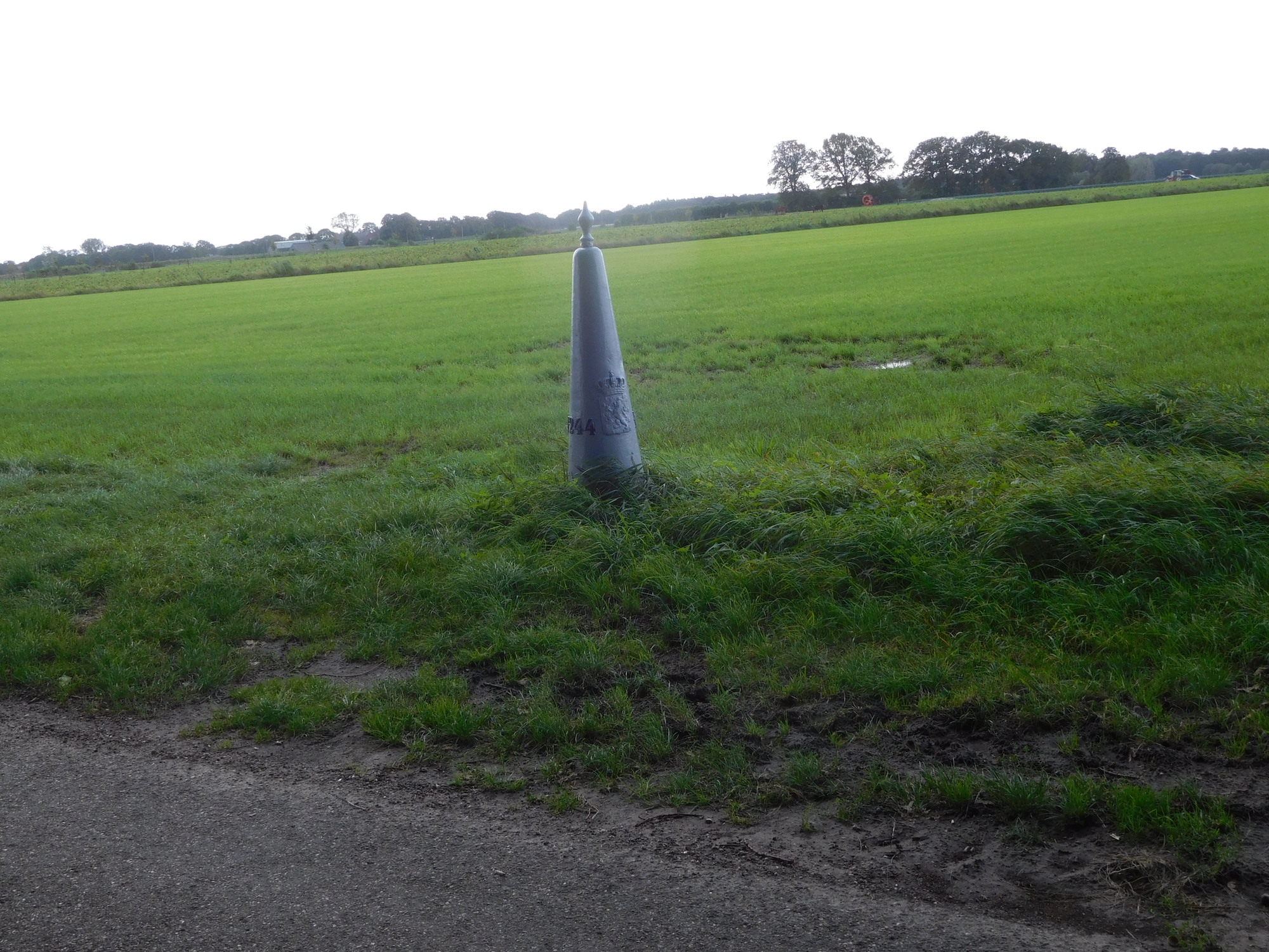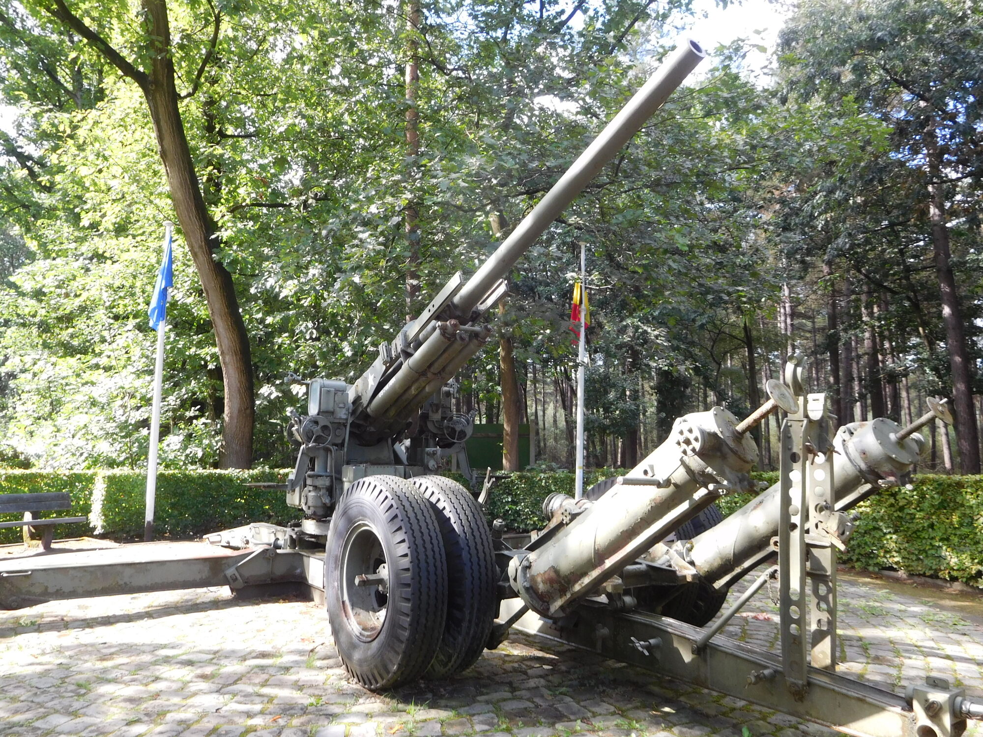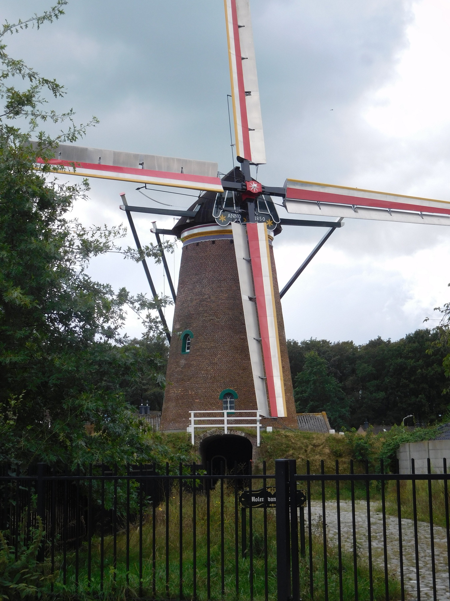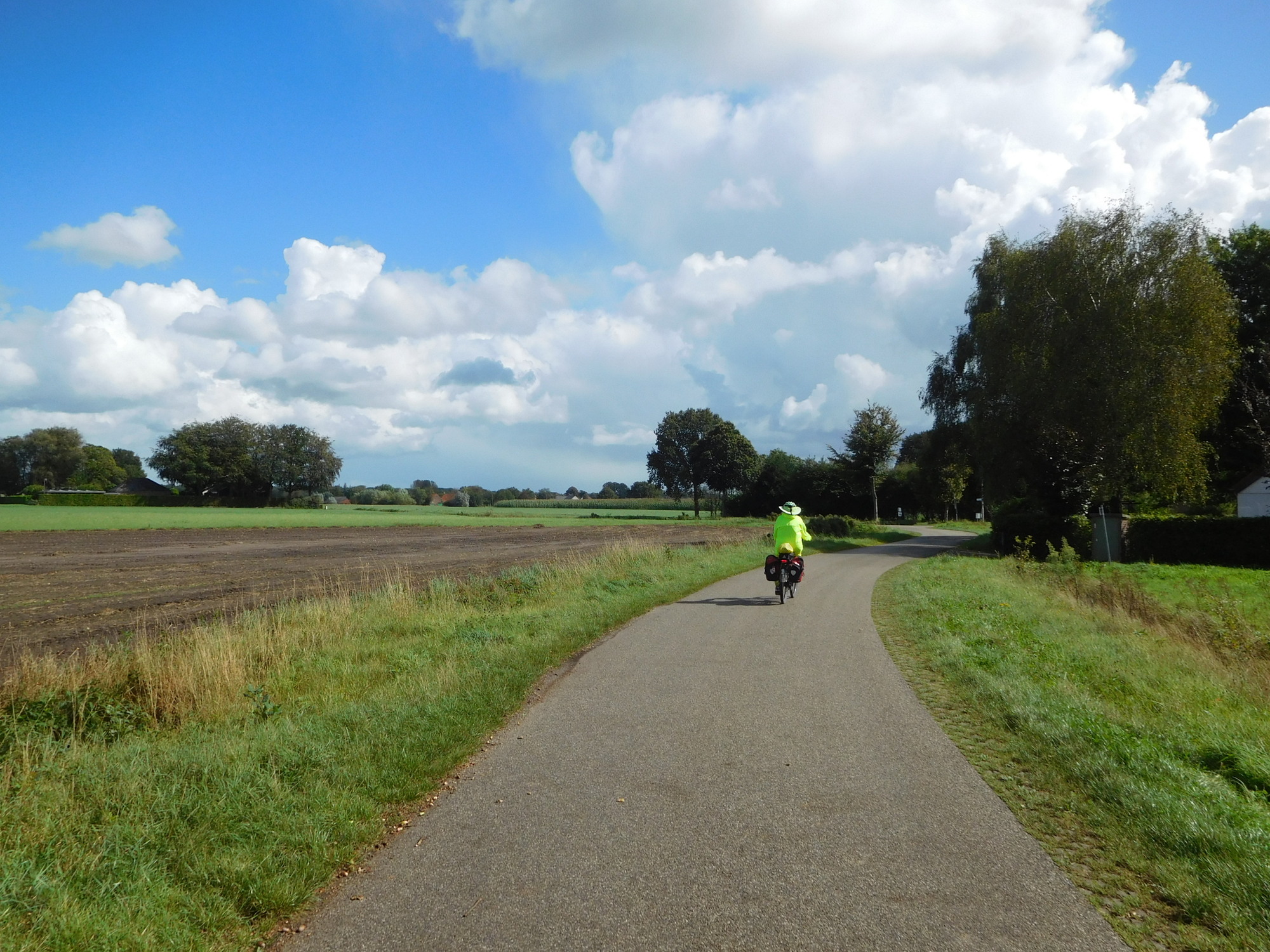 This was a day with on and off rain, often torrential, that we spent in full rain gear. The temperature was also up and down, starting around 11 and riding to near 18, before plummeting again to 12 in rain. We even had quite hard hail, and spent certain bits of time hiding under trees. Something that suffered from both the rain and the forest was our brakes, which began to make horrible scraping noises. During a time when the rain had let up, I passed a wet wipe around my rim, and came up with thick deposits of black goo. Dodie had also been complaining about her front brake in particular, and I was horrified on checking it to see that because of a loose bolt, the right side pad was basically waving in the wind. That was bad enough, but had that bolt fallen out - game over! I put new pads on Dodie's front brake at a table by a tourist info for a place called Kalmthout. They had a memorial there for two Britains killed locally by V bombs, and also a monument of an anti-aircraft gun used to shoot down V-1's directed at Antwerp. (Did not know you could shoot down a V-1 with 1944 tracking technology.)