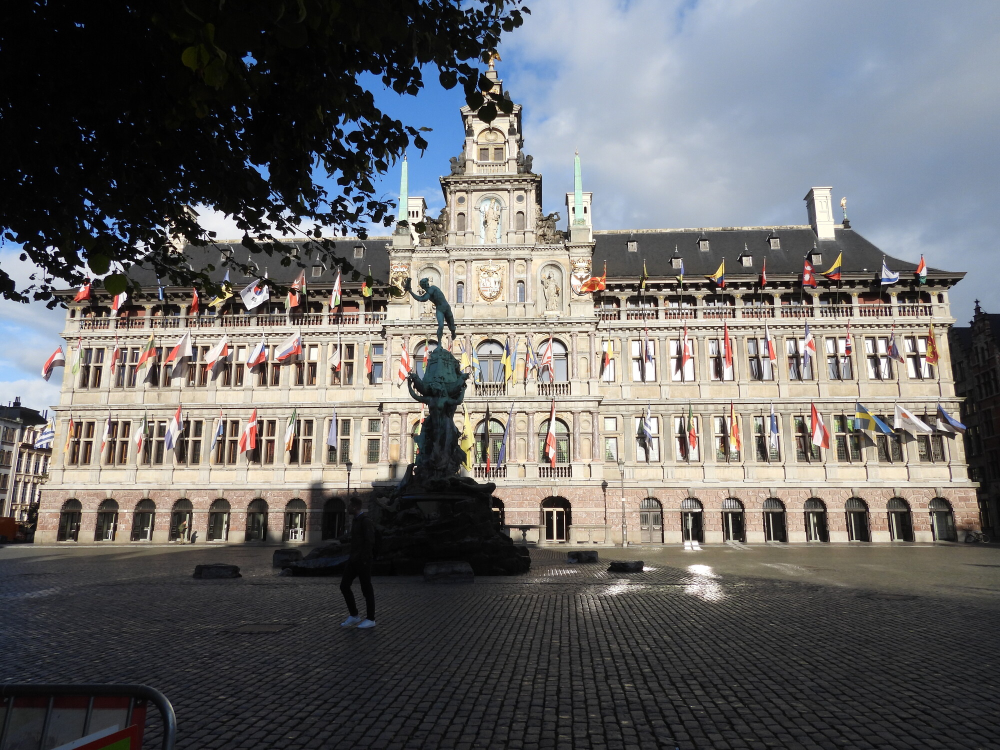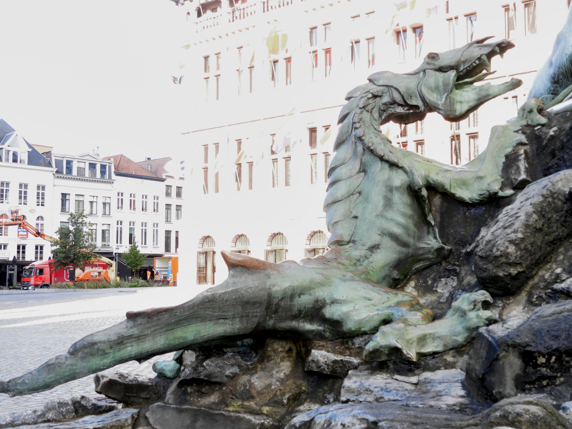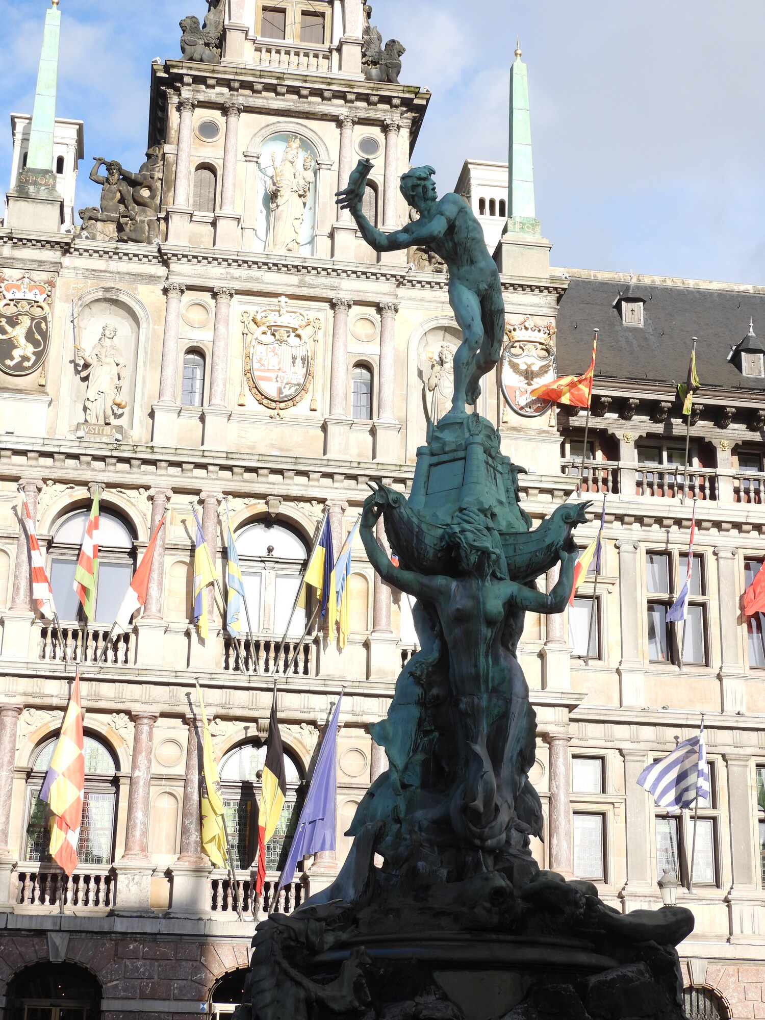 In front of city hall is a statue depicting a story about Silvius Brabo, a local mythical hero. The story holds that a giant was controlling access to the city, demanding a high toll, and cutting off the hands of those who failed to pay. Brabo fought the giant, cut off his hand, and threw it in the river.