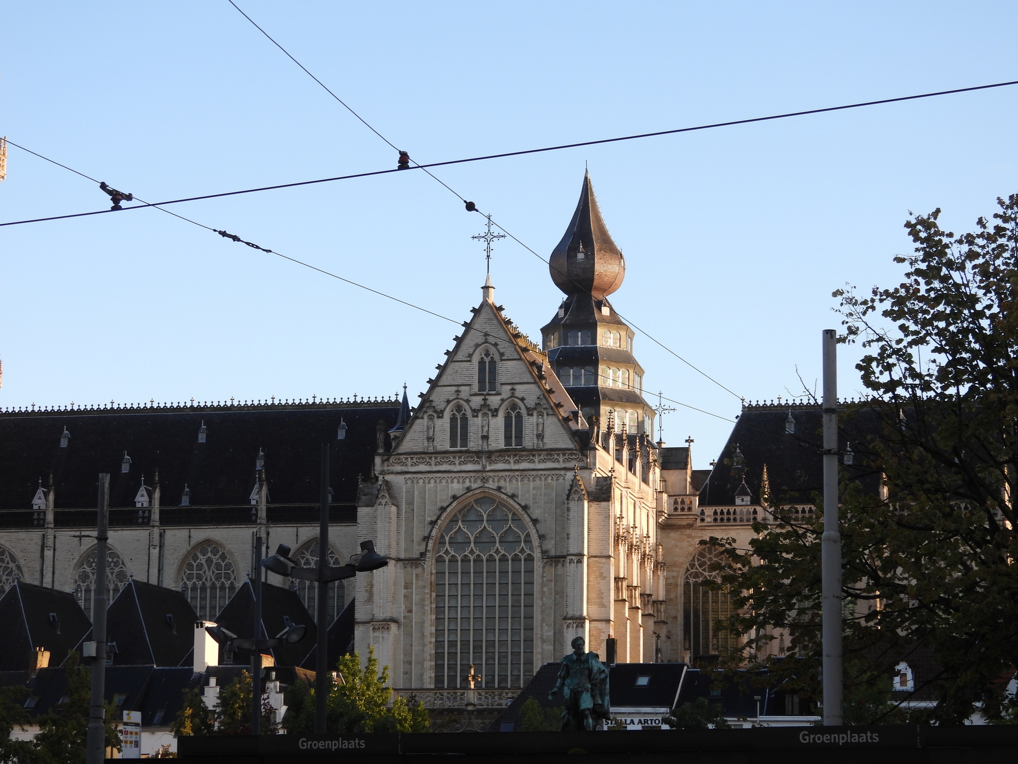 From in front of Albert Heijn I had a view at another angle at the cathedral, through some trolley wires.