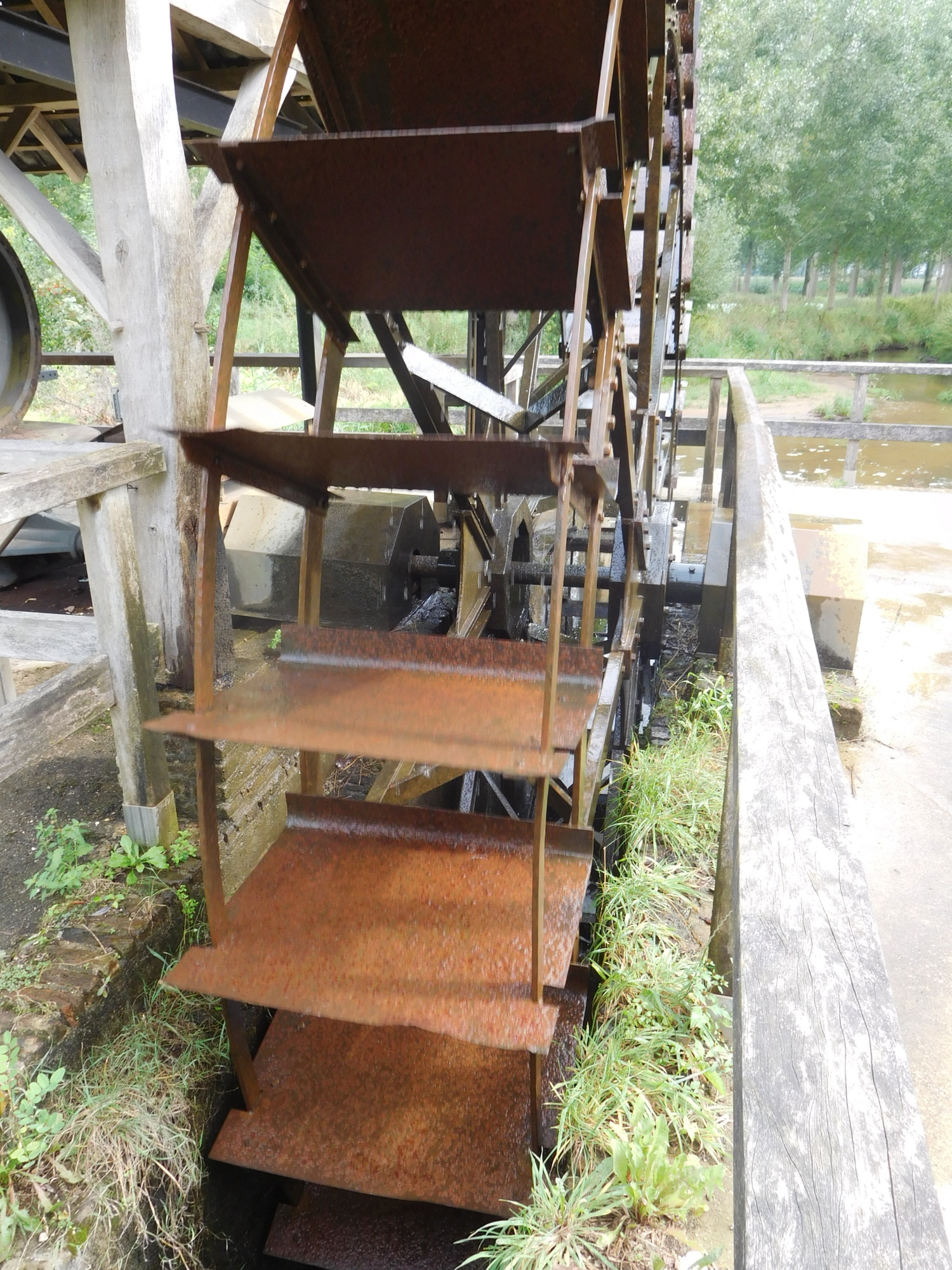 That bridge crossed a stream that was powering a water wheel in a small park. We took the opportunity of going down to it, to pull out our lunch. It was interesting looking at the wheel arrangement close up. The water is channeled to a race, where it pushed the paddles of the wheel. It's great to think how this provides free energy, forever, or until the paddles rust out. The whole thing had me thinking about just how much power a thing like this had, and would that be enough for many common uses. That's when I completely independently (of the rest of humanity through history) invented the idea of a dam upstream from the wheel!
