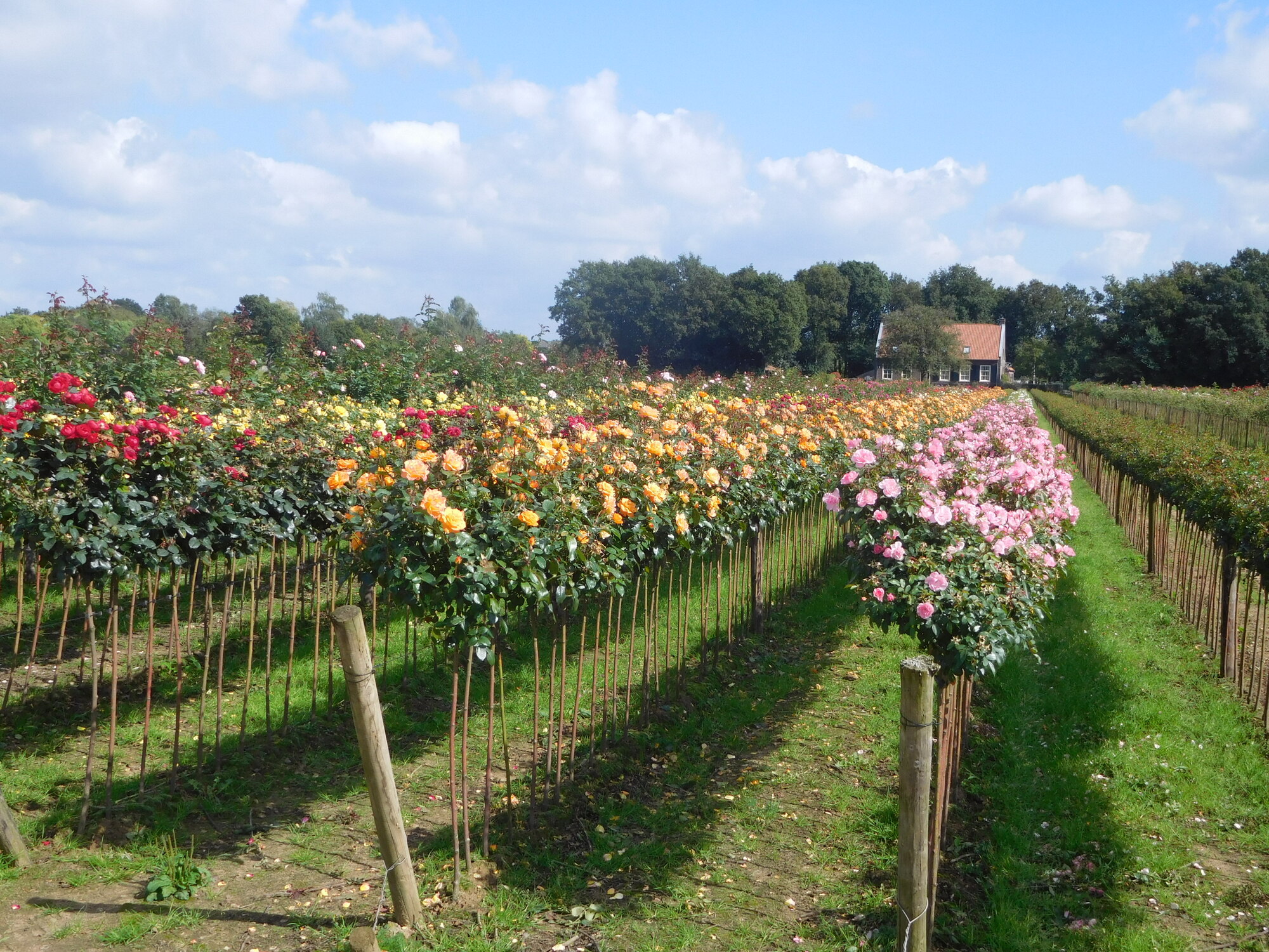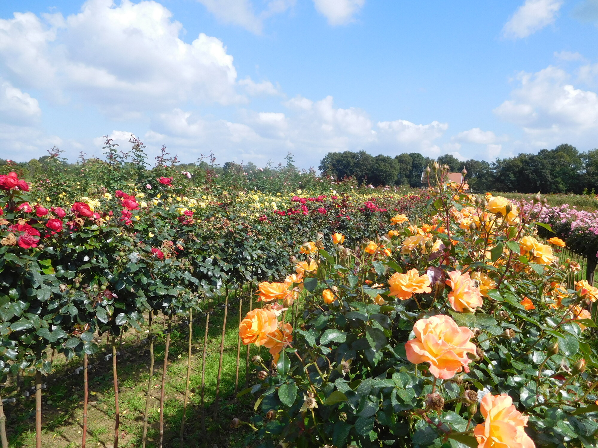 We next came to a large field with orderly rows of some kind of tall shrub, with leaves coming from a narrow woody stem. We looked at this hard as we cycled by, but could not identify it at all. The mystery was solved as we came to a further field with the things in bloom - tree roses! All through our ride these last days, we have passed very large plantings of nursery type stock. This country, of course, is famous for that kind of stuff.
