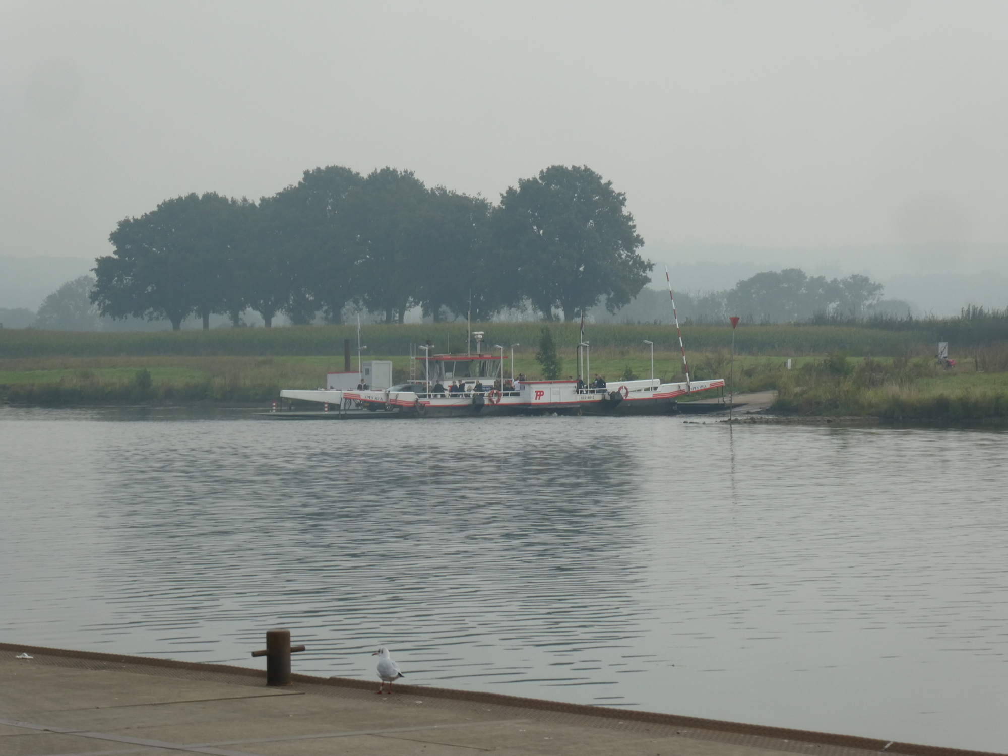 To get going again, we had to cross the river right at Cuijk. The ferry was right there, starting to come to us in the morning mist. The ferries seem to cross back and forth continuously, so we have never had a long wait, for the many crossings made in a day.