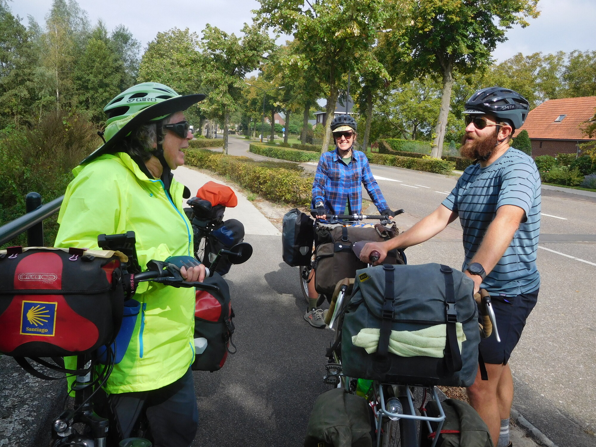 We continued now past various towns and fields, all much the illustrations that started this page. But when we paused on a small bridge, and native English speaking voice from behind made a comment about "from Canada". This turned out to be Brad and Loren, from Colorado. They too were on a 90 day wander around Europe, maybe also ending up in Spain. Of course what ensued was the classic cycle tourer meetup jabber about the route, equipment, and so forth. It's always a lot of fun. This was Brad and Lauren's first long tour, and since they had only vaguely heard of cycle touring blog sites, I complimented them on launching such a long trip without moral support, such as we draw from Cycleblaze. We ended, of course, with hopes we would meet again - maybe in Spain!