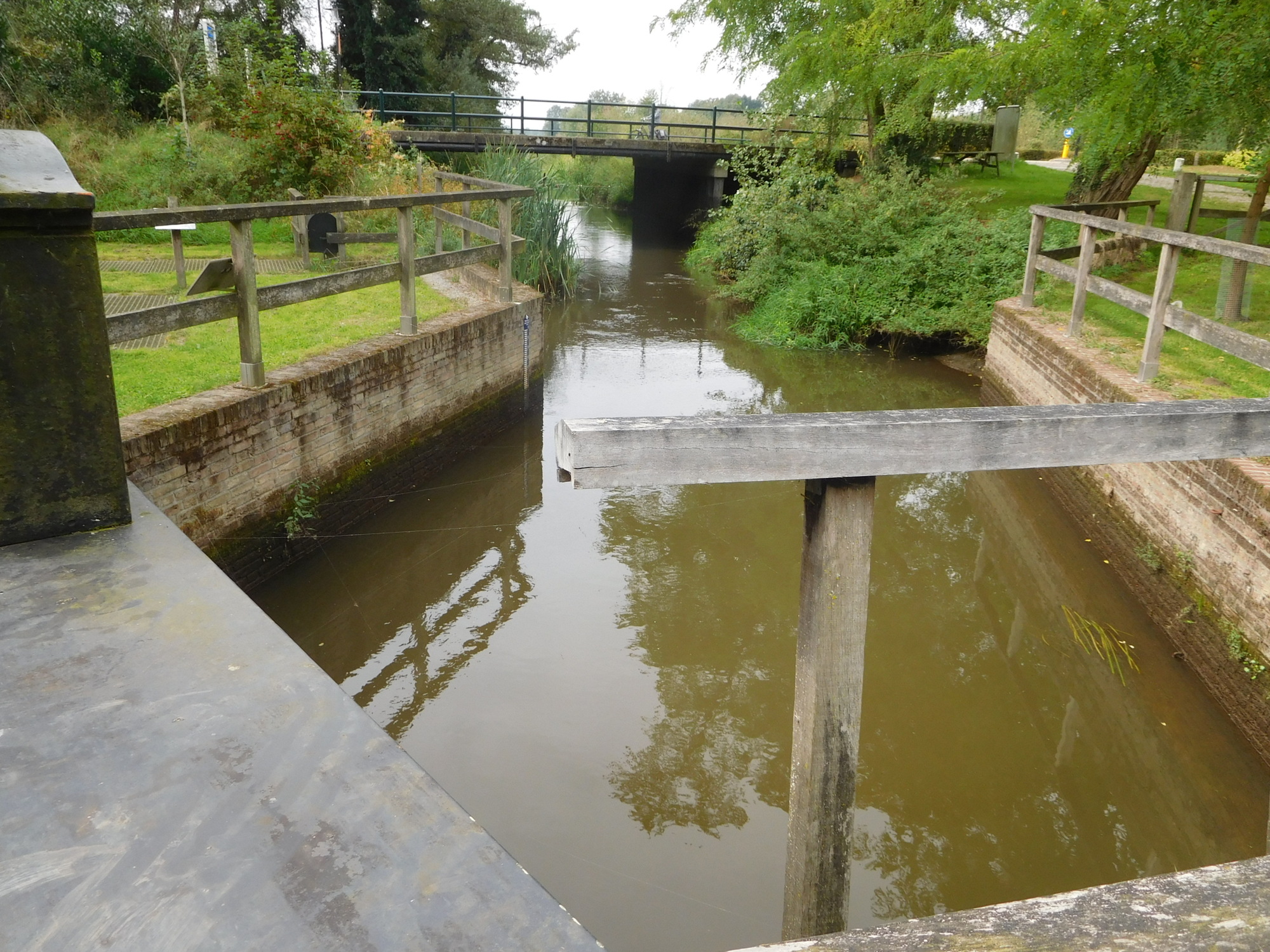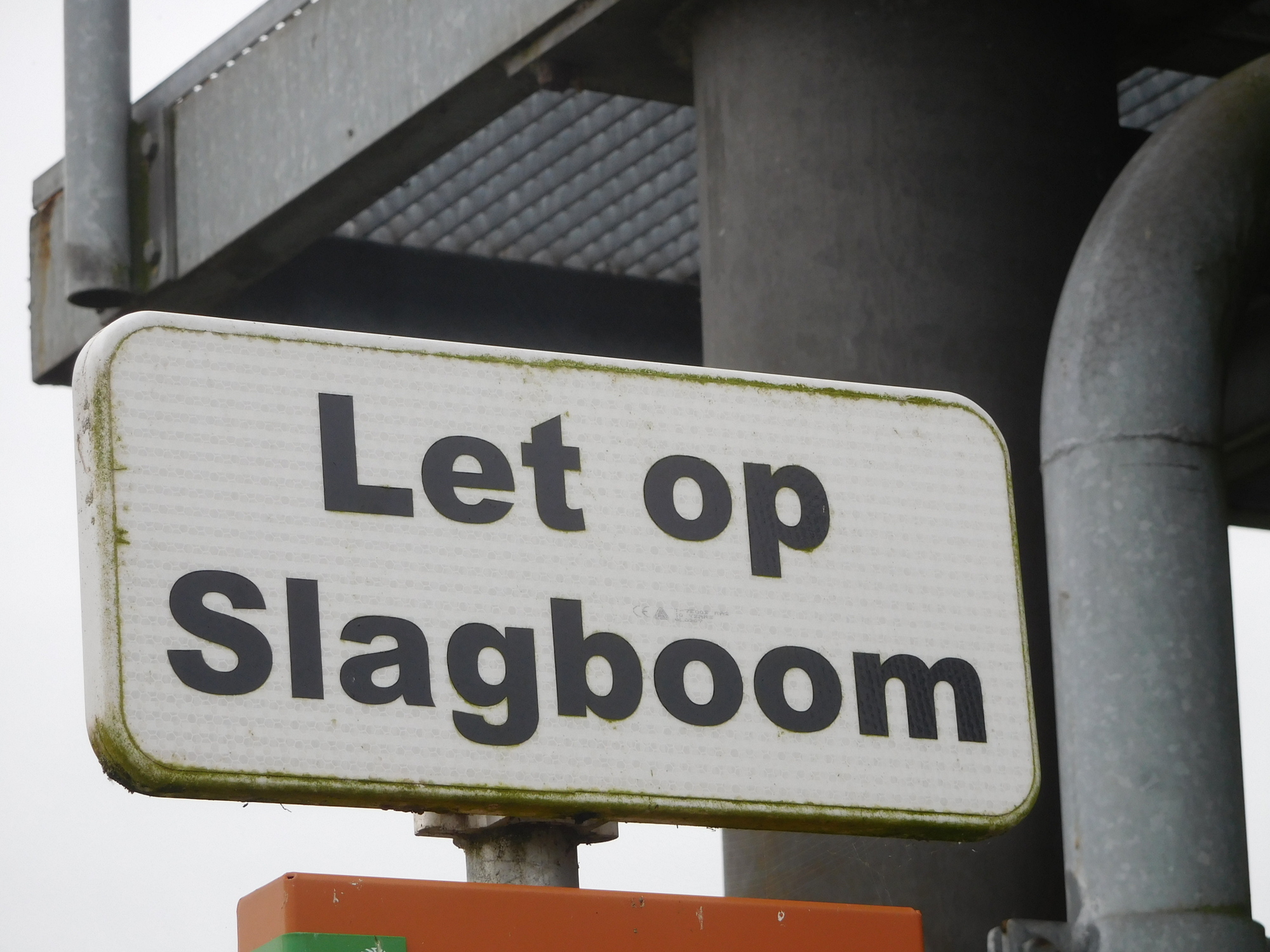 We said a nice final goodbye to the lady and dog, and took to the path by the river. We passed a sign of the "Let op" variety that so tickles our childish fancy. This one features "slagboom", which no matter what we fantasize, actually means "barrier".