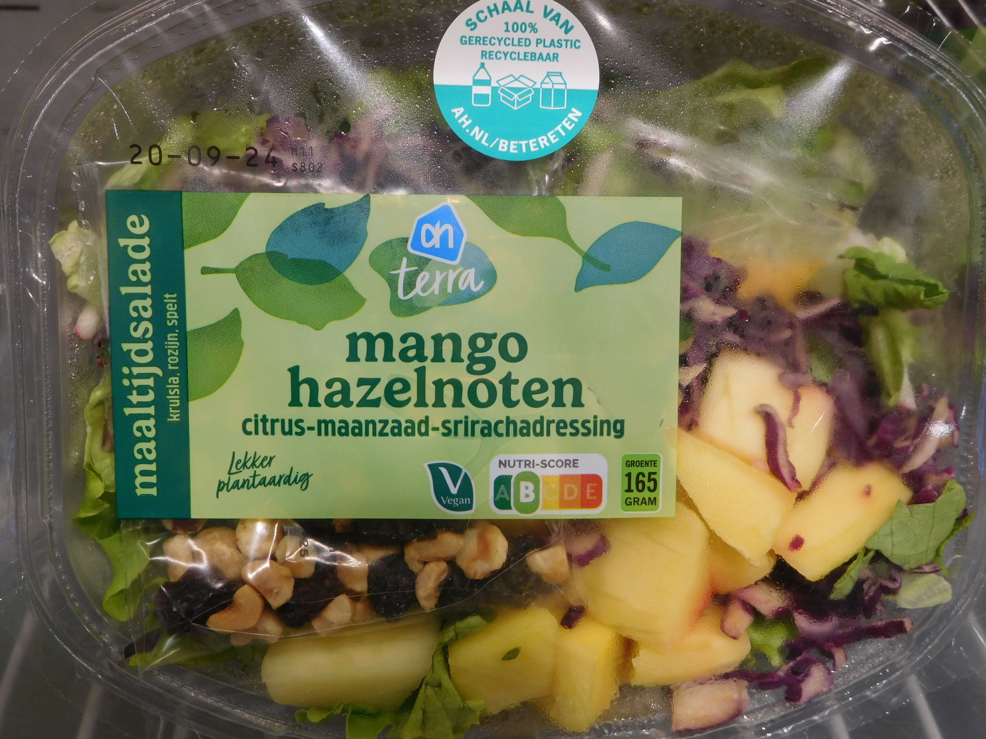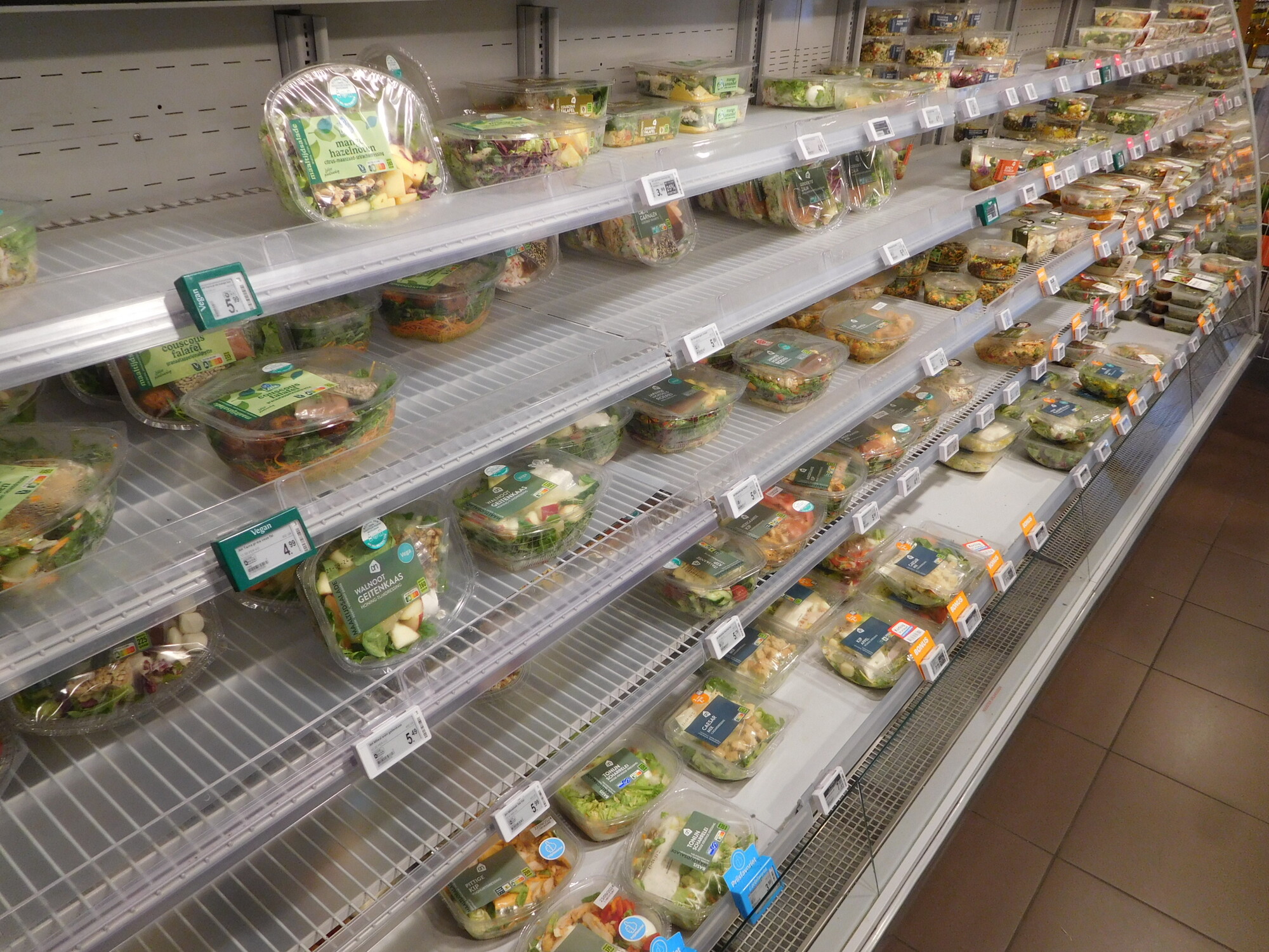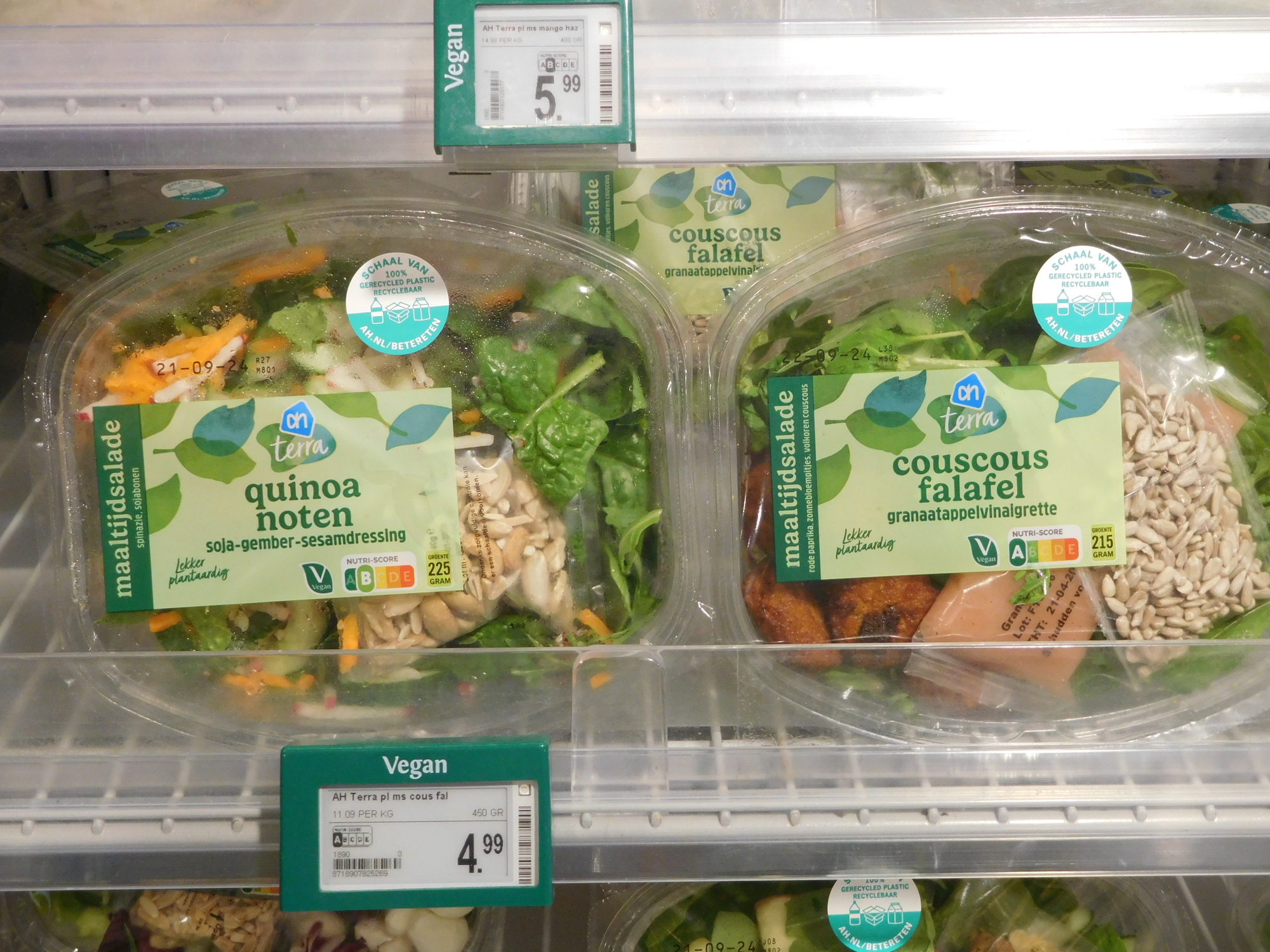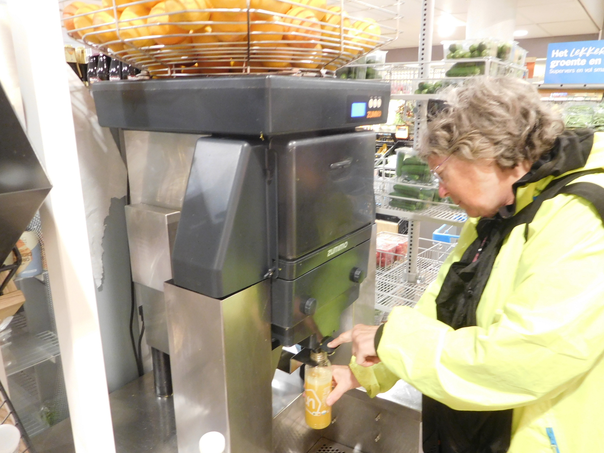 In Albert Heijn we appreciate the fresh orange juice machine. 250 ml of fresh juice can power each of us for about 10 km! The next big feature for us is the selection of fresh, packaged salads. They have really a lot of them, with great varieties that include cous cous, falafel, mango, nuts, and similar tasty and healthful ingredients.