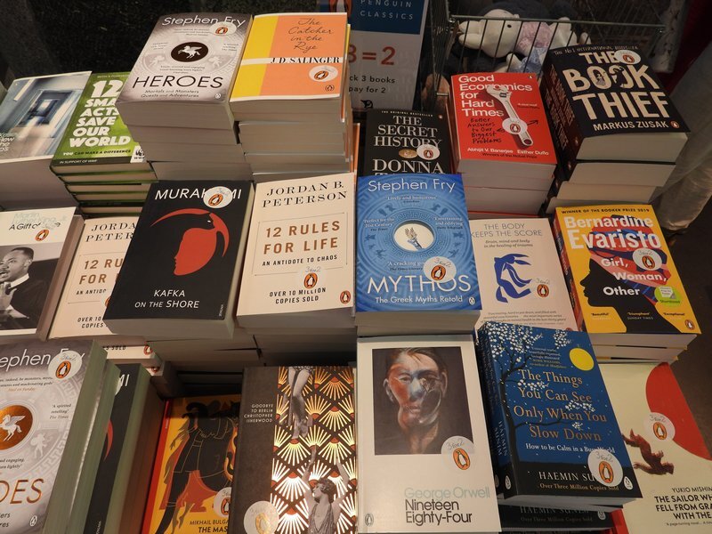 There are both Dutch and English books here. We found some authors and titles that would be good to read - a mixture of current stuff and golden slightly oldies. That is, titles by Stephen Fry and Yuval Noah Harari, and Leonard Cohen and Martin Luther King, and hmm, Jordan Peterson.