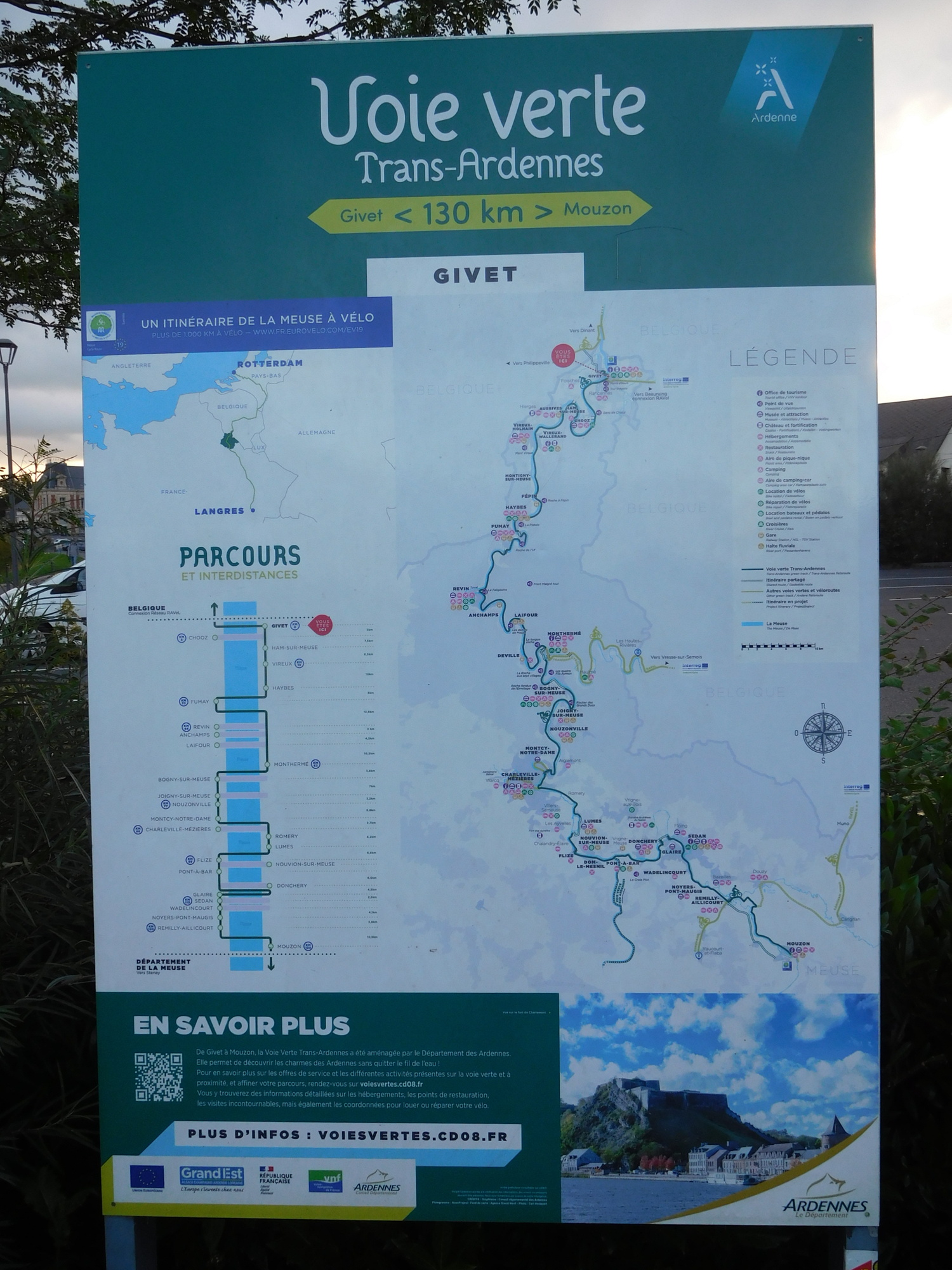 The Voie Verte, as shown on the sign, runs 130 km to Mouzon, following the Meuse. That's swell, and we had even found a map book for it in the hotel, but we will be sticking with the river for a further 250 km beyond Mouzon, to Langres. We have no idea what conditions will be like on that bit, but for now, Voie Verte it is!