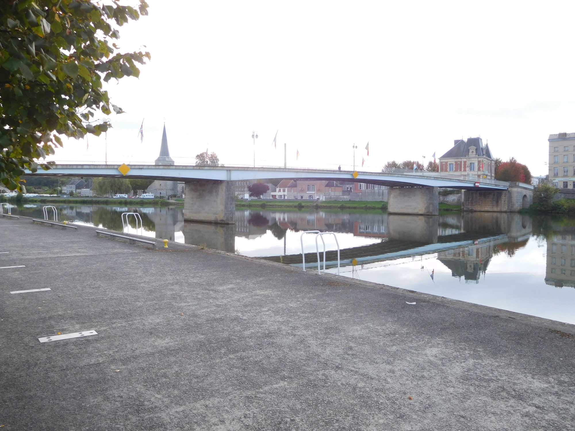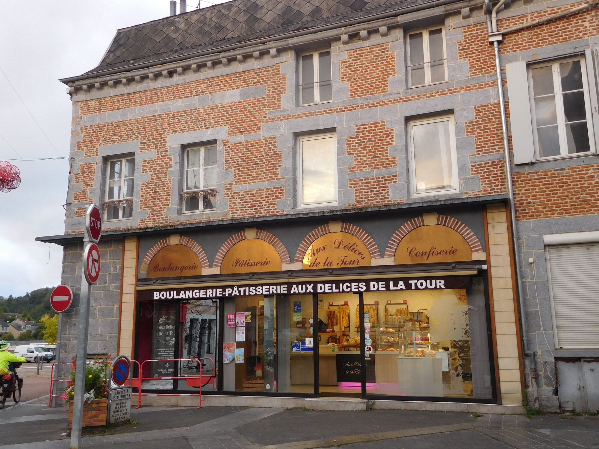 By next morning, Givet was looking brighter (though I had to boost the brightness in these shots a bit). And as we cycled toward the water, the place became a lot more interesting and attractive. Interest and attraction peaked, of course, when we found the bakery by the water!