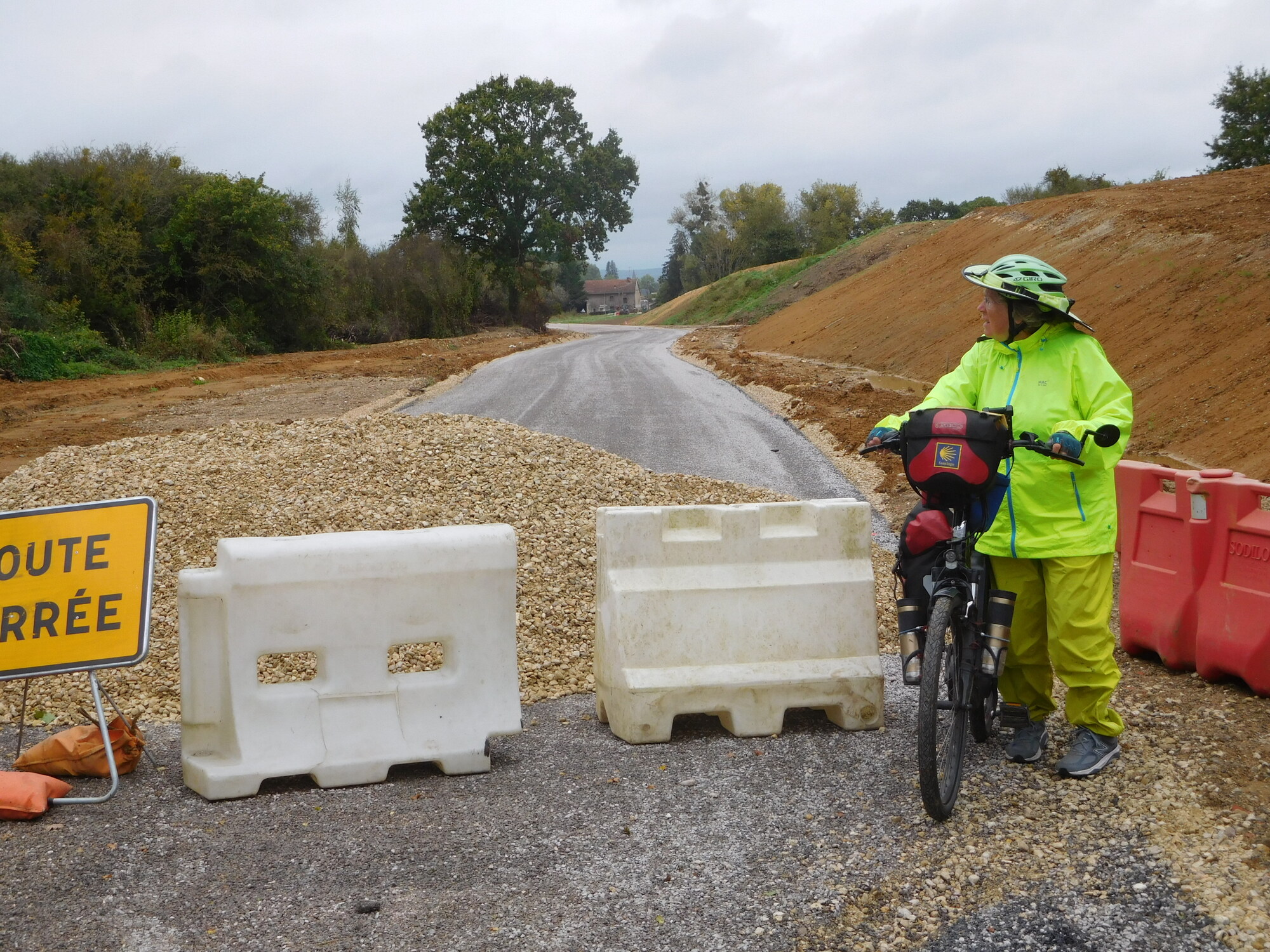 Near Luzy St Martin we encountered a sign signalling Route Barée in 2 km. We ignored that, of course. Then there was another one, warning of the closure in 1 km. We hate that, because if the road is really blocked, then the backtrack is rather long. When we reached the actual blockage, a sign offered a bicycle detour of 5 km. When you are tired from fighting wind and hills, 5 km can seem an awfully long distance. But in the distance we could see two workers. Dodie sent me on ahead to talk to them to see if maybe we could sneak through. They said yes we could, but the detour would be more scenic. I told them that for 5 km I did not care about scenery. So I gestured to Dodie to come on down, using big motions of my arms. There was no reaction from Dodie, way down at the first barricade signs. This was strange, because I know she had that telescopic vision, that can spot a buzzard at 300 feet. The workers looked on and said it looks like she does not want to come. So I cycled all the way back, to get her. "Didn't you see me waving? What happened to that telescopic vision?", I whined. "I was looking at my screen", was the reply. "I'm having to cycle this stretch 4x because you are watching TV?" I whined again. "It's not 4x, it's 3x" was the reply. Who knew, I married as mathematician!