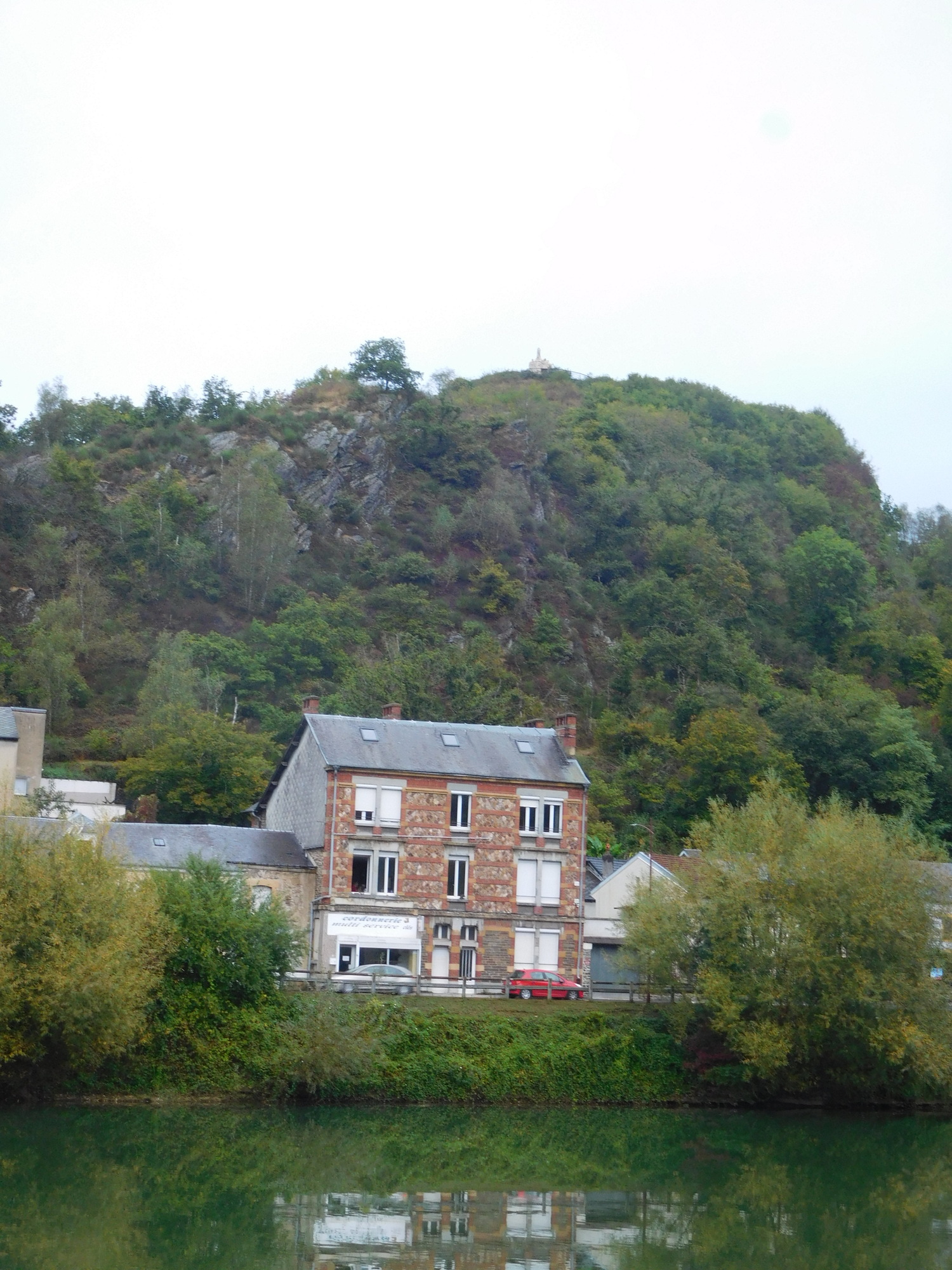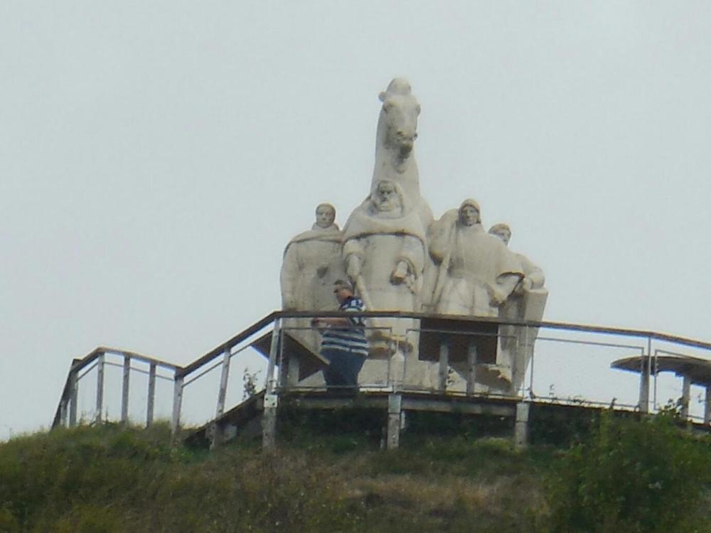 Dodie was reading to me from a fascinating blog last night. It was from 2015 and was called Grampies Ride Again. Apparently the Grampies had swarmed all over the Meuse, on their unassisted folding bikes no less. They knew all about the Ardennes, and shockingly, they went into Charleville-Mezieres, and gave complete coverage of the Basilica, that friend of Picasso, and so on. There were many things that Grampies 2024 seemed to weak to do. Another example, Grampies 2015 knew all about the legend of the Aymon Brothers, at Bogny. They provided this photo of the memorial up on the mountain: