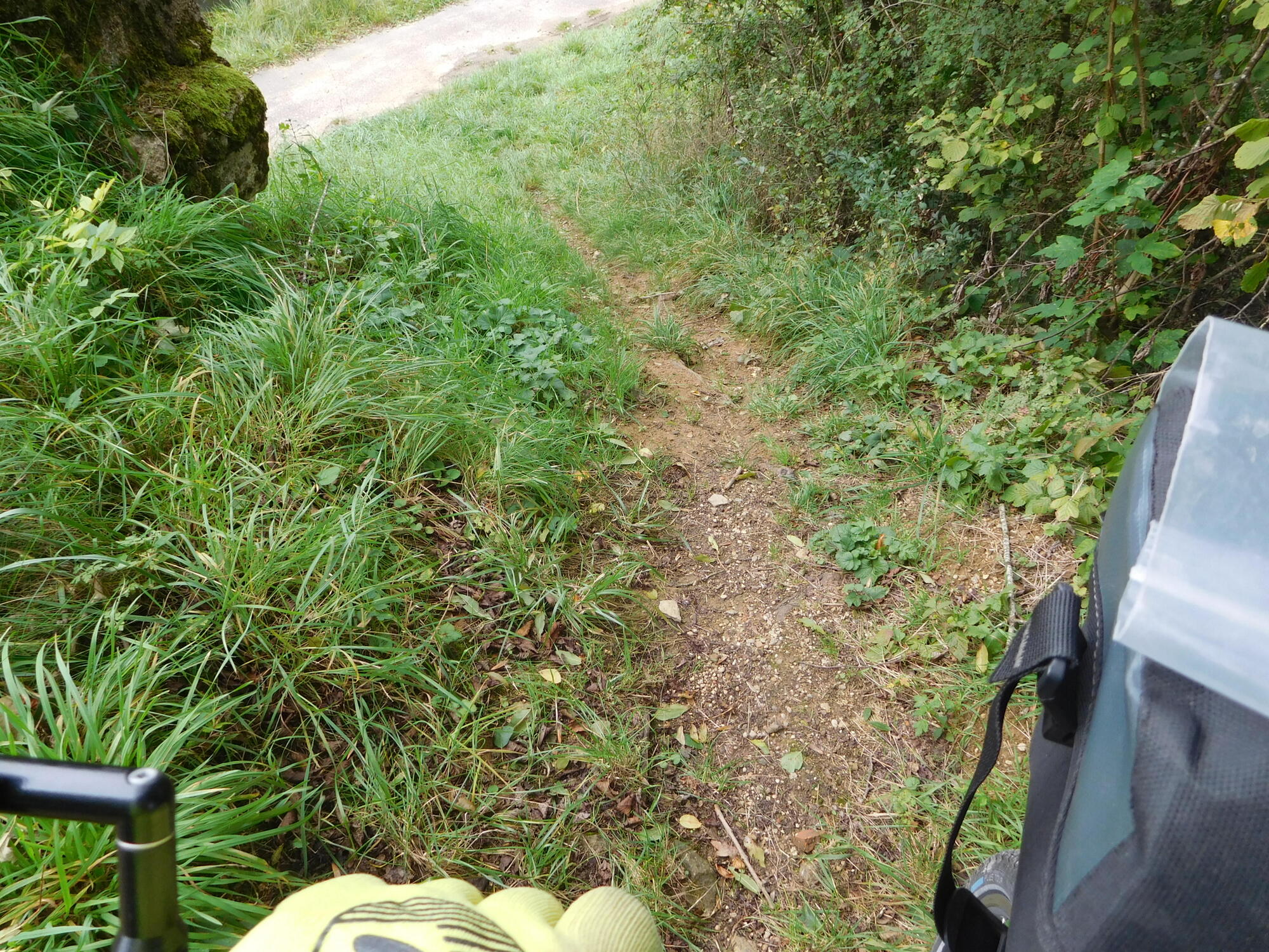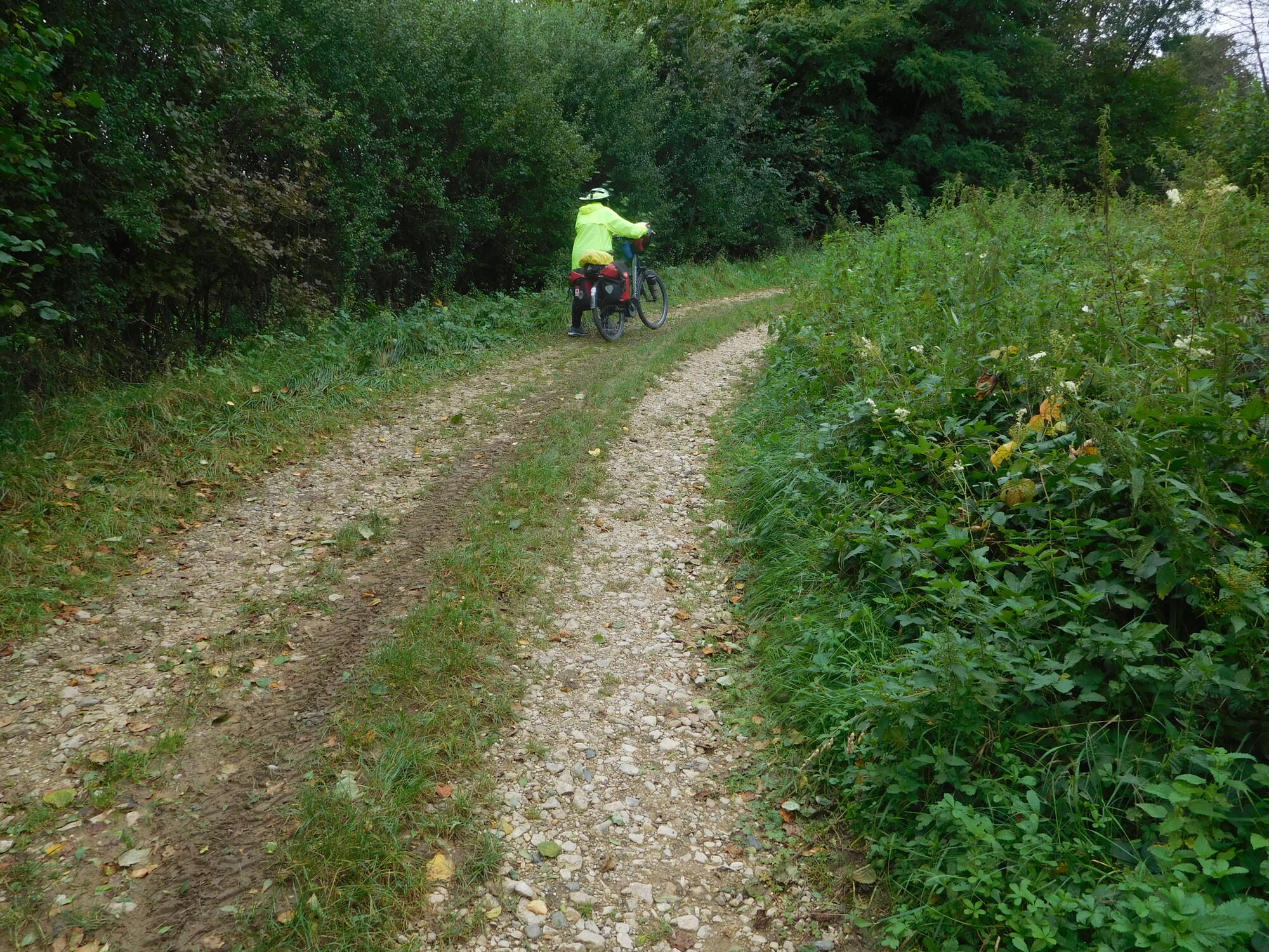 The high and the lunch saw us through some fairly serious climbs, such as after Neuilly-l'Eveque, but we were fine, until the powers that be helped us out with a "voie verte". Voie vertes are often great, but sometimes they are "green washing" for the idea that bicycles don't count, so let's toss them onto that old dirt track, and call it green. Below you see Dodie on the voie verte approaching Langres.