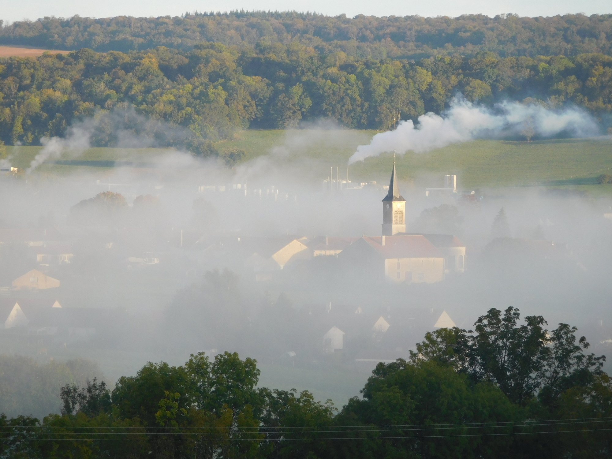 When I snapped the shot below, I thought I was getting a great image of a church and town, lost in a valley with frosty mist. I guess I did get that, but here in the "lab" I also see that lots of that mystical mist is exhaust from some sort of factory installation. I suspect that will keep me from winning any sort of awards for the great shot!