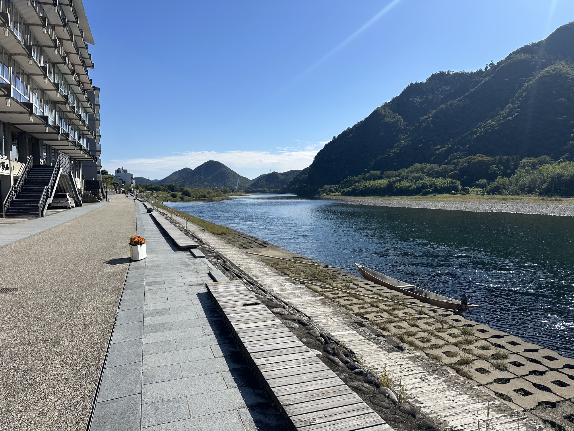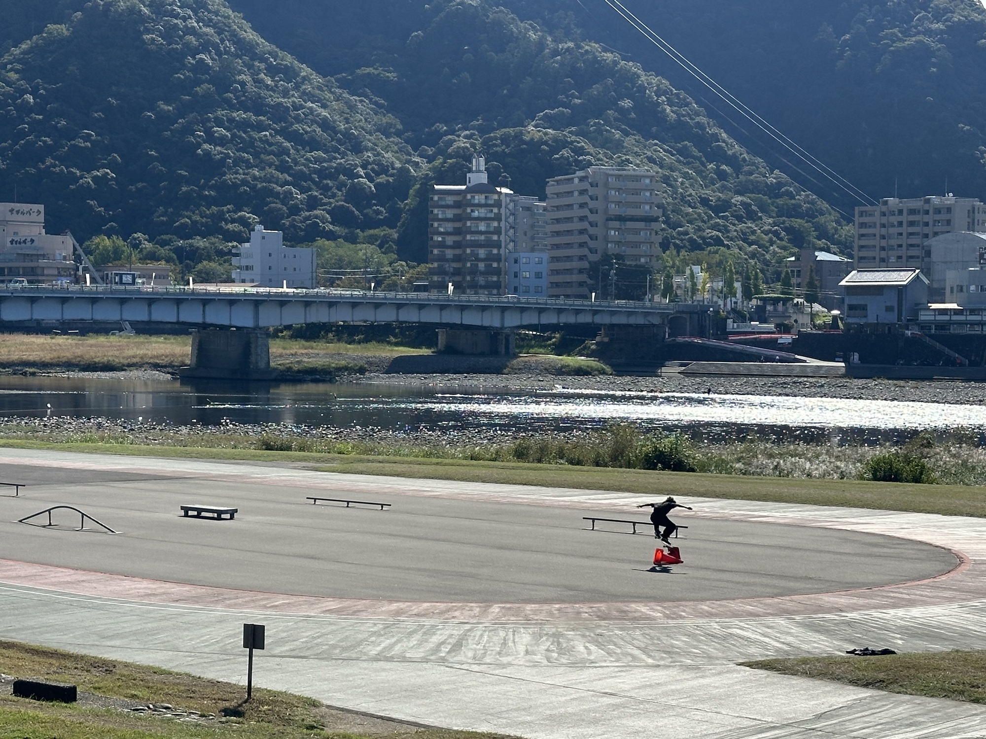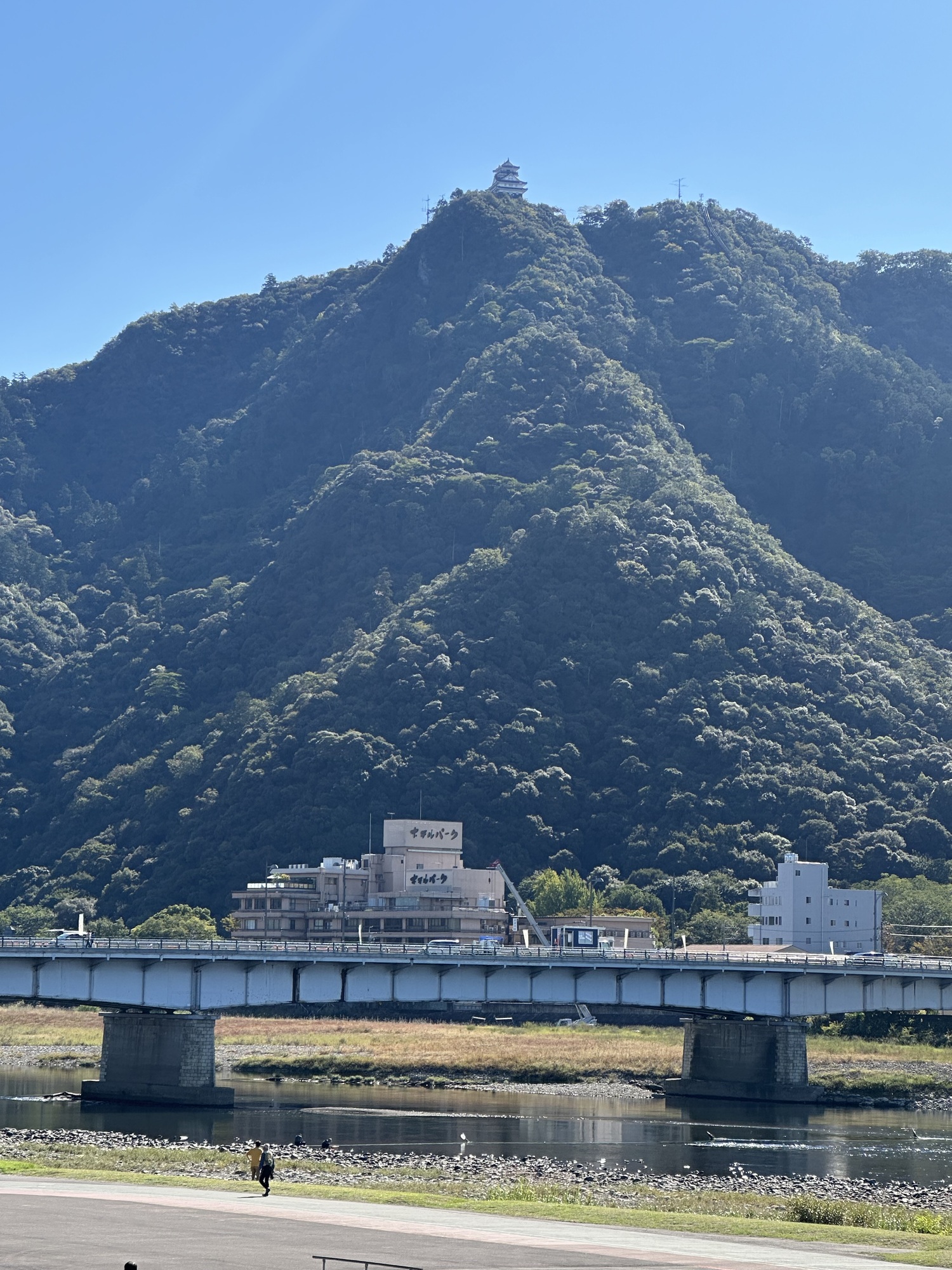 As we got closer to Gifu, the city downstream from Seki, the river scene transitioned from a fishermen’s wild paradise into a riverside city sports park, with playing fields and tennis courts and one almost empty skateboard park lining the banks. We took a break here, admiring the view of Gifu castle, perched high on a mountain top across the river (we were not tempted by the climb up — there appeared to be a cable car line but it didn’t seem to be running).