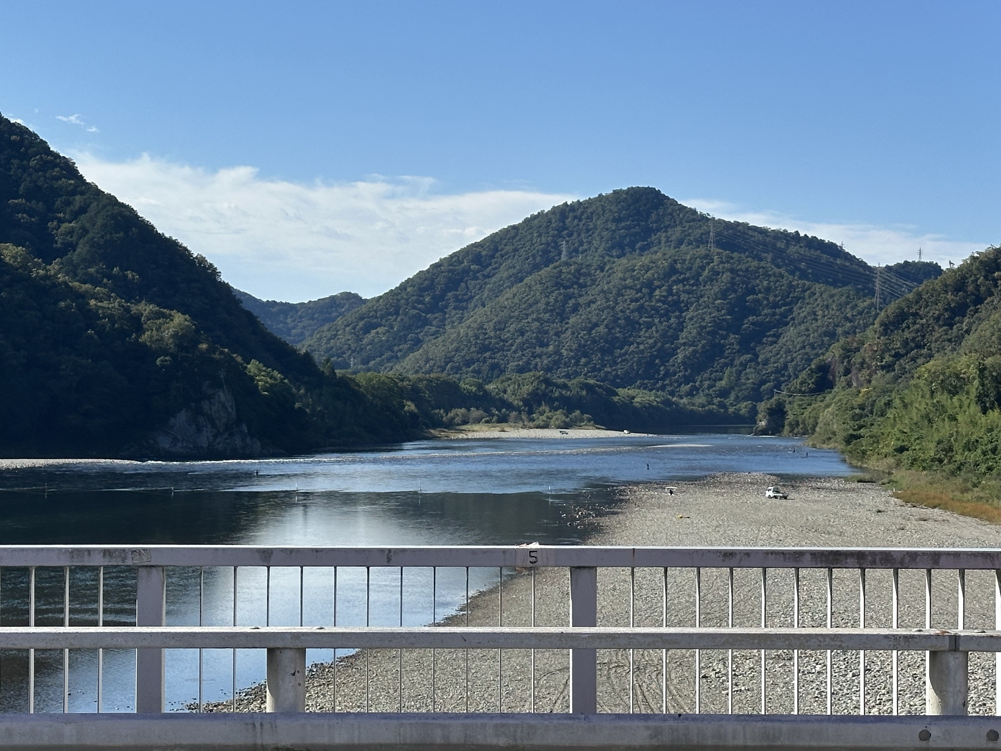 Seki is not a big place, so we were on our way out of town fairly quickly, following the bends of the Nagara River southward. The river, on this sunny fall day, was attracting lots of fishermen to its banks. Even when Tom ducked down what appeared to be a deserted woody path for a quick pee, immediately three pickup trucks full of fishermen turned onto the road.