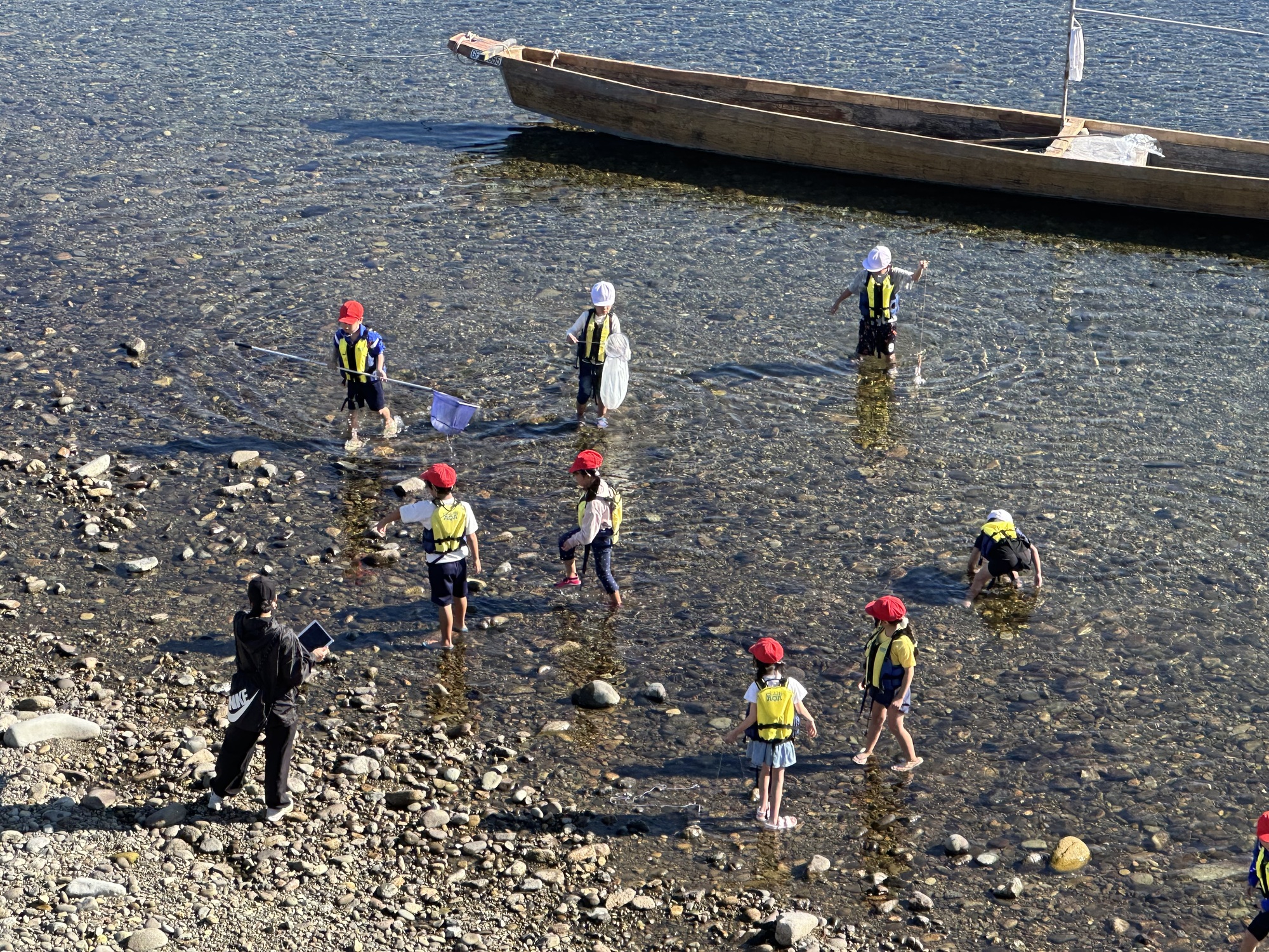 Our route took us over a bridge from which we could see down into the wide, shallow, clear river — and the big fish that were hanging out in the middle of the stream. At the rivers edge a class of young kids was having a field trip, wading and collecting rocks. A lot of excited chatter rose up from the group.