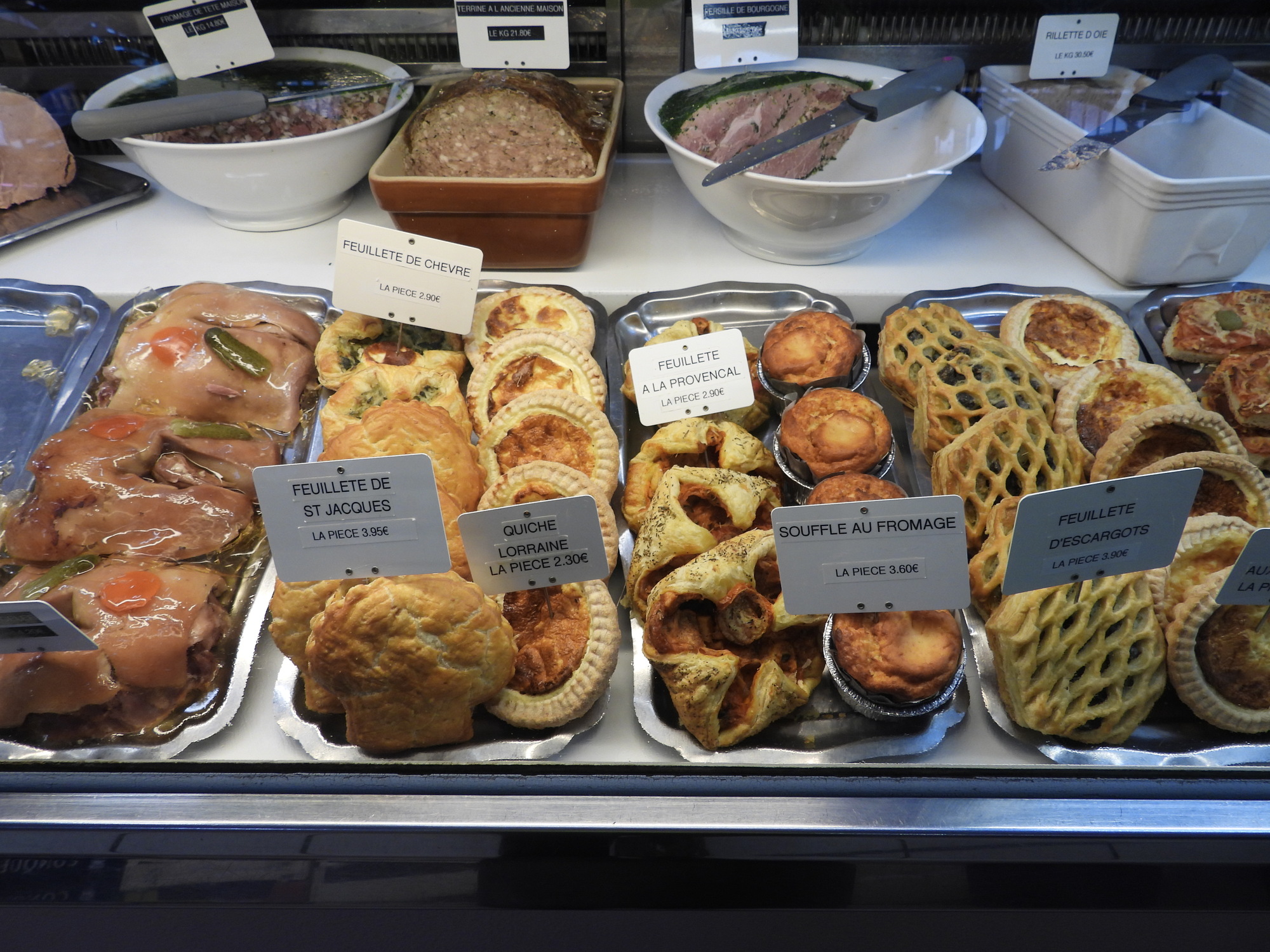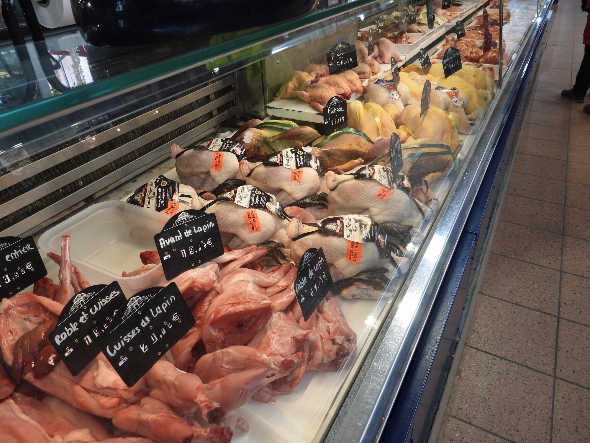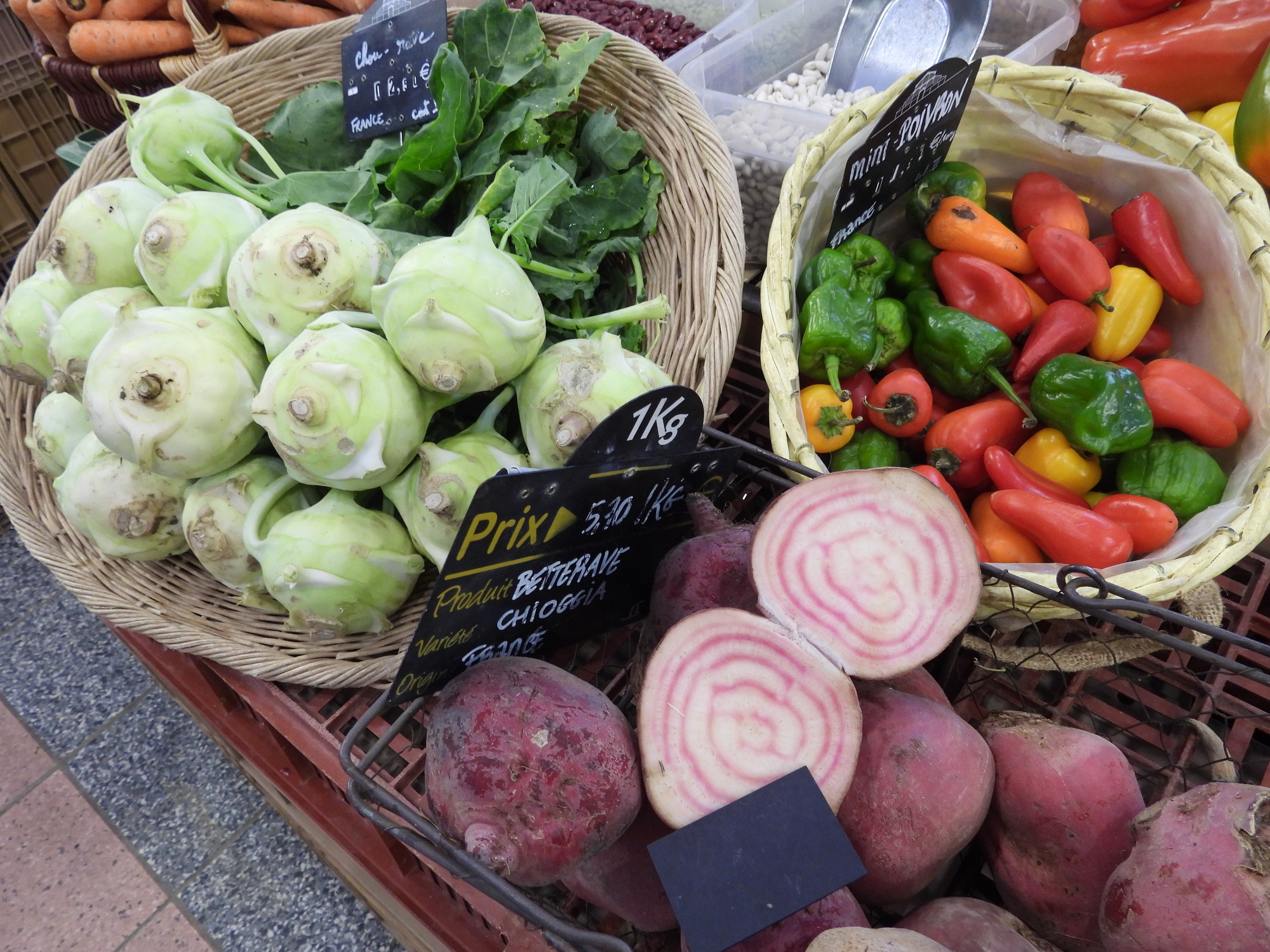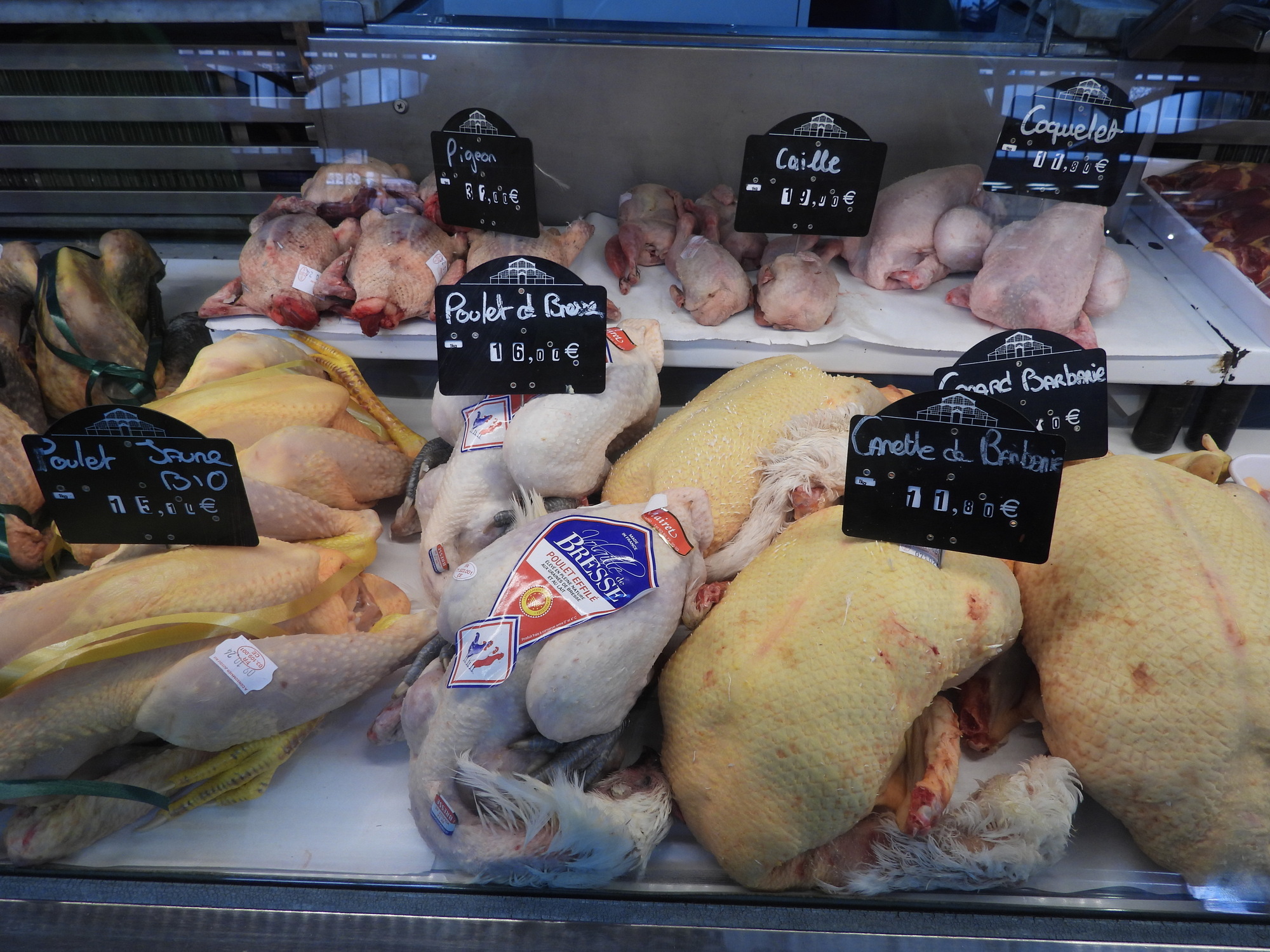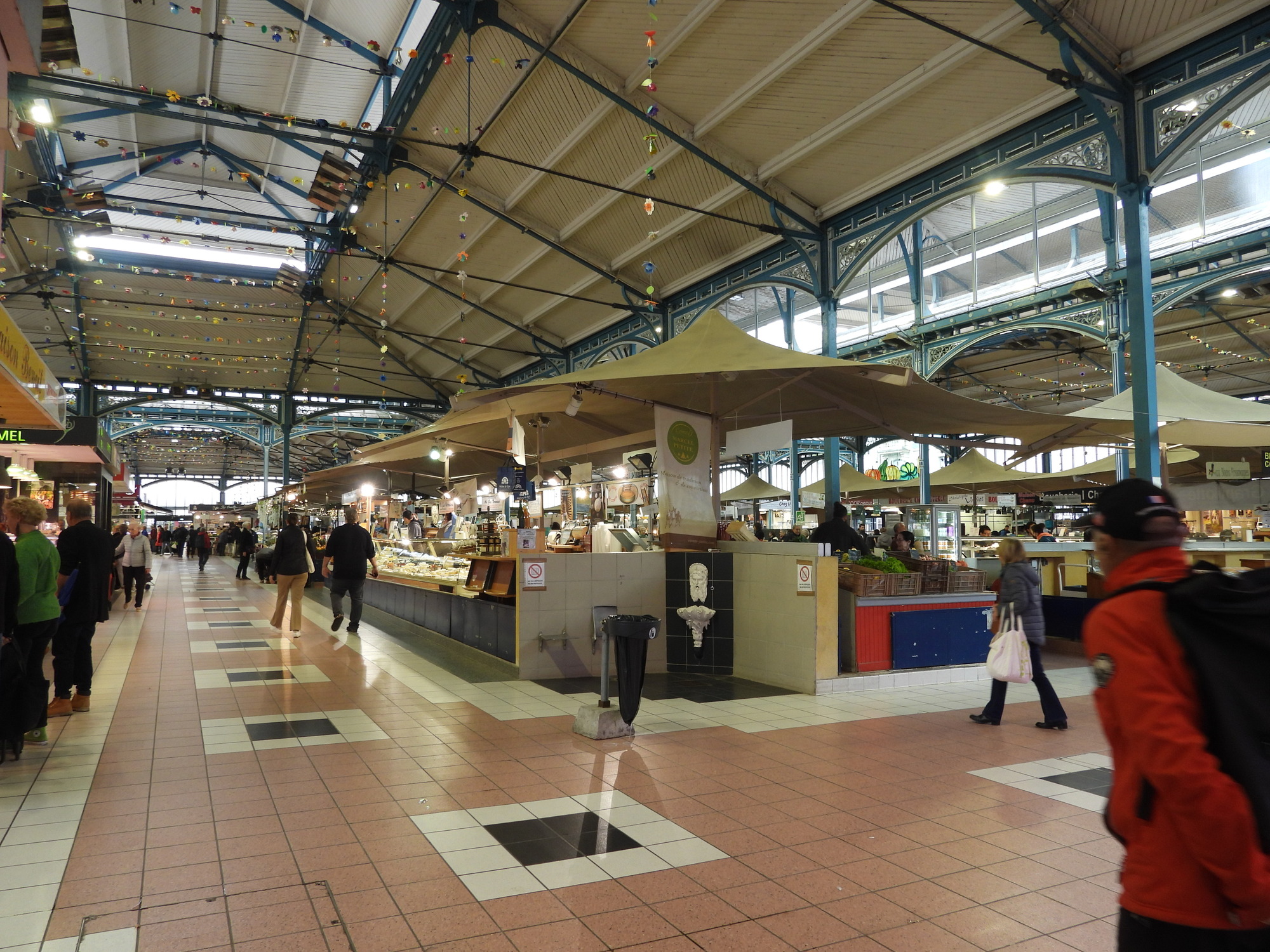 We were pleased to find that today is a full fledged market day at Dijon's indoor market hall. Often I just go wild, showing all the sea creatures, vegetables, baking, and the rest of the giant cornucopia that makes up a French market. This time I tried to be a little (very little) more selective, showing some things that are so darn French! In practice it's kind of useless distinction, between showing things that are fairly uniquely French and showing everything. Even a common orange, for example, at one of these markets is probably displayed in some artistic French way.