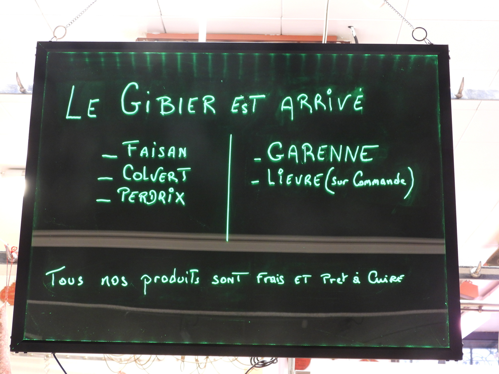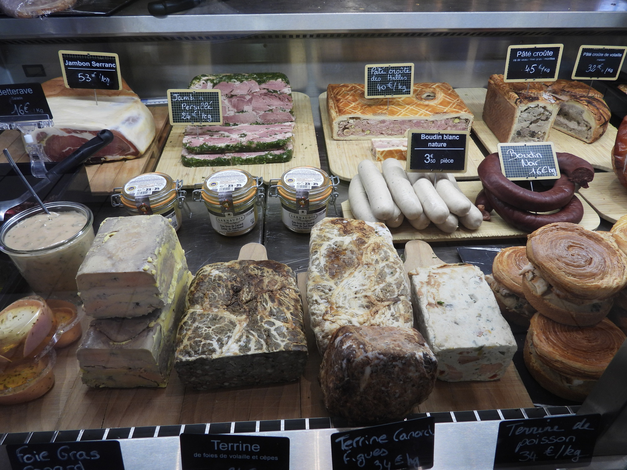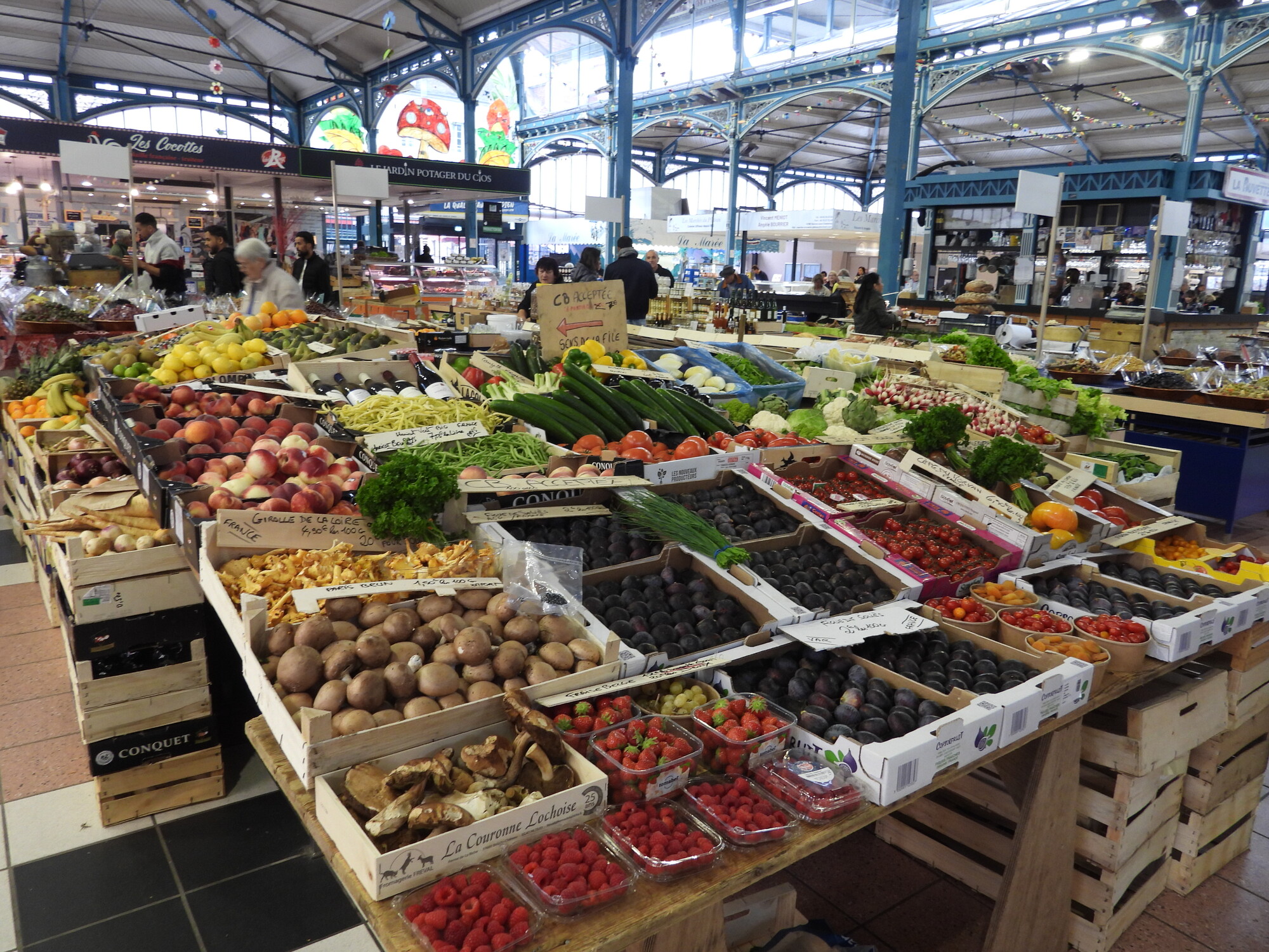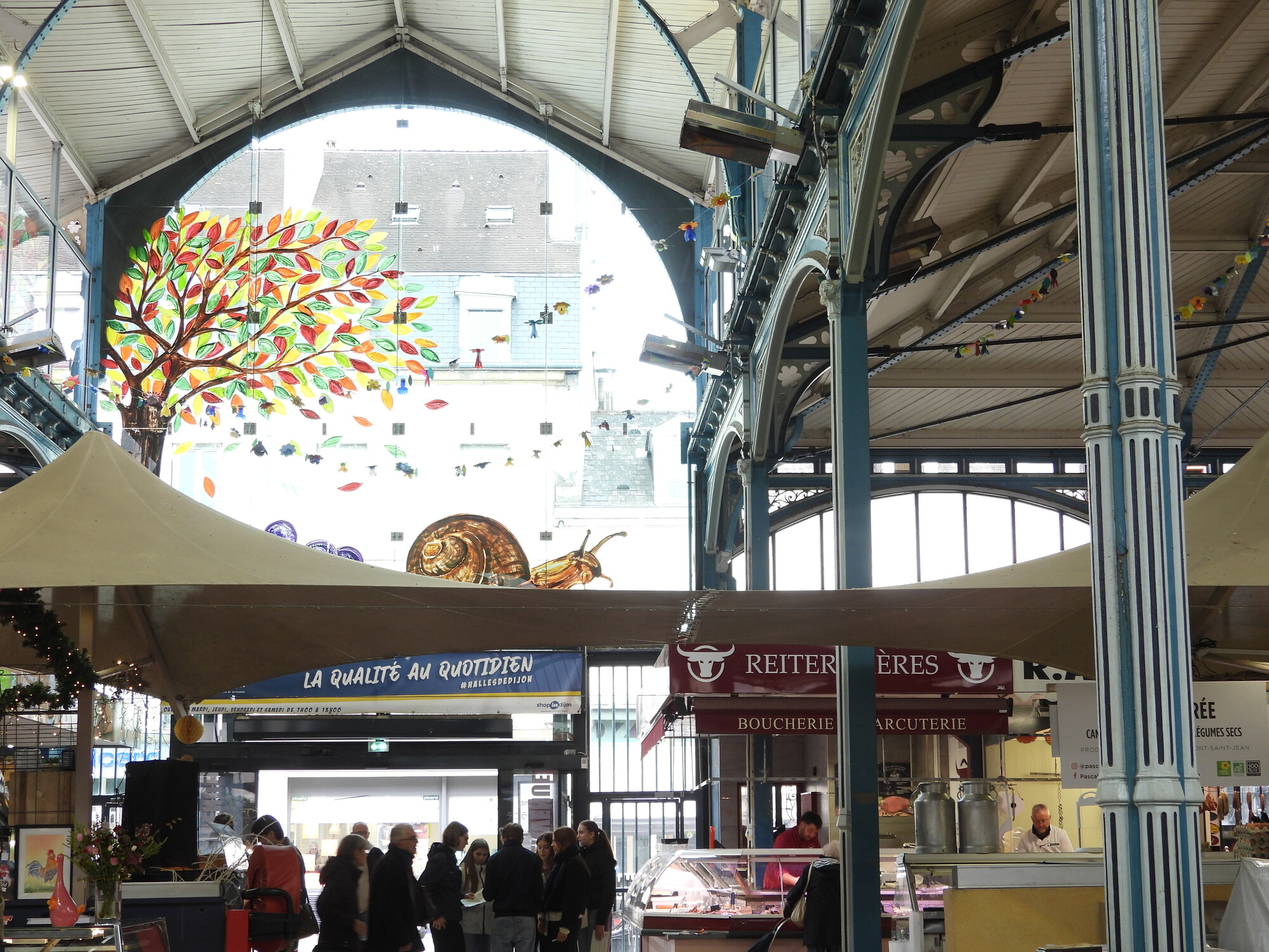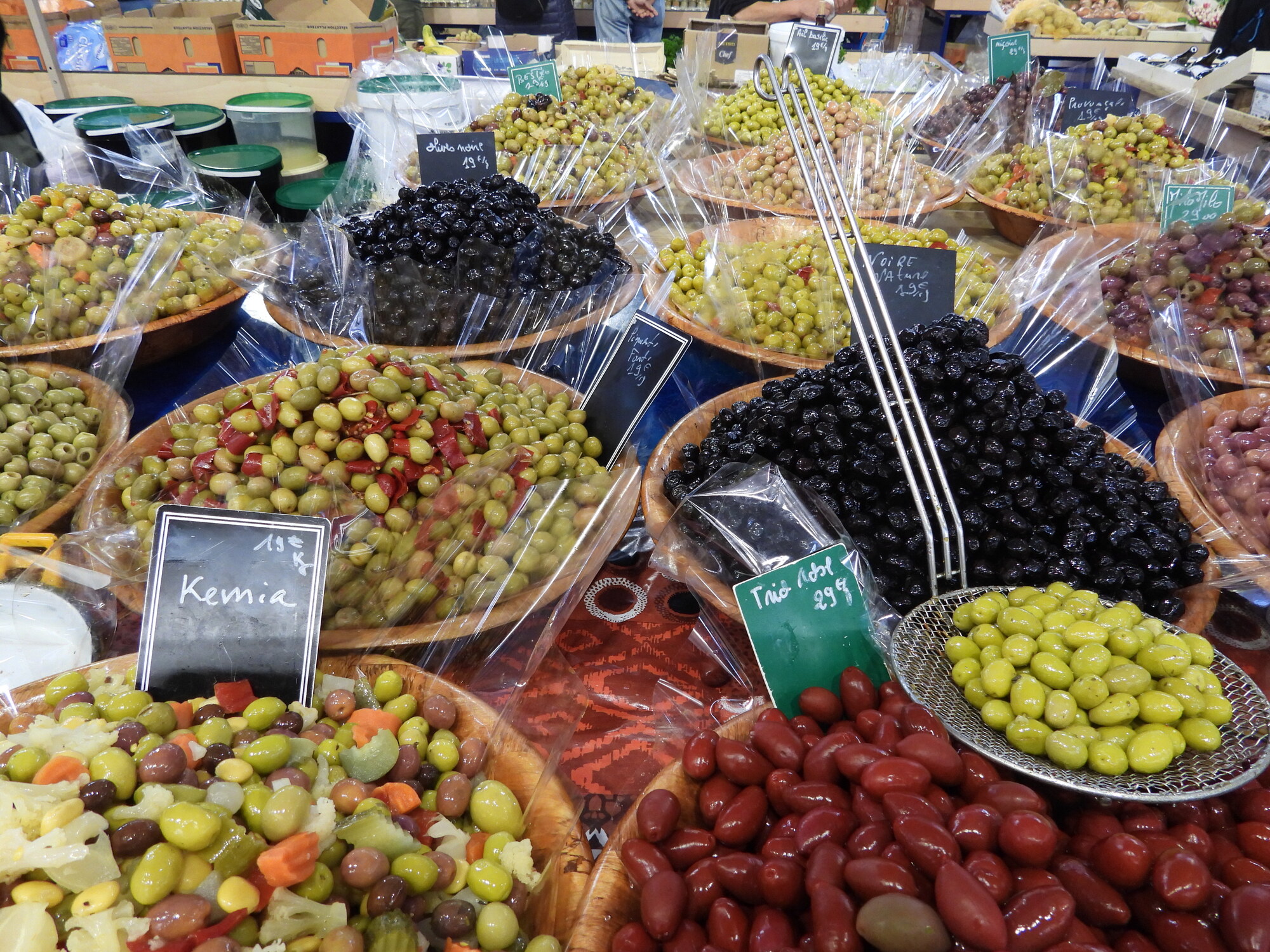 We were pleased to find that today is a full fledged market day at Dijon's indoor market hall. Often I just go wild, showing all the sea creatures, vegetables, baking, and the rest of the giant cornucopia that makes up a French market. This time I tried to be a little (very little) more selective, showing some things that are so darn French! In practice it's kind of useless distinction, between showing things that are fairly uniquely French and showing everything. Even a common orange, for example, at one of these markets is probably displayed in some artistic French way.