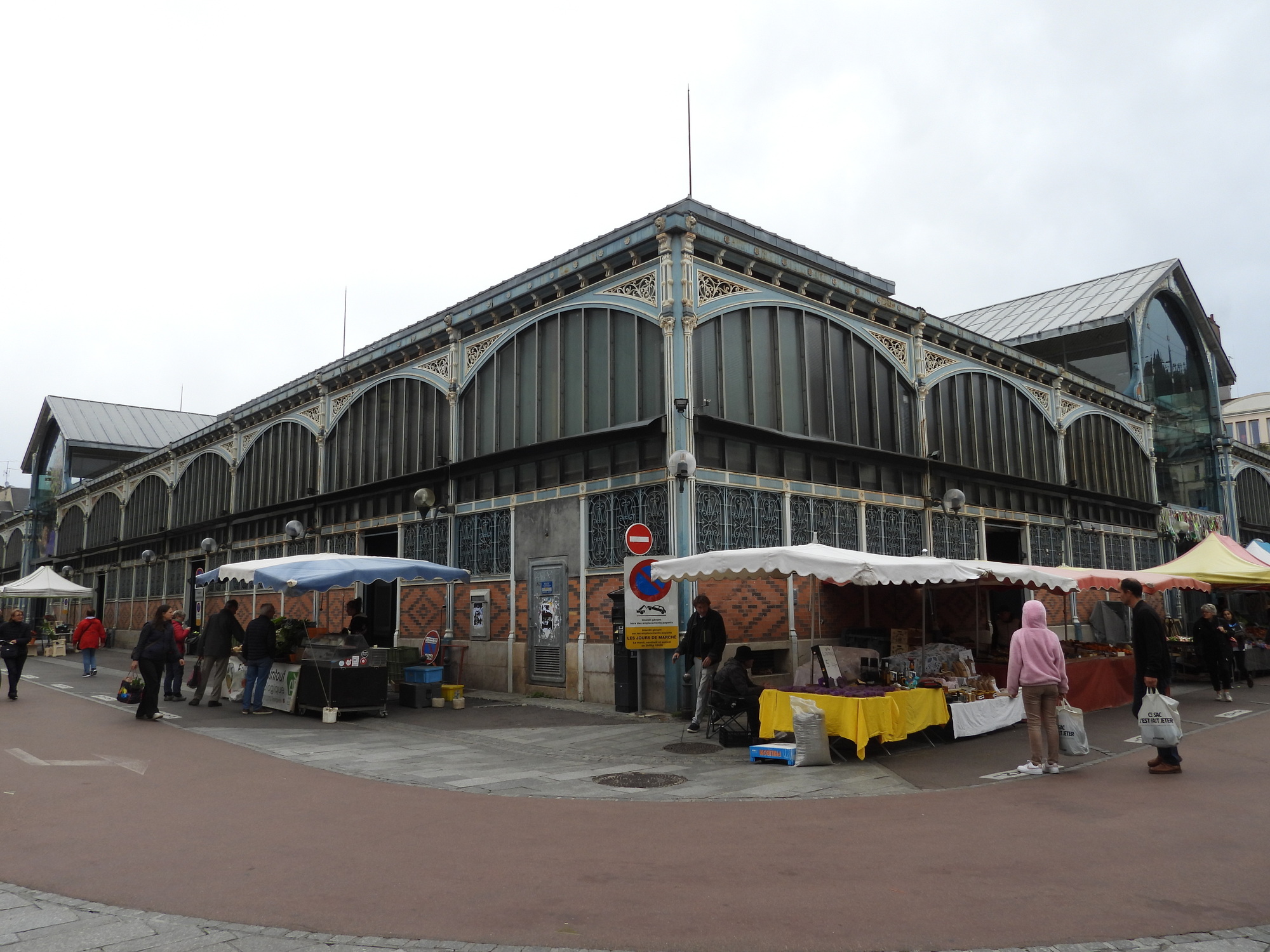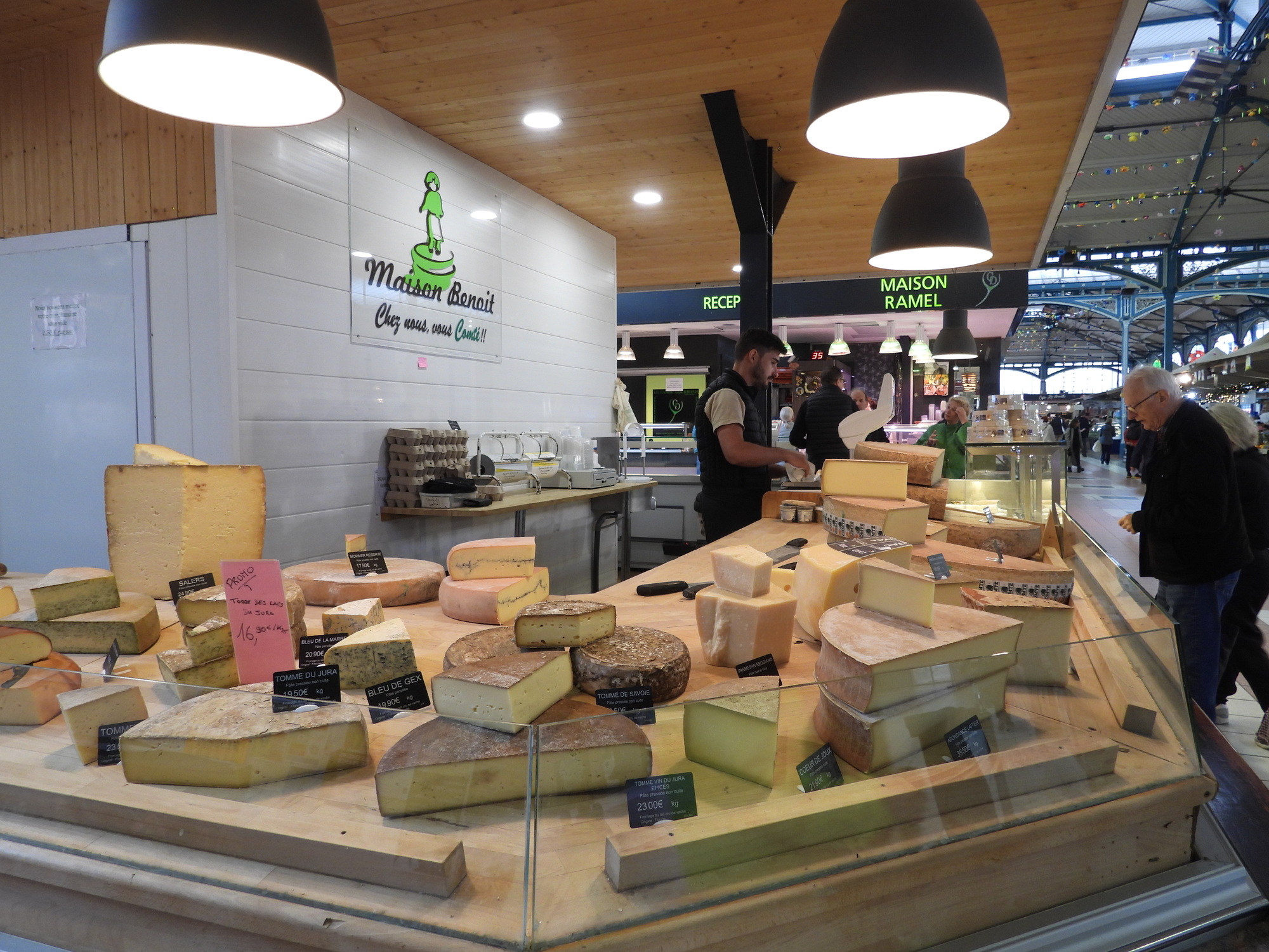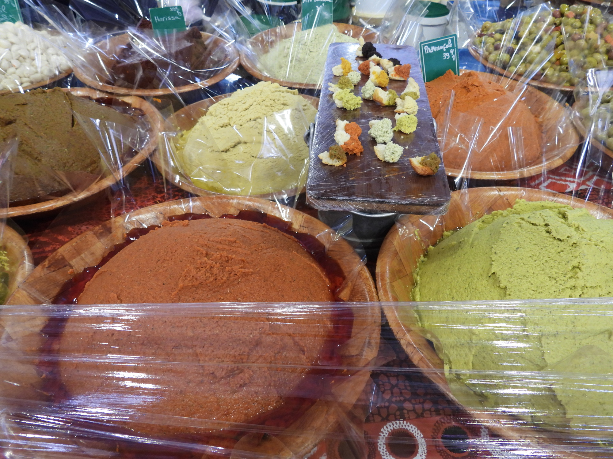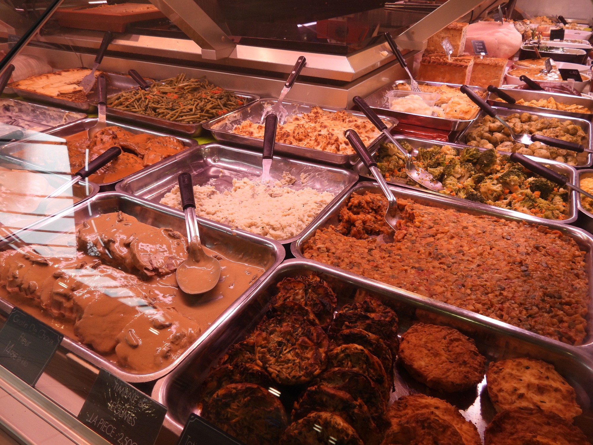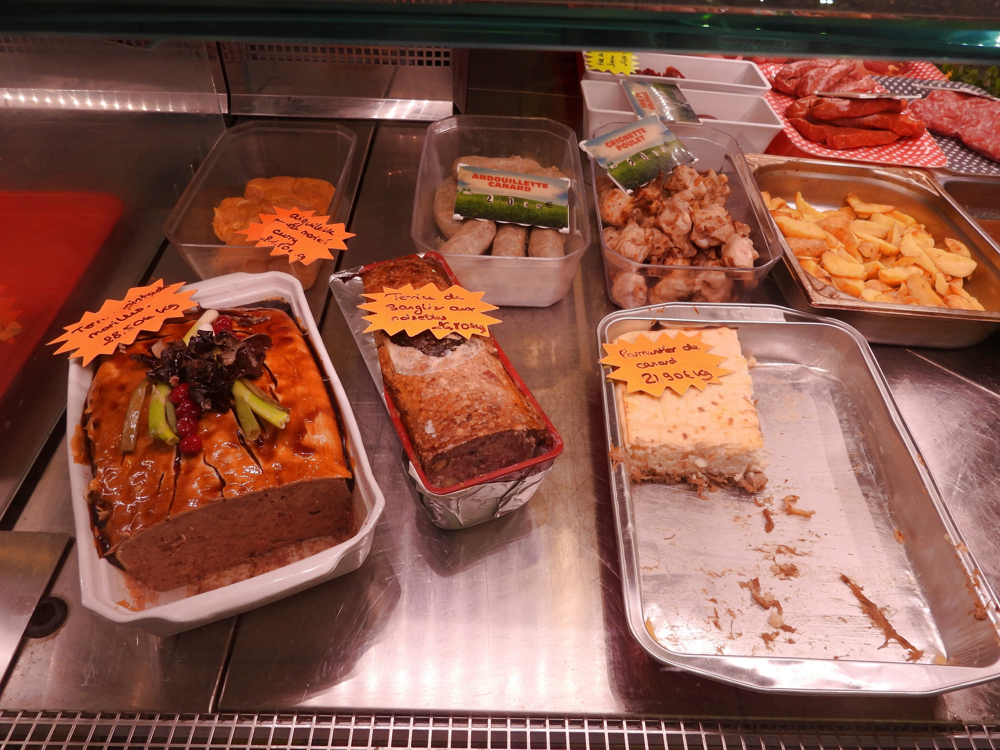 We were pleased to find that today is a full fledged market day at Dijon's indoor market hall. Often I just go wild, showing all the sea creatures, vegetables, baking, and the rest of the giant cornucopia that makes up a French market. This time I tried to be a little (very little) more selective, showing some things that are so darn French! In practice it's kind of useless distinction, between showing things that are fairly uniquely French and showing everything. Even a common orange, for example, at one of these markets is probably displayed in some artistic French way.