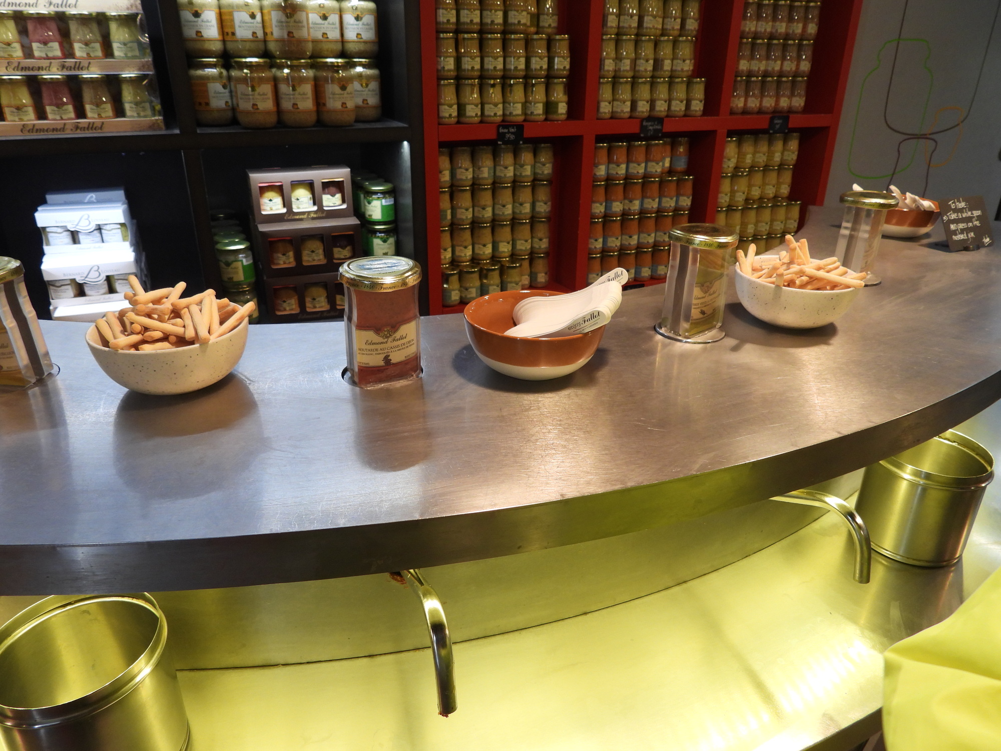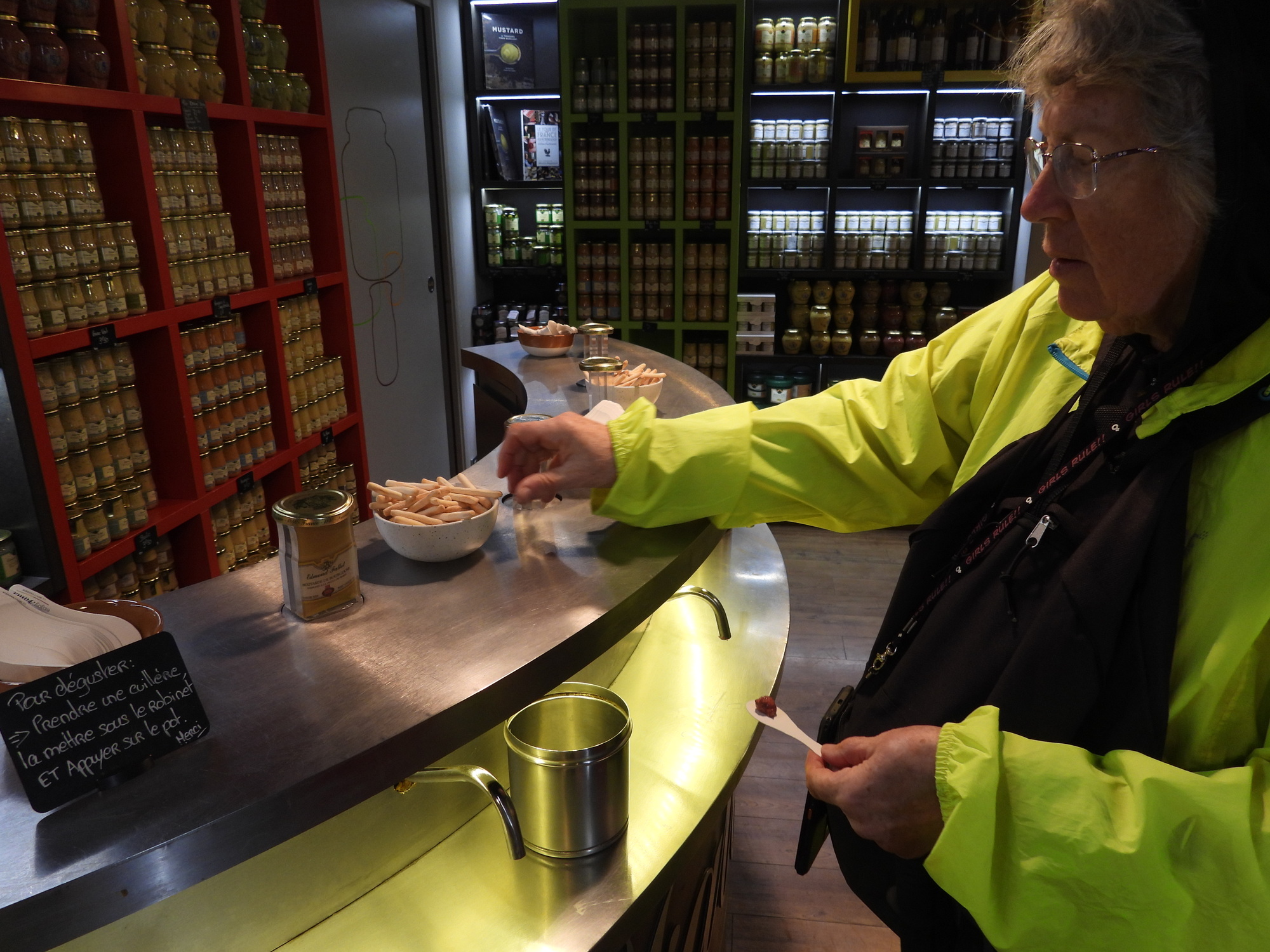 The system here is that you press on the mustard jar above, and the product comes out of the spigot below. You catch that on a little spoon. From that point my idea was to lick the spoon. But Dodie figured you should transfer the sample to the little breadstick. Maybe I have not learned too much yet from my work with Nutella packages.
