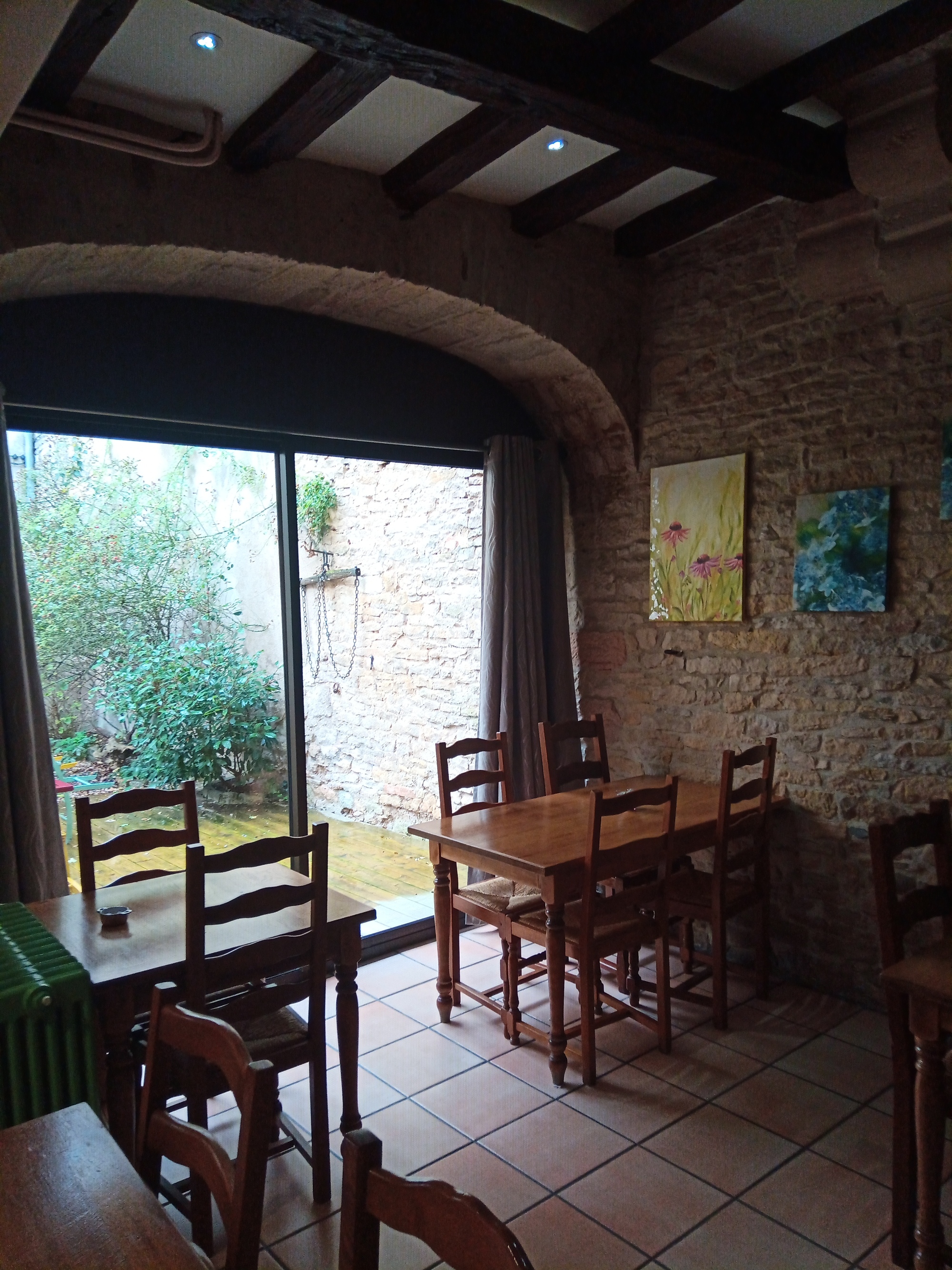 Our hotel does not look like much from an outside photo, but it has heavy beams and stone walls in spots. Part of its unassuming nature is probably that it started life as a barn. So where we sat to eat breakfast was formerly used by horses for the same purpose. I found out that this did not grant me a license for any free form table manners, to which I might normally be prone!
