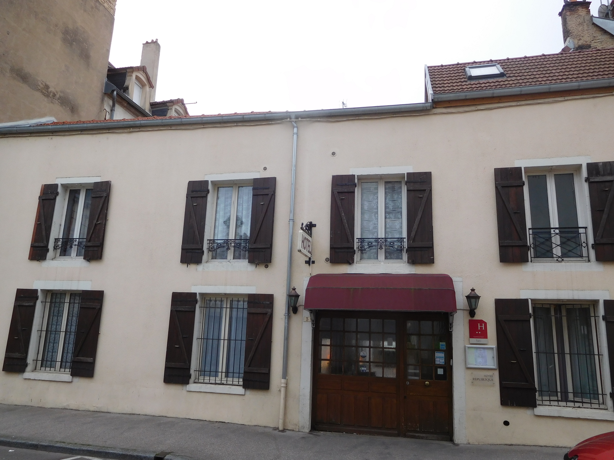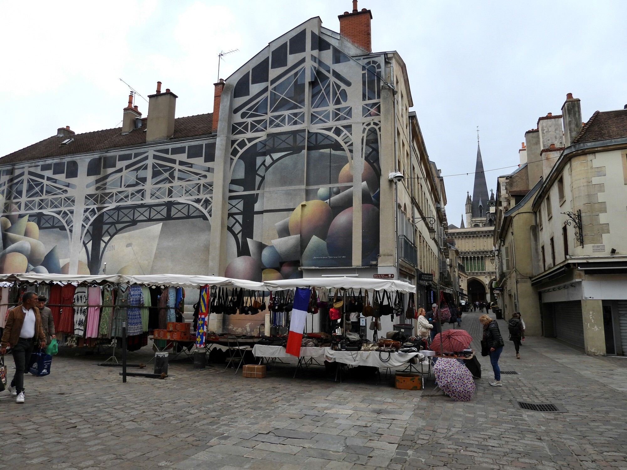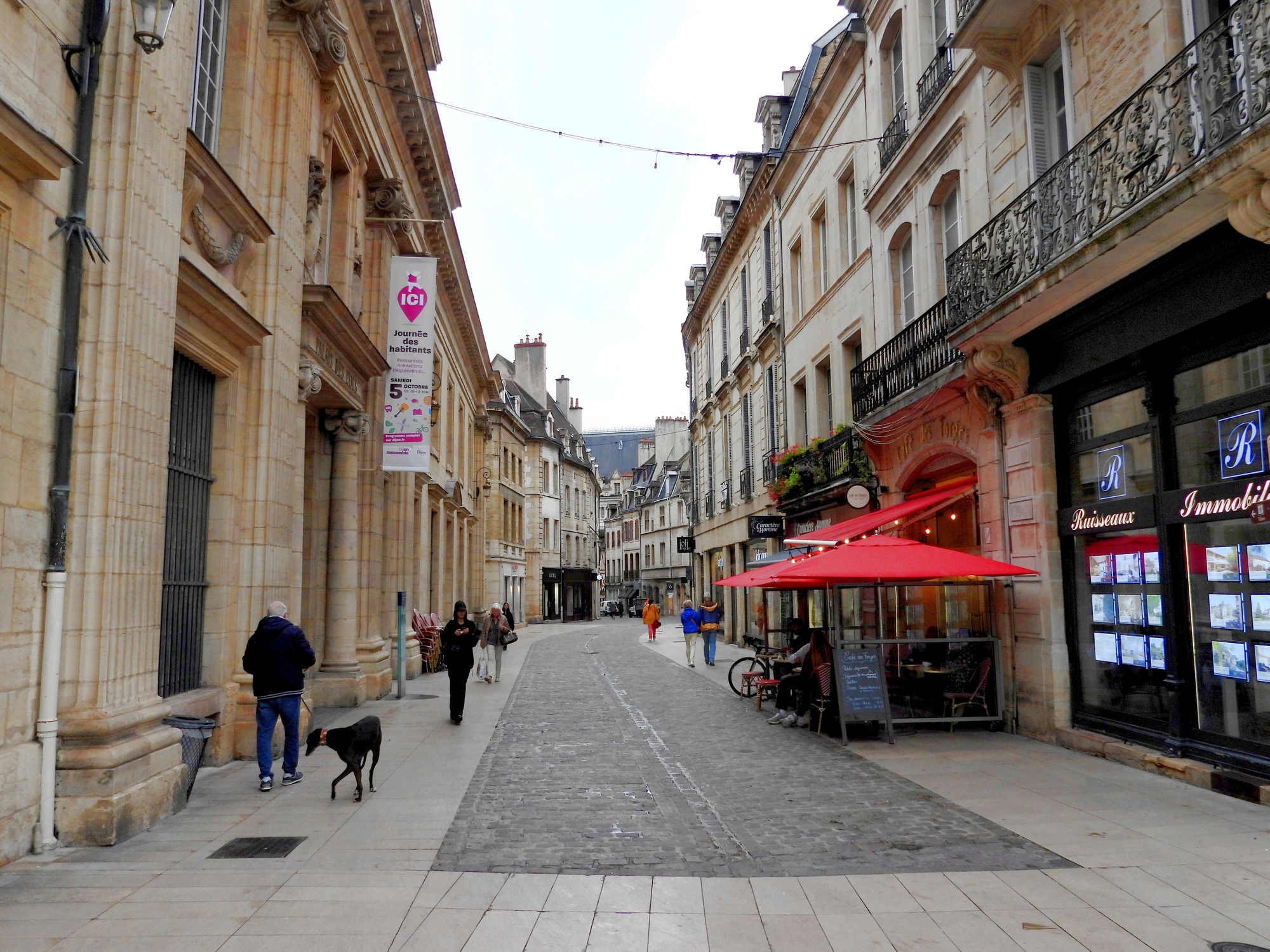 The little nasal drip that started yesterday advanced so that I was up in the night coughing. But my spirit is strong and we still went out, starting early, for our walk around Dijon. It also started to rain on our parade, but as I say, nothing can deter us from a planned tour. And, we were on a mission from the hotel lady to find a non defective kettle. When ours blew up her hotel yesterday, everything (like internet, lights, VISA connection) went down, except for one continuing warning beep. This morning I set my phone for 4 1/2 minutes of boiled egg timing. As it happens the time's up beep from the phone is the same as the beep that went off yesterday. This had the (possibly a little skittish) hotel lady climbing the walls, and then recounting the whole dramatic tale to the other clients sitting about. So yeah, let's find a kettle.