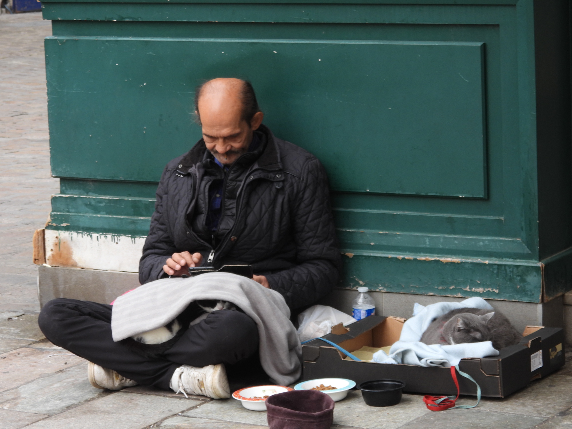 Some other loose ends to tie up. Remember the beggar guy at the cathedral, with the smartphone? Here is another one. Except that he is admirably increasing his life satisfaction with a cat. The other guy just had cigarettes. But hey, I hope that is not a Galaxy Fold 6 he's wielding!