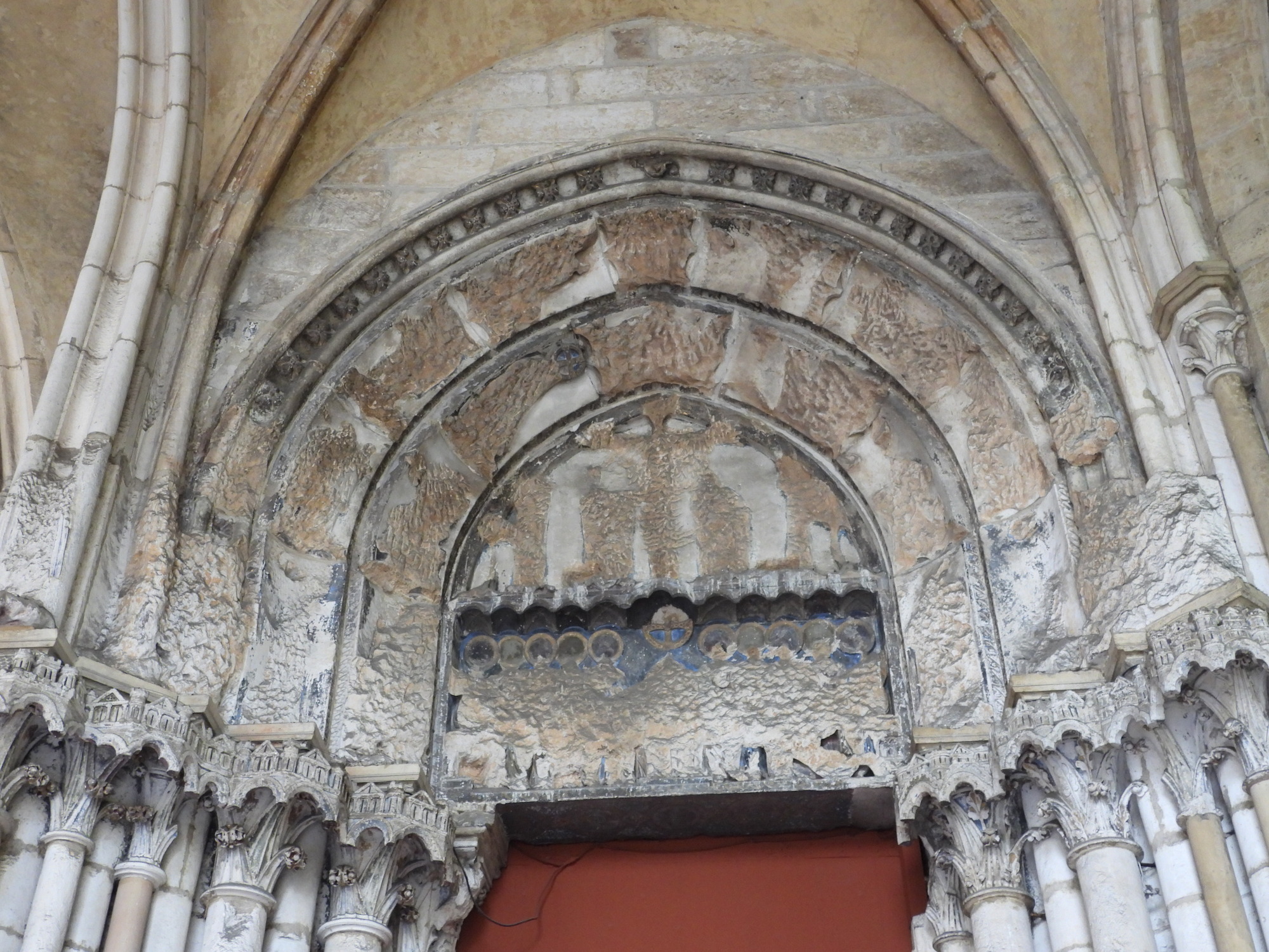 "On a red background, in the center, sits the Virgin Mary. The latter, immense and full of compassion, protects the people of Dijon gathered inside the ramparts. On each side, about twenty animals threaten: notably an owl (symbol of sin), a wolf (figure of the Devil), a fox (deceitful and lying animal) or even a crow whose darkness says it all… These beasts embody the forces of evil that lie in wait at the gates of Dijon. A composition that clashes with the representations usually found in places of worship. "