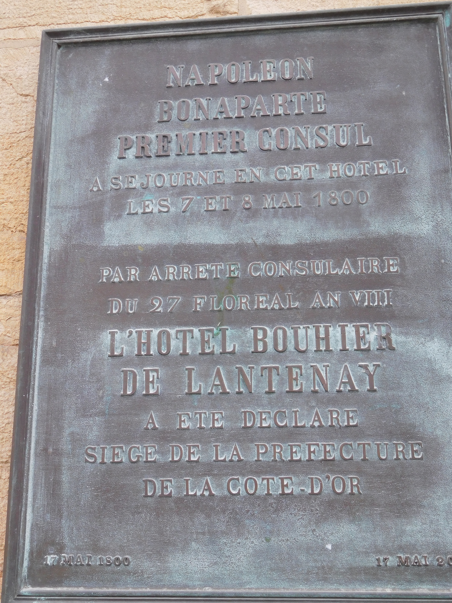 Just randomly, we walked by a building that at some point had been declared the seat of the Prefecture of the Cote D'Or -not that we know what a Prefecture actually is. But we did note that, as we have mentioned before, the French are big on glorifying "Napoleon slept (or fought, or passed) here" places. So in May 1800 Napoleon for some reason stopped in here. That warranted, in 2008, putting up a brass plaque commemorating the event. Ok, I guess!
