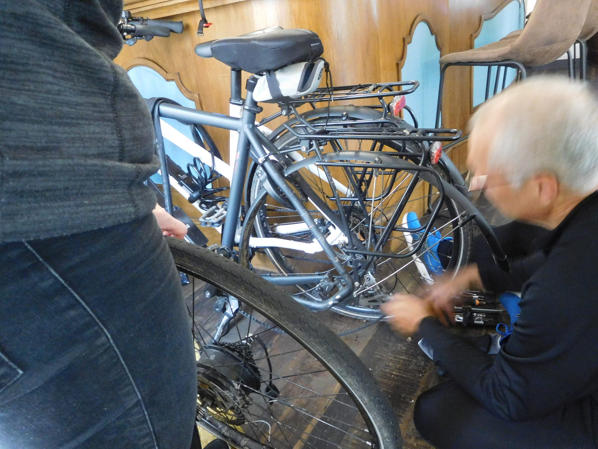 By morning, I still didn't know. We went down to the room where the bikes were. There we found some temporary distraction from a Danish cycling couple. They had gotten a flat and fixed it temporarily with Slime. They decided to use the nice room to make a permanent repair, but seemingly had broken the derailleur hanger while pulling the wheel. It seemed like the hanger fixing bolt had snapped, and the man was trying to substitute a zip strap. I was sure he had no hope. My thoughts were just toward how to get the wheel back on somehow, to then roll the bike to a shop. I'm not sure what the man's thoughts were, because he kept trying, and of course our Danish is rather weak!