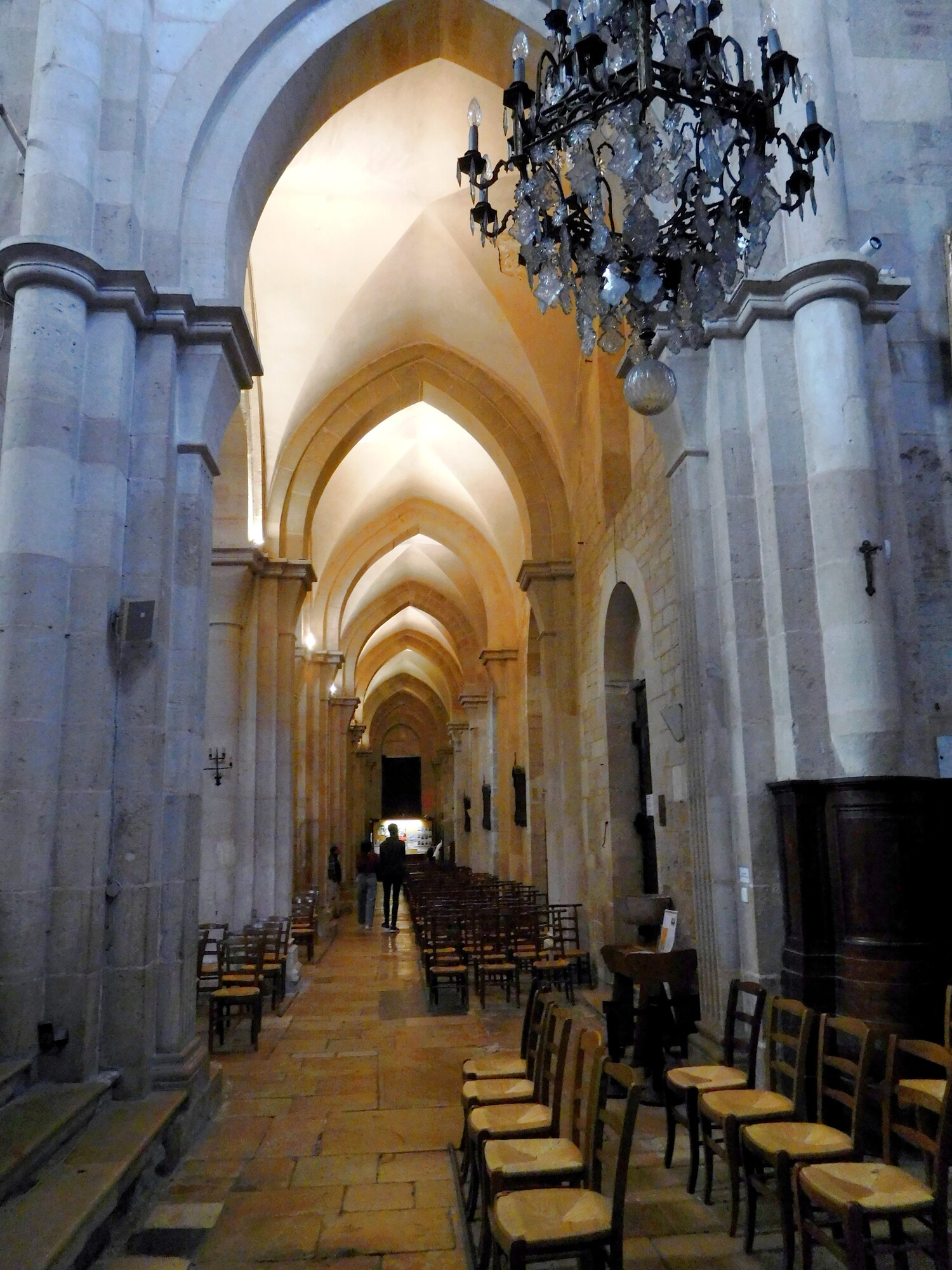 Turning to our own problem, I was really buoyed to see that I could press downward with a goodly amount of force. That's needed to get up on the bike. And it seemed like I could hold the bar too. So assuming I could demonstrate mounting the bike and riding off, we had a chance of reaching Tournus, admittedly 76 km distant. We took the bikes out to the (smooth tile) courtyard in front of the church, and I rode 30 feet, declaring victory! We were confident enough from this amazing demo, that we started to push the bikes in the old town, for a quick look before setting off.