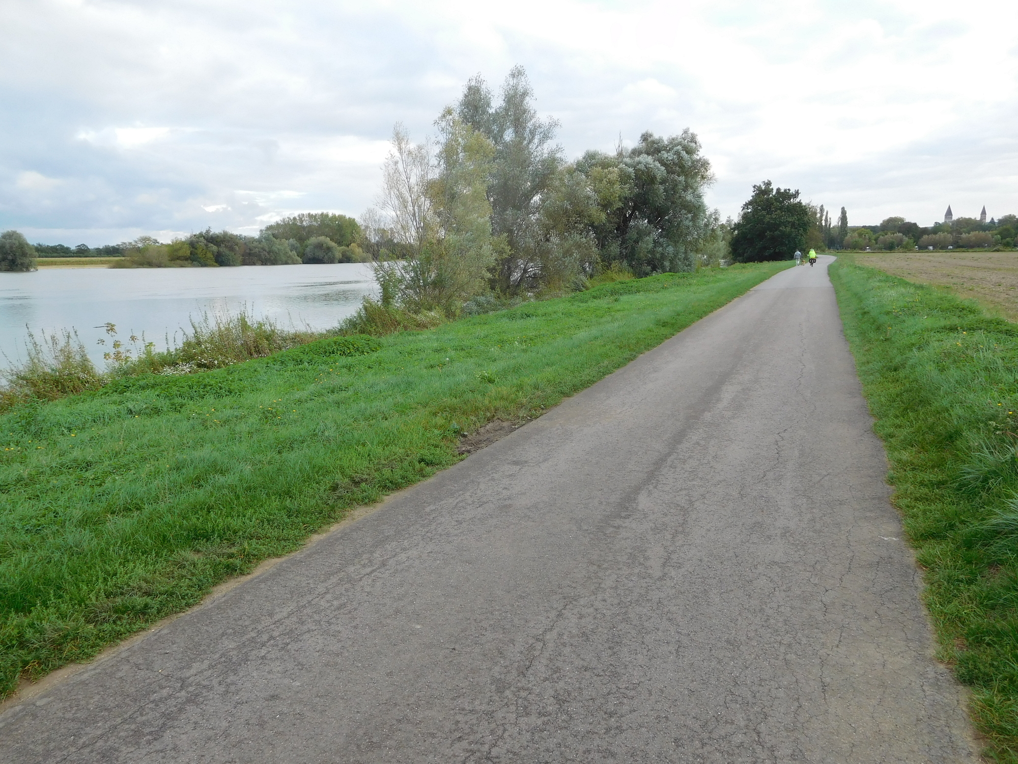 Ultimately, near Le Port we joined the famous Voie Bleu that runs along the Saone. This was a nice path, but without a lot of points of interest. Temperature had been changing up and down during the ride, causing us to put different pieces of clothing on and off. This was a bit of a trial, because I could not generally do it on my own. Dodie would help, but she also tried to guide me on how to get the most done alone. For example, with a jacket, you have to face it towards you and then put your bad arm (in my case the right) into the armhole on the left facing you, and so forth. I am not so great at this even when uninjured!